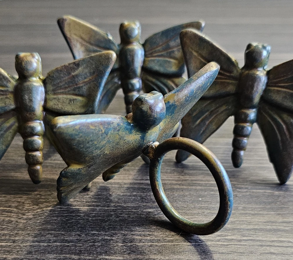 You'll love this unique set of 4 butterfly napkin rings. Super sturdy. Oxidation on metal makes their look even better! 2" tall. 3" wide. Weight 8oz.