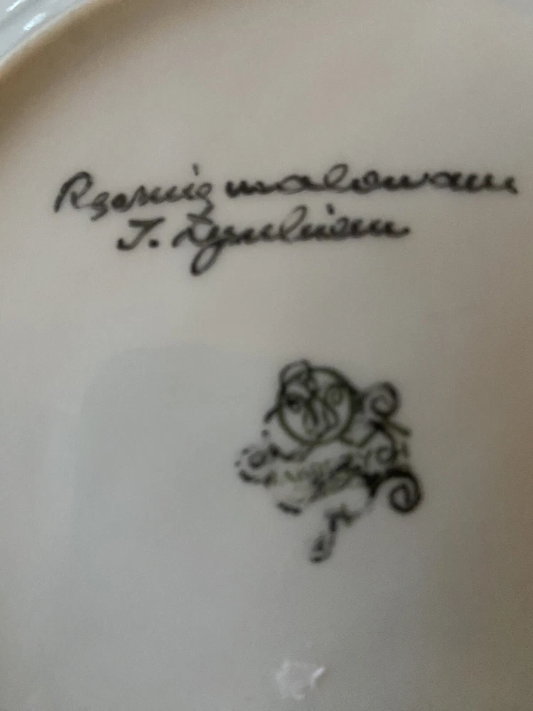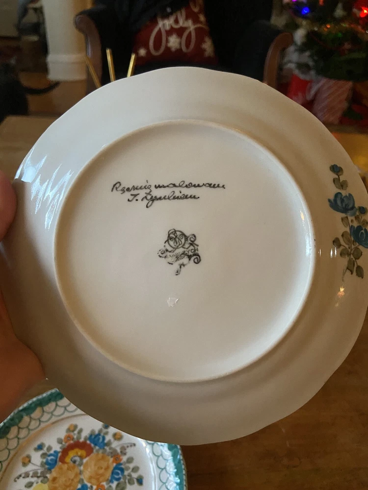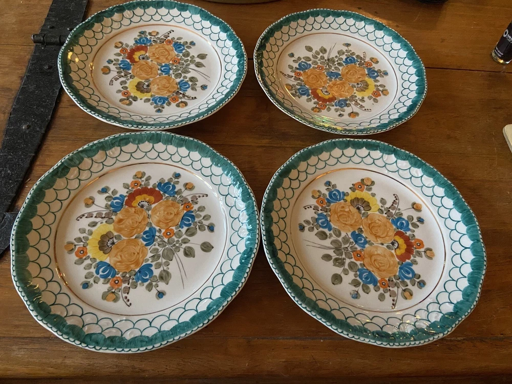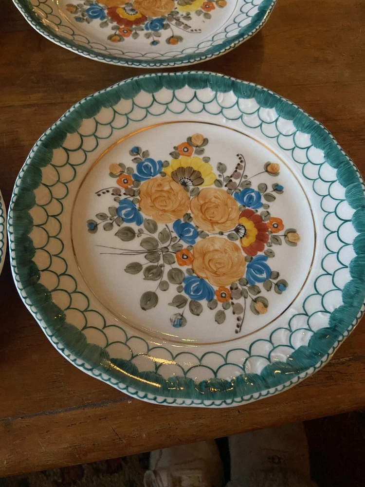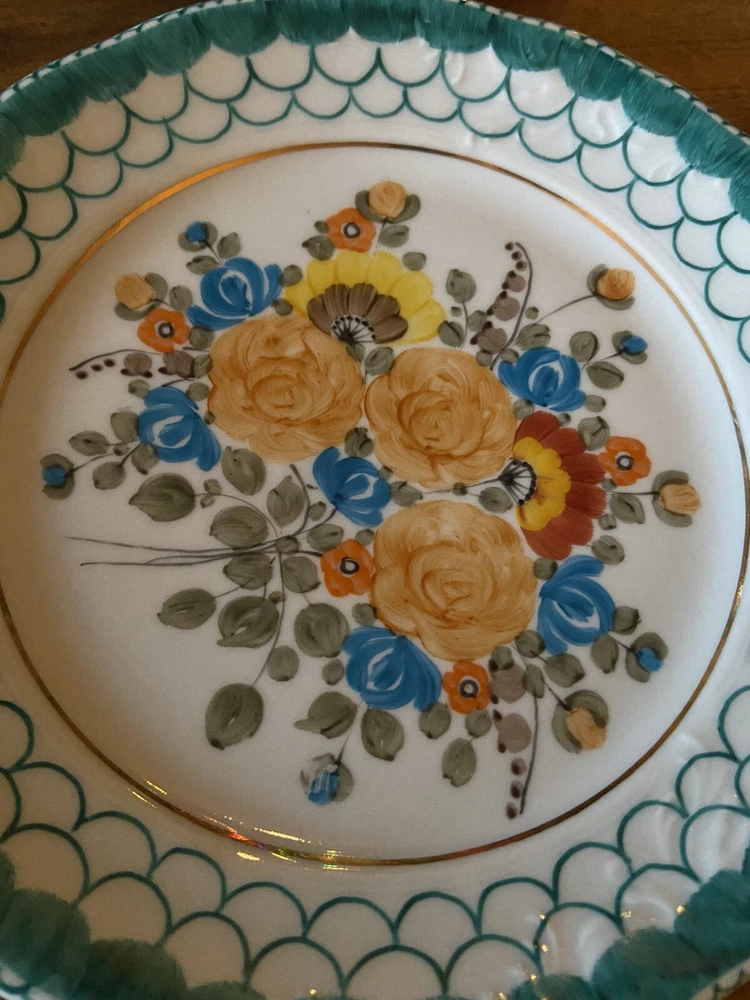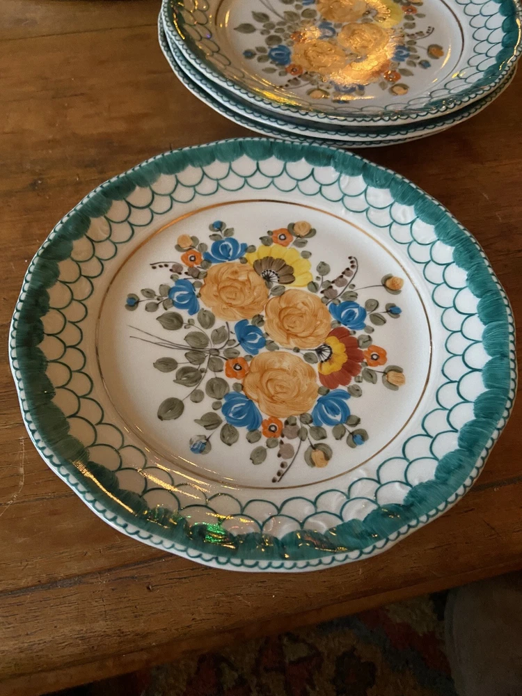 Set of 4 Polish Porcelain 7.5 inches wide Salad Plates. Turquoise Blue & white with multicolored Flowers in center