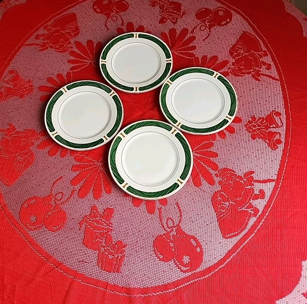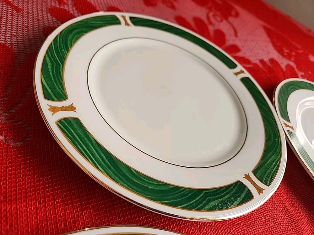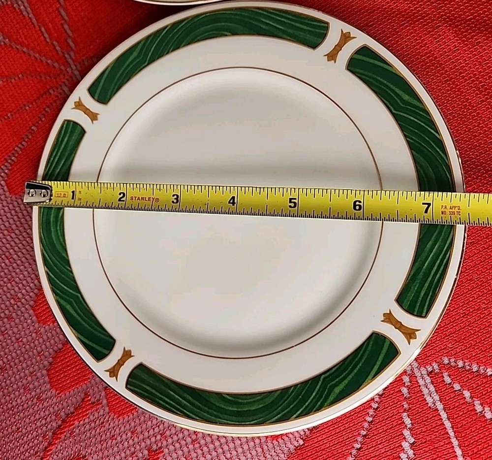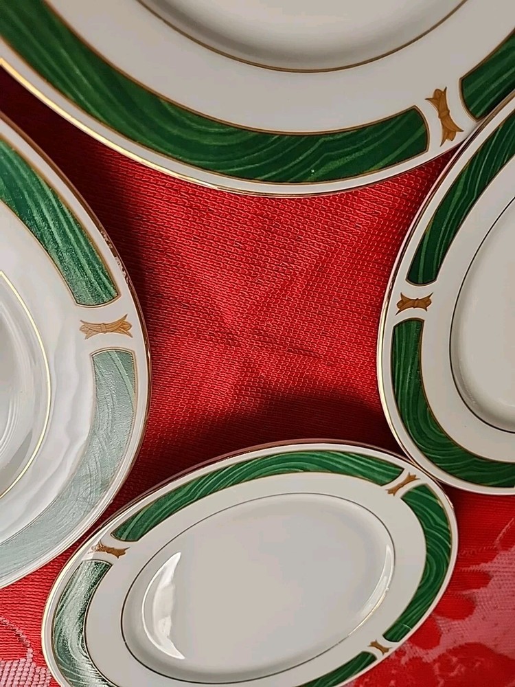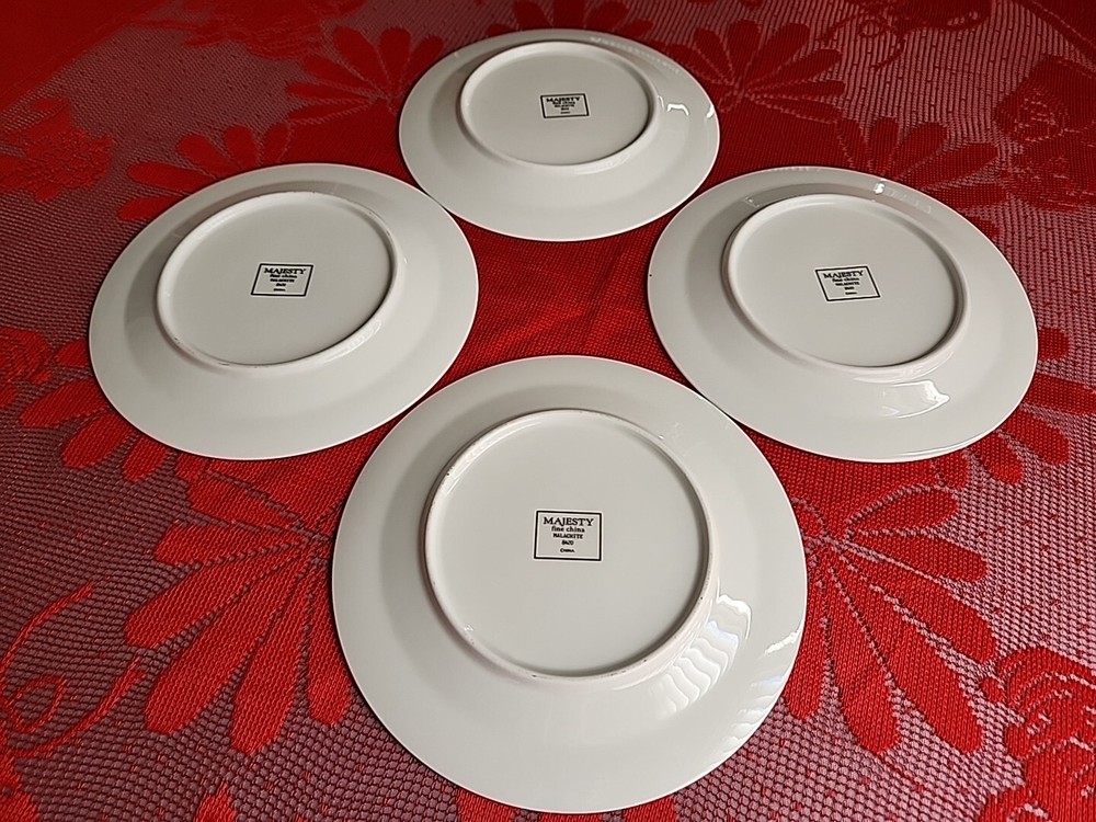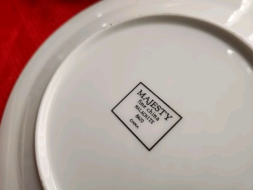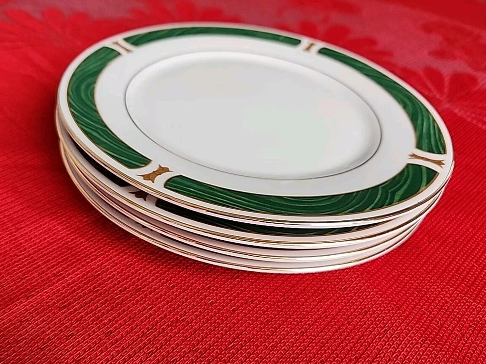 The product is a set of four Sango Majesty Malachite salad plates made of fine china. The plates have a marble look and are decorated with a Malachite pattern. They are round in shape and have a glossy finish. They are suitable for all occasions. The plates are an original product and were made in China. Please examine photos closely to determine the condition of this set. Thank you for looking and God bless you.