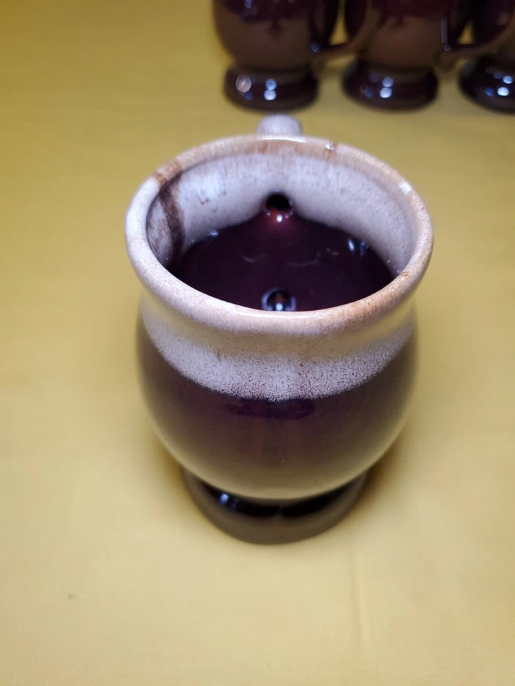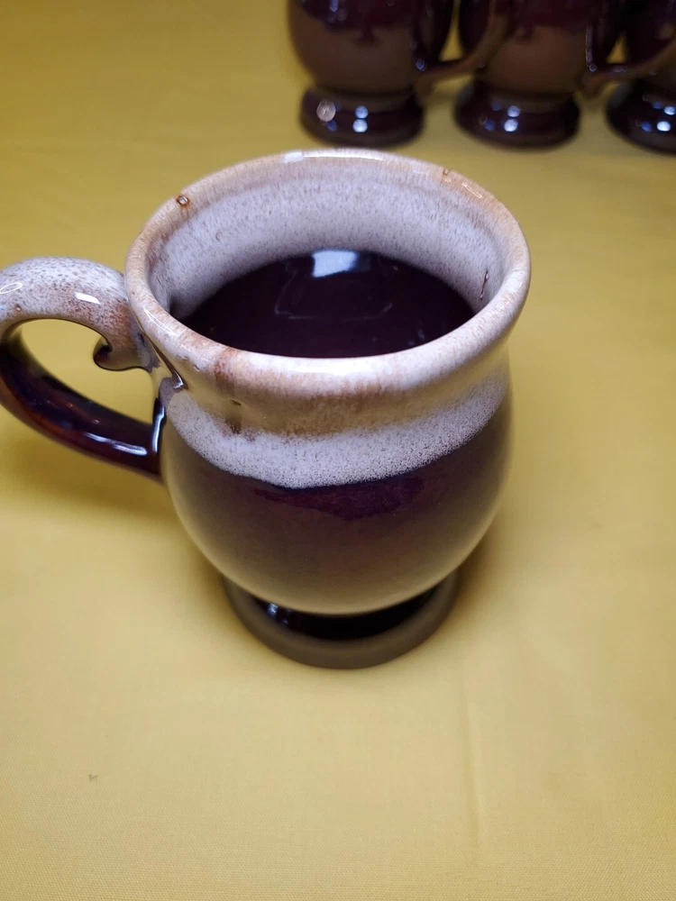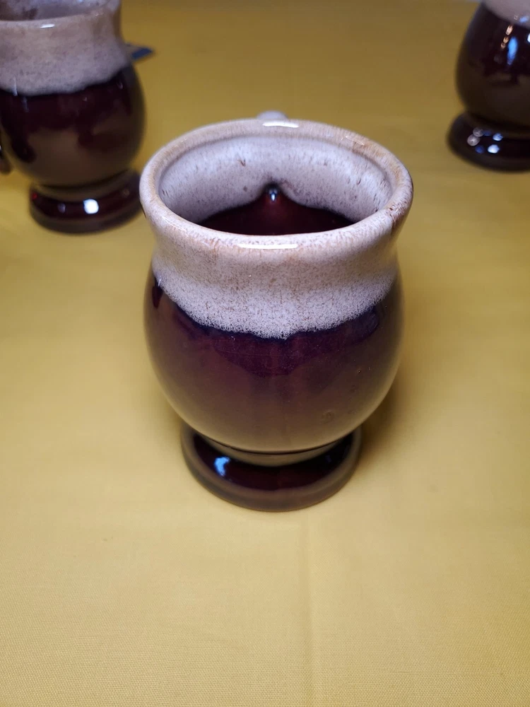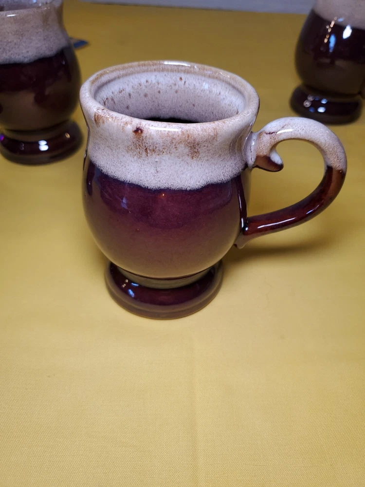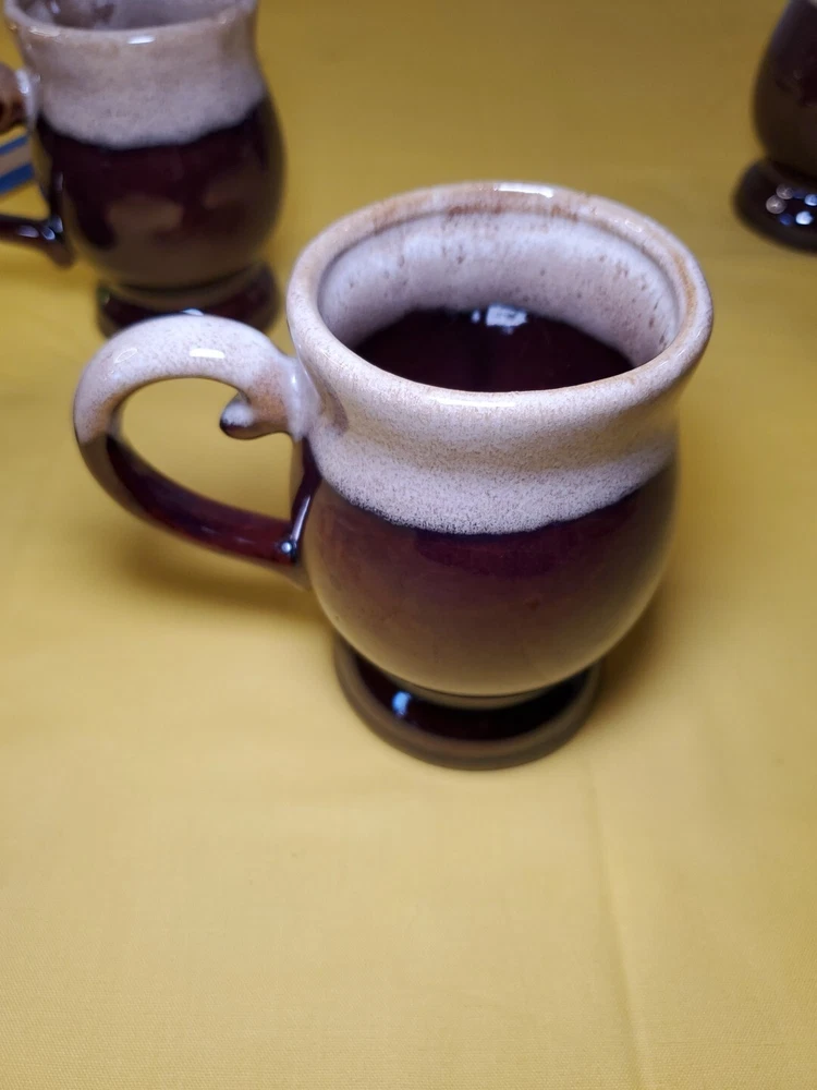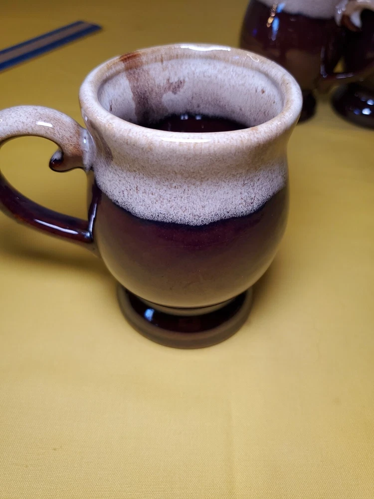 THANK YOU FOR VISITING OUR STORE. WE SHIP 6 DAYS A WEEK (UNLESS THERE IS A FEDERAL HOLIDAY). MOST ITEMS WILL SHIP IN A STURDY BOX AS NEEDED. PLEASE FEEL FREE TO REACH OUT IF YOU HAVE ANY QUESTIONS. WE WILL COMBINE SHIPPING WHEN AVAILABLE. This set of 4 vintage brown drip glaze coffee mugs is the perfect addition to any coffee lover's collection. Made in TAIWAN in the 1960s, these medium-sized stoneware mugs feature a figural design and a 4oz capacity, making them ideal for hot beverages like coffee and hot chocolate. The mugs have a charming cottagecore theme and are handmade with care instructions to hand wash only. The 2.5" item width and 4" item height, along with the handle, make them easy to hold and enjoy your drink. This original set of coffee cups is a great choice for all occasions and conventions/events.