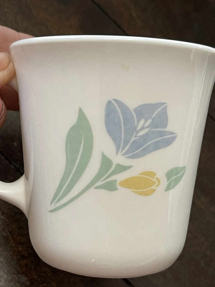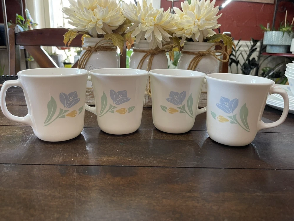 IN BRAND NEW CONDITION This set of four vintage Corelle Corning Ware Friendship coffee cups or mugs is a beautiful addition to any kitchen. Featuring a blue floral pattern on round glass material, these mugs are perfect for any occasion, especially for sharing a cup of tea with friends. Crafted in the 1980s, these mugs have a vintage charm and are a great find for collectors. The brand, Corelle, is well-known for its quality products, and these mugs are no exception. Whether you are a fan of vintage items or simply looking for a unique addition to your kitchen, these mugs are sure to impress.