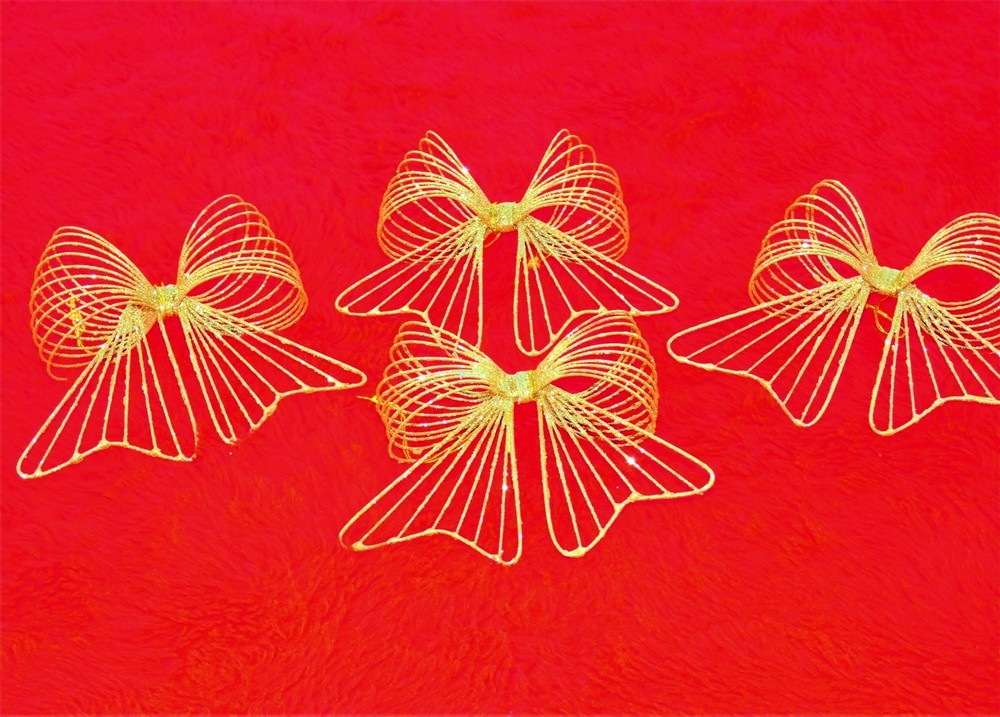 Vintage Bows Christmas Ornaments Set Of 4 Color: Gold Tone Embellished with Gold Glittered Material: Metal Measures: 4 to 4 1/2 inches Tall 5 1/2 inches wide Has Gold string hangers for easy hanging Very elegant and fancy looking on any tree In very good condition Please see Photos for more description COMES FROM A SMOKE FREE HOME Any questions please feel free to ask me Thanks for looking! COME AND SEE MY other items Powered by SixBit's eCommerce Solution