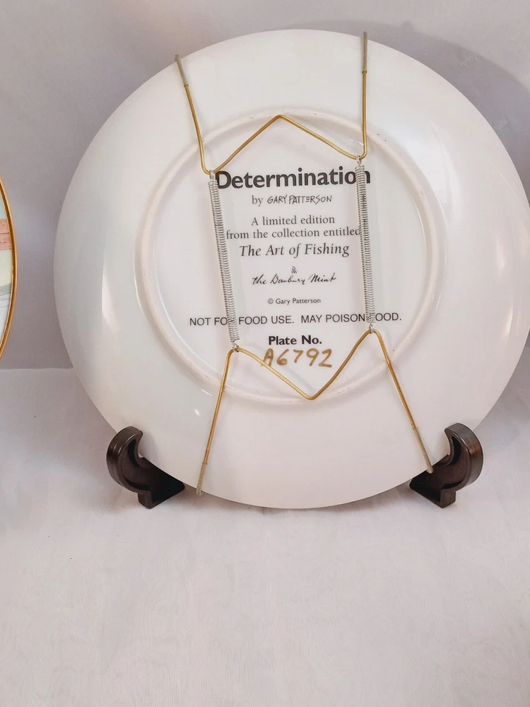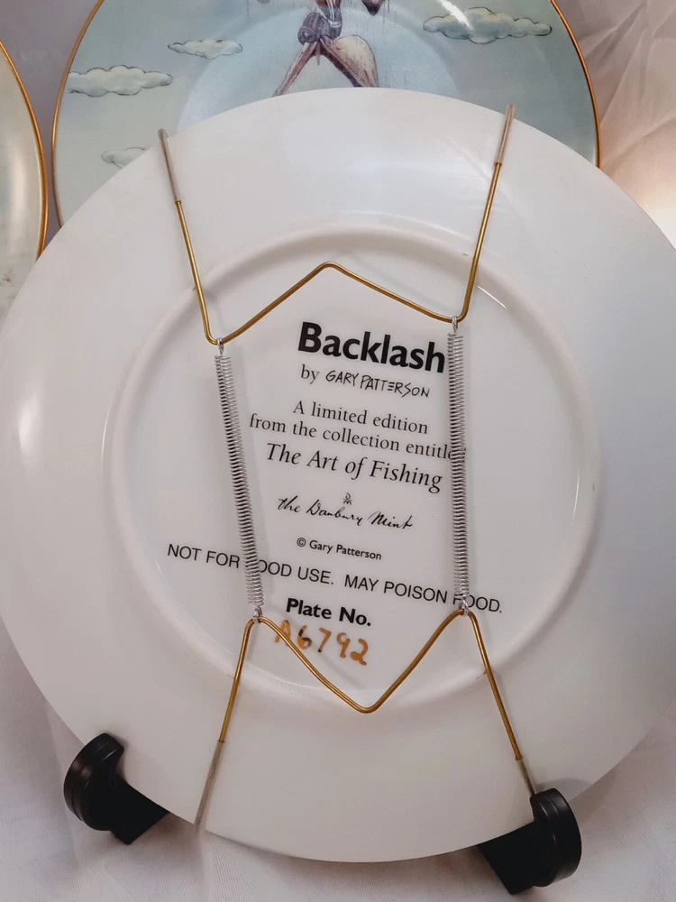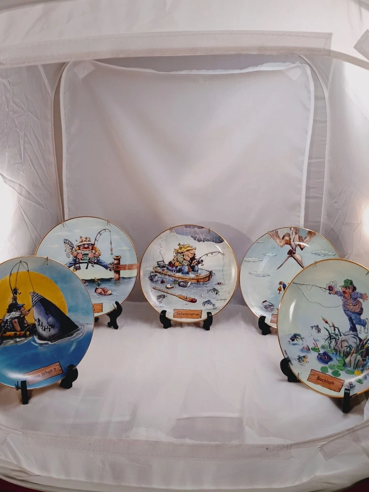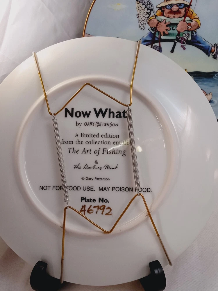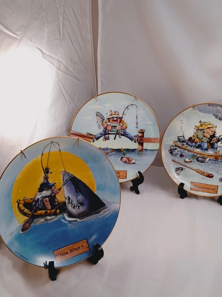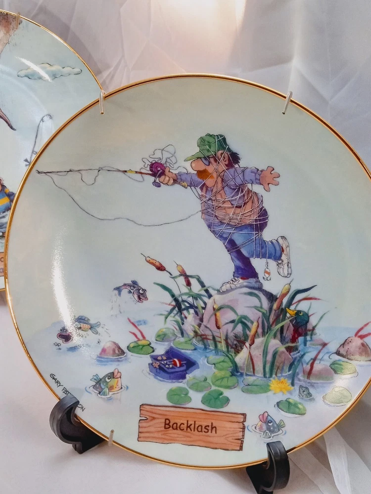 The product is a set of 5 collector plates from "The Art of Fishing" series by Gary Patterson. Each plate is 8 inches in diameter, made of porcelain, and features a cartoon fisherman theme. The plates are multicolored and decorative, showcasing a round shape. They are part of the Danbury Mint brand and are numbered as part of a limited collection.