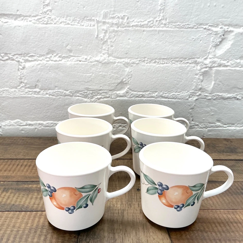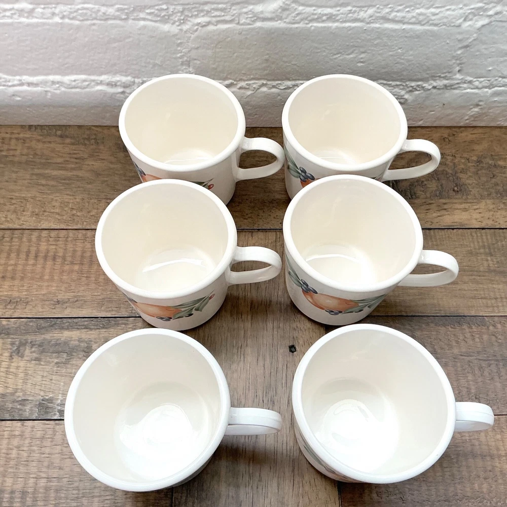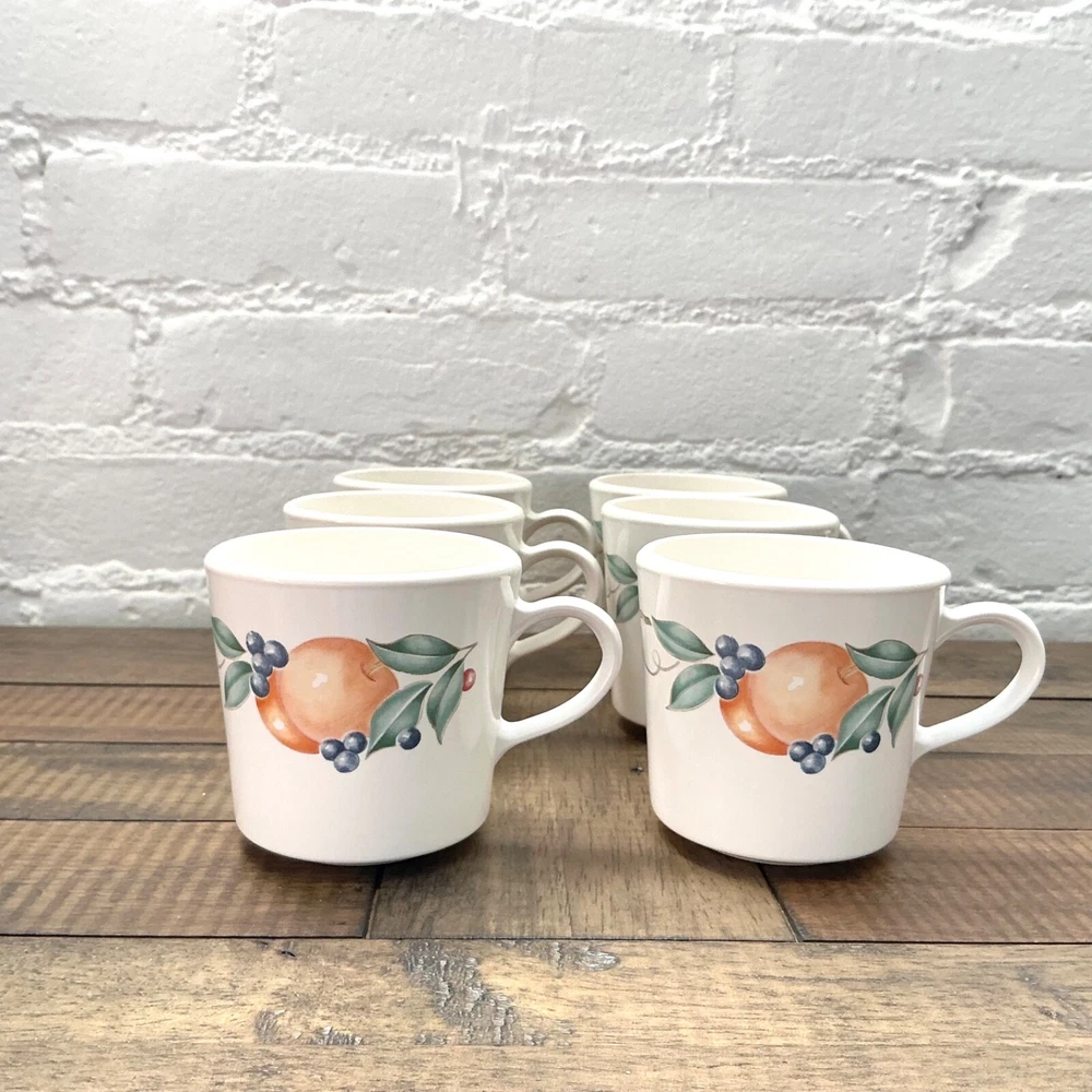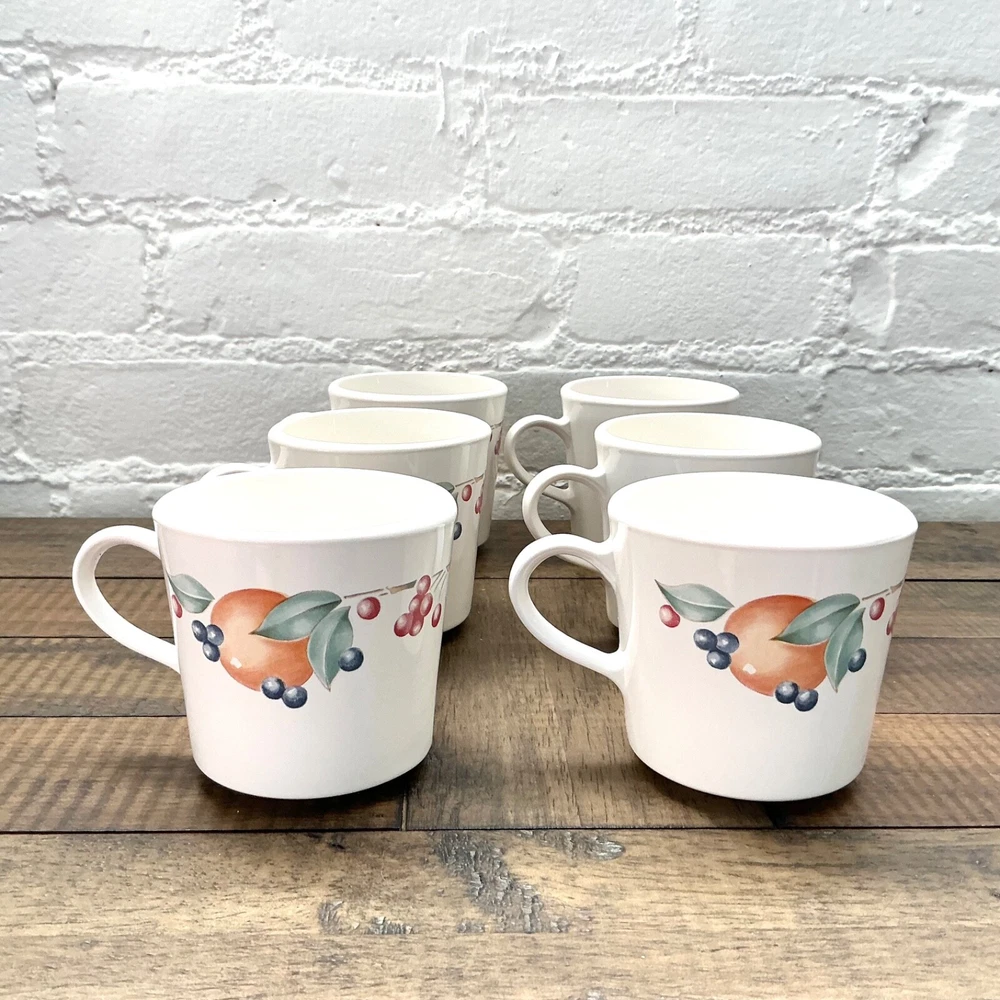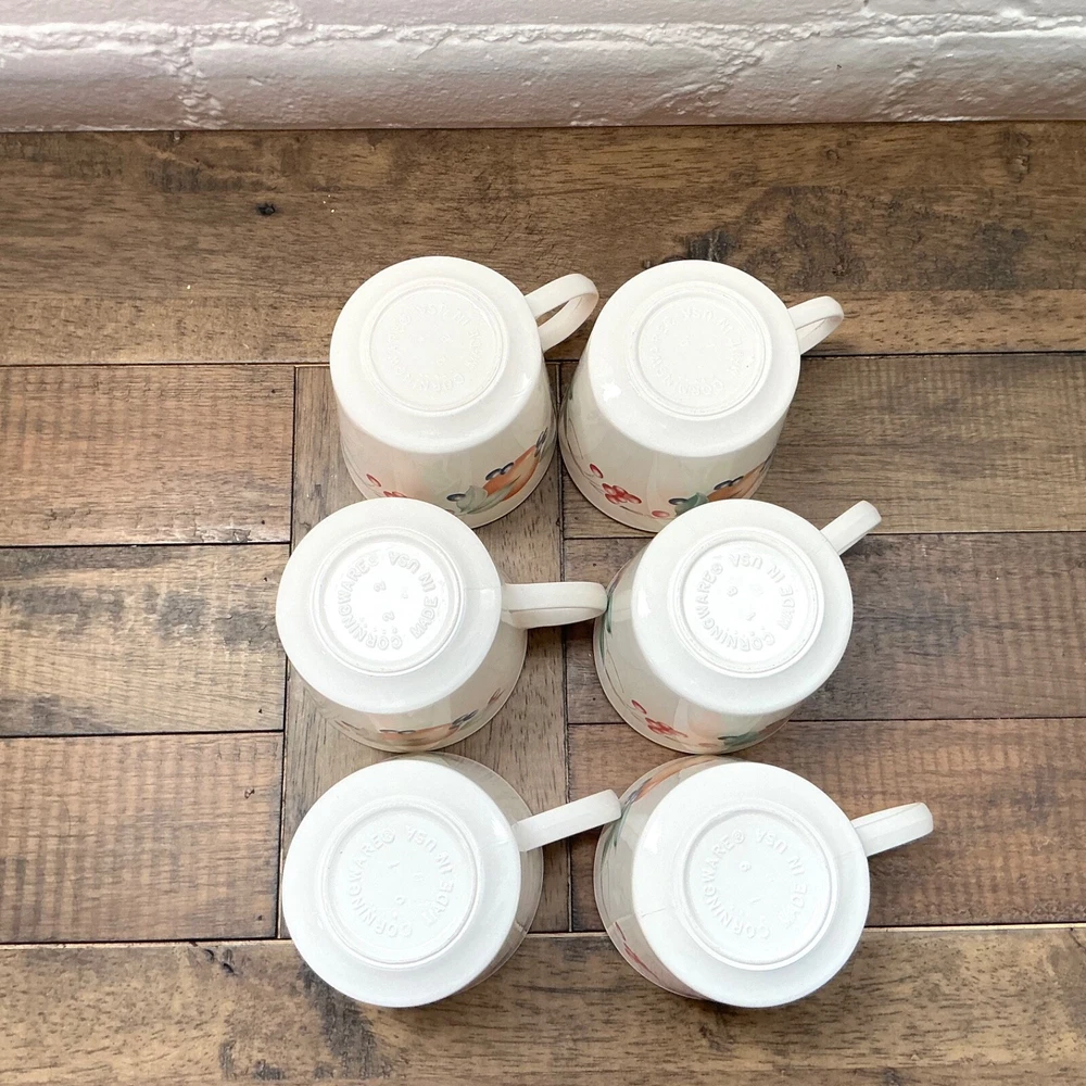 This is the Abundance Fruit pattern Corning Ware Corelle Coffee Tea Cups that are perfect for everyday use. This beautiful pattern is retro/vintage and are also a great display. Set of 6 3” diameter 6oz Made in USA The white is closer to ivory Great vintage condition. No chips, cracks or repairs. From a pet and smoke free home