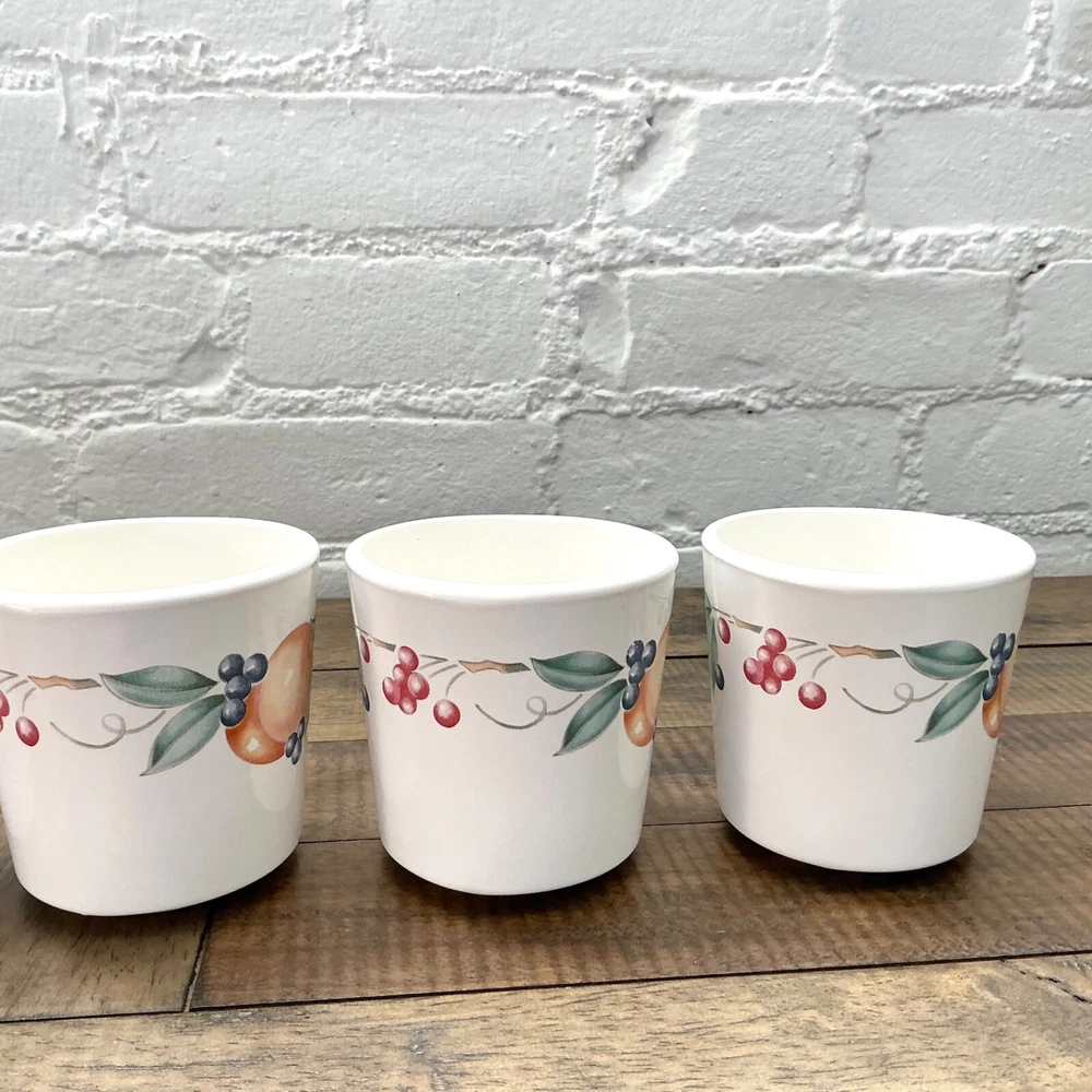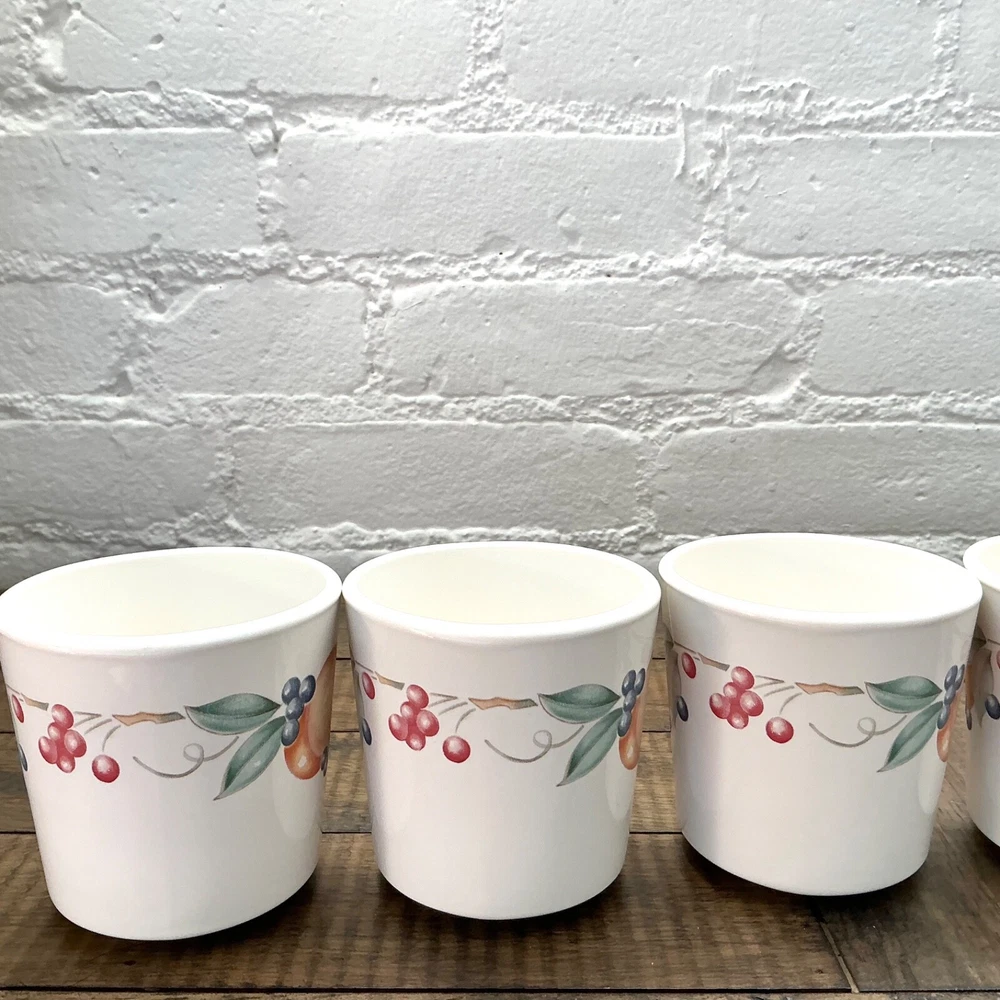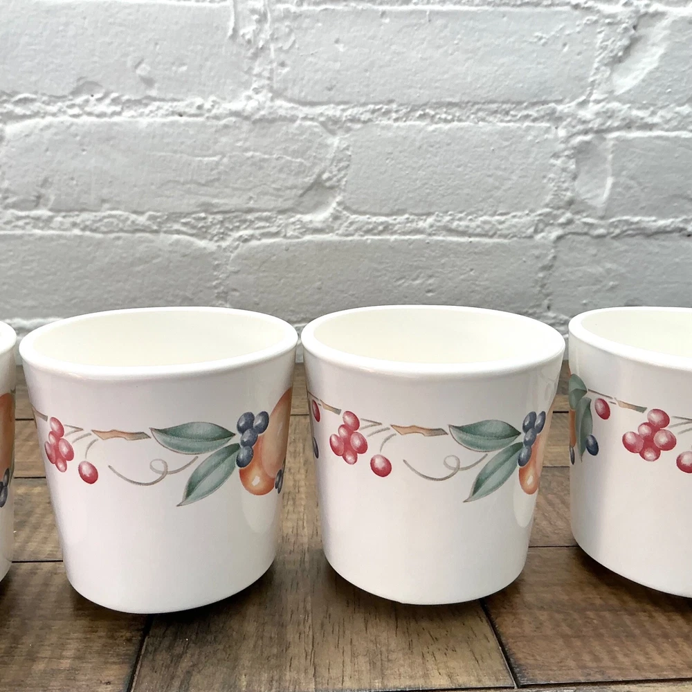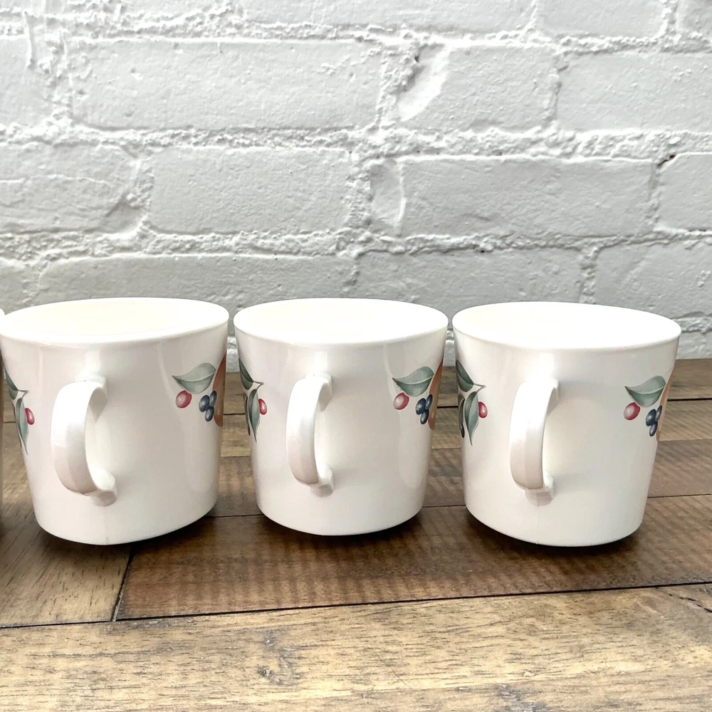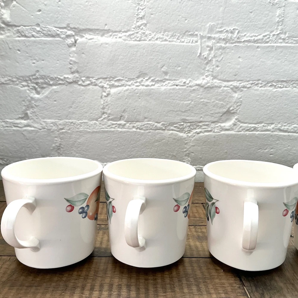 This is the Abundance Fruit pattern Corning Ware Corelle Coffee Tea Cups that are perfect for everyday use. This beautiful pattern is retro/vintage and are also a great display. Set of 6 3” diameter 6oz Made in USA The white is closer to ivory Great vintage condition. No chips, cracks or repairs. From a pet and smoke free home