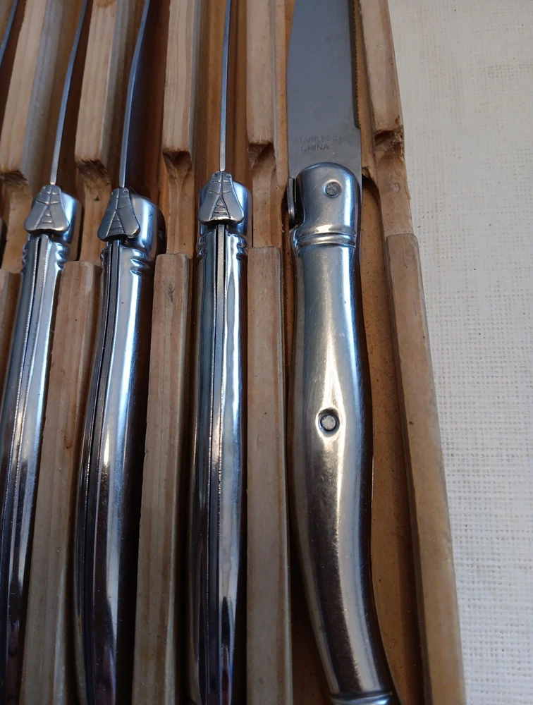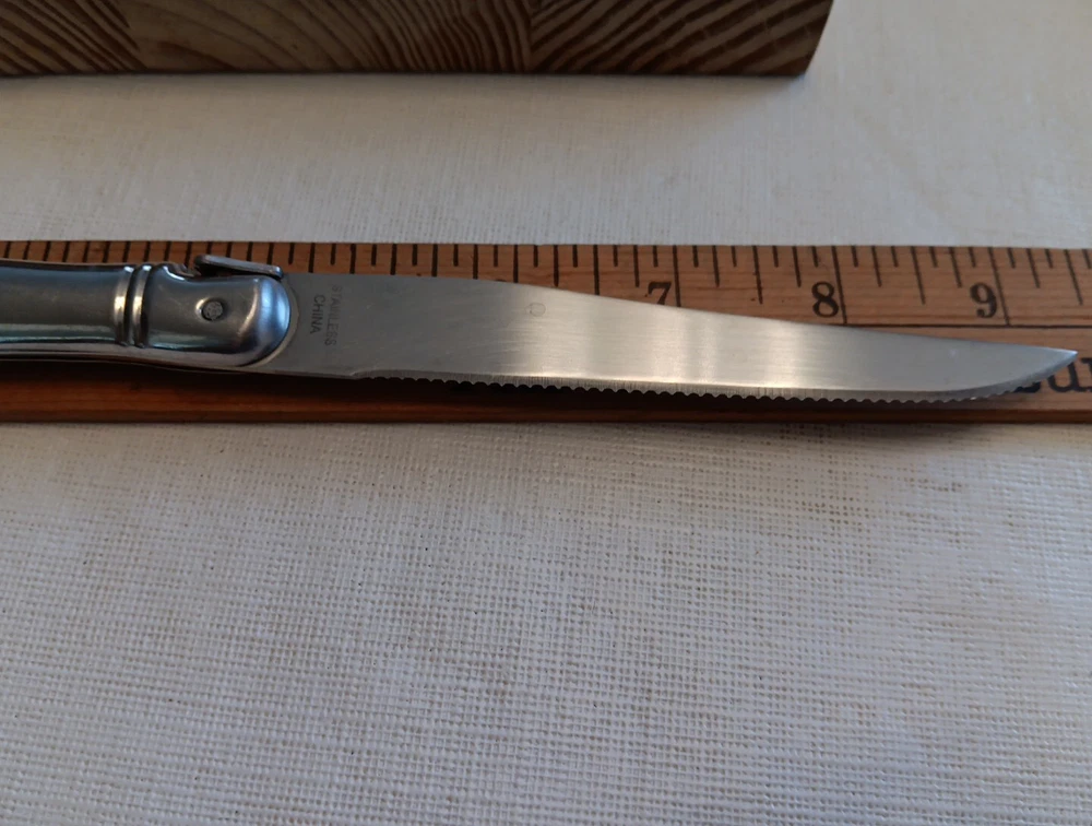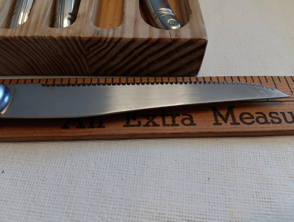 This set of 8 stainless steel steak knives features a serrated blade with a length of 4.5 inches, ideal for effortlessly cutting through meat. The knives have handles adorned with a bee design, adding a touch of elegance to your dining table. Made from high-quality stainless steel, these knives are durable and reliable for everyday use. Perfect for steak lovers or anyone who enjoys a well-crafted cutlery set, this product is a stylish and functional addition to any kitchen or dining room.