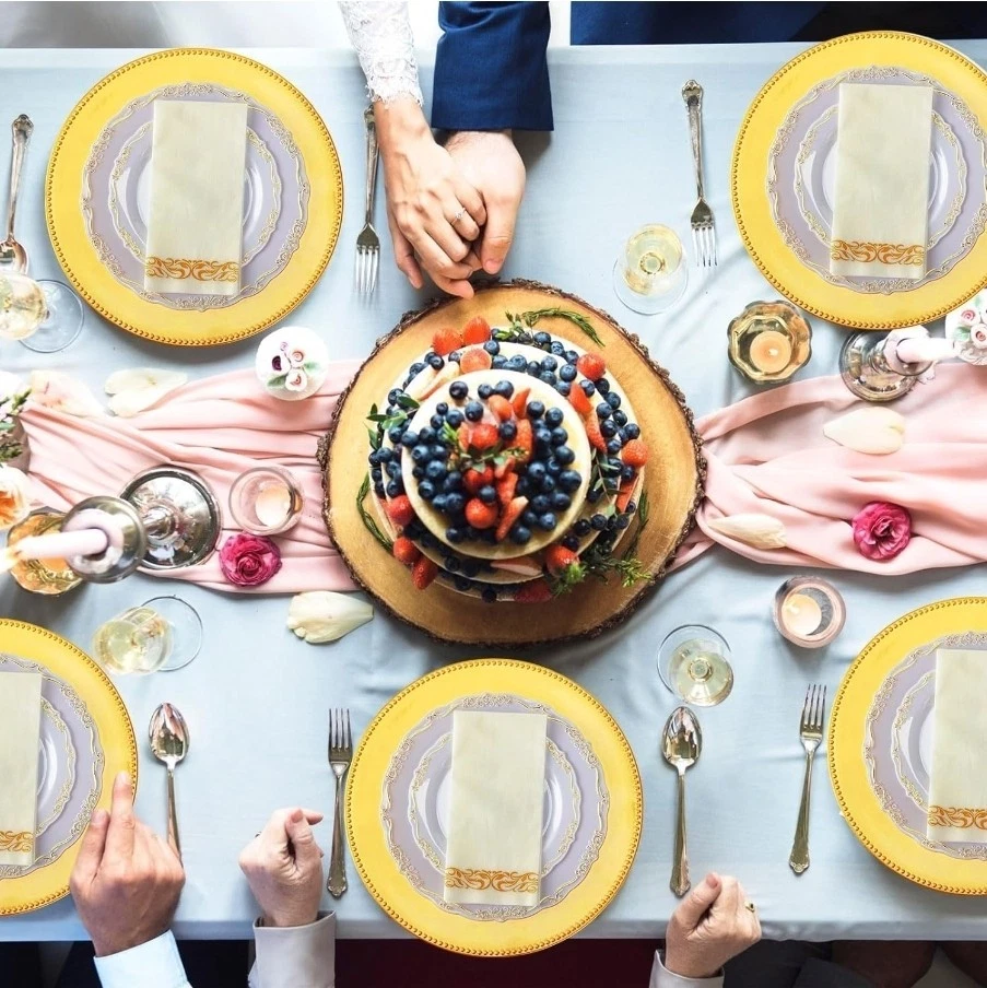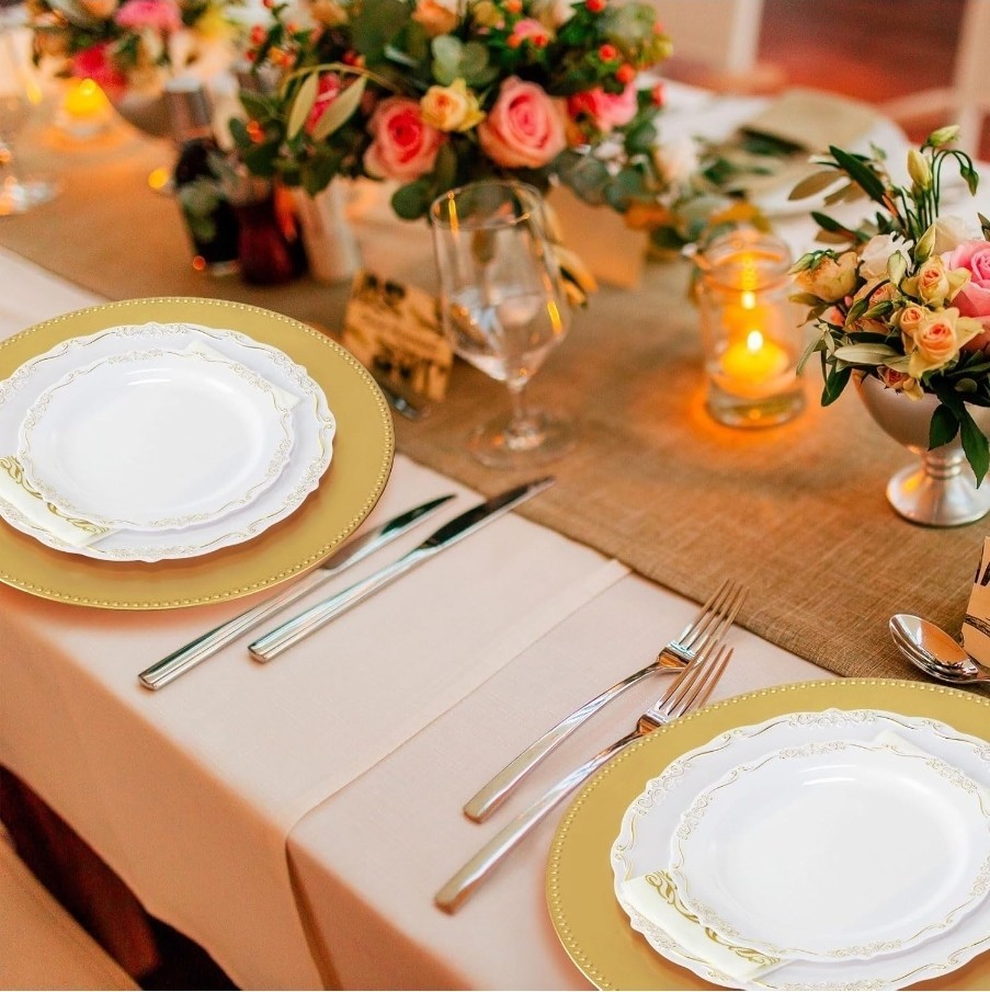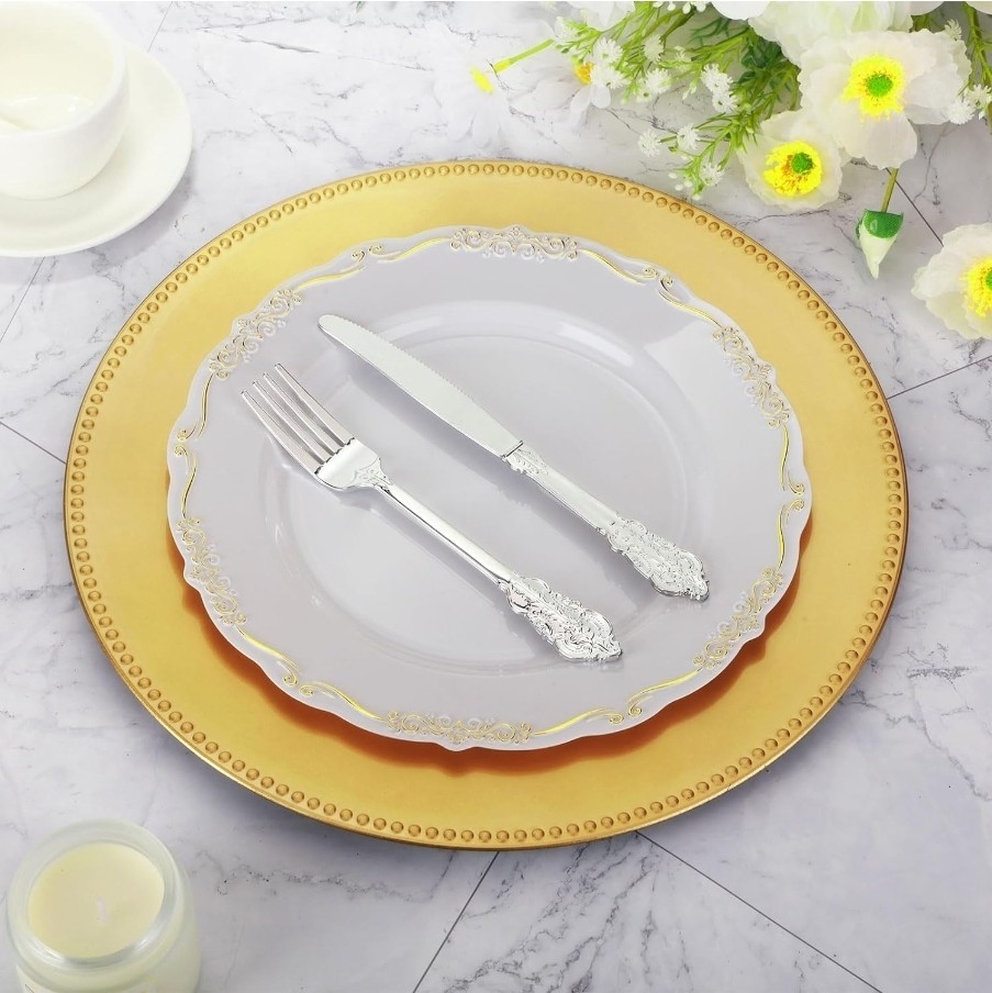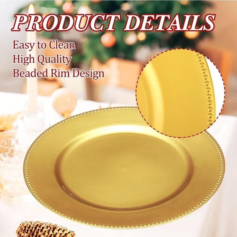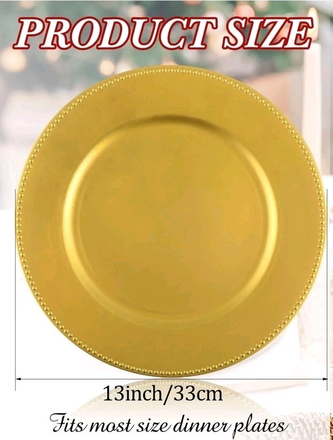 **This is a new never used open-box item. Plates have no signs of wear and are guaranteed unused.** **These plates are not for direct food use** Deliverables: The package includes 12 beaded charging plates, each measuring approximately 13 inches (33 cm) in diameter. These plates are designed to seamlessly complement 10-inch dinner plates and 7-inch salad plates, serving as an ideal decorative element for your table setting. The dimensions and quantity provided are sufficient to address your daily operational, replacement, and distribution requirements. Material Integrity: These beaded charger plates are constructed from high-quality, robust plastic, offering ample thickness to support substantial food items. This material ensures durability, resisting deformation and breakage, and is suitable for repeated use. Furthermore, their design facilitates ease of transport, making them appropriate for both indoor and outdoor events. Refined Aesthetics: The gold-painted charging dishes, adorned with beads, present a sophisticated and understated appearance. Their classic round form, coupled with the exquisite beading along the edges, introduces an element of elegance to your dining presentation. Spill Prevention: These gold-painted charger plates with beads are designed to be positioned beneath soup bowls and dinner plates, effectively preventing food spills. They are compatible with various banquet table arrangements, accommodating everything from salad plates to main course plates, thereby maintaining the cleanliness and order of your table. Concurrently, they contribute a stylish flair to your event and enhance the overall dining experience. Versatile Application: These round charger plates are well-suited for a diverse range of occasions, including dinner parties, birthday celebrations, weddings, engagements, bridal showers, baby showers, Thanksgiving, and other festive gatherings, making them an excellent enhancement to any dining table. Ships within 1 business day.