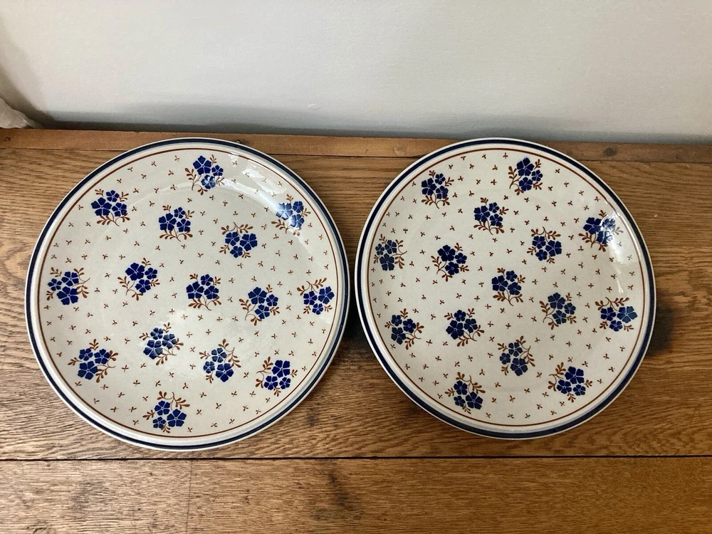 Set of two lovely Newcor Stonrware dinner plates, in Country Field pattern. Beige background with royal blue flowers and brown accents. Measures 10.5” wide. In excellent condition, no chips or cracks. Some very minor surface scuffing from what appears to be cutting with a dinner knife. Not even visible in photographs but I thought I should mention it!