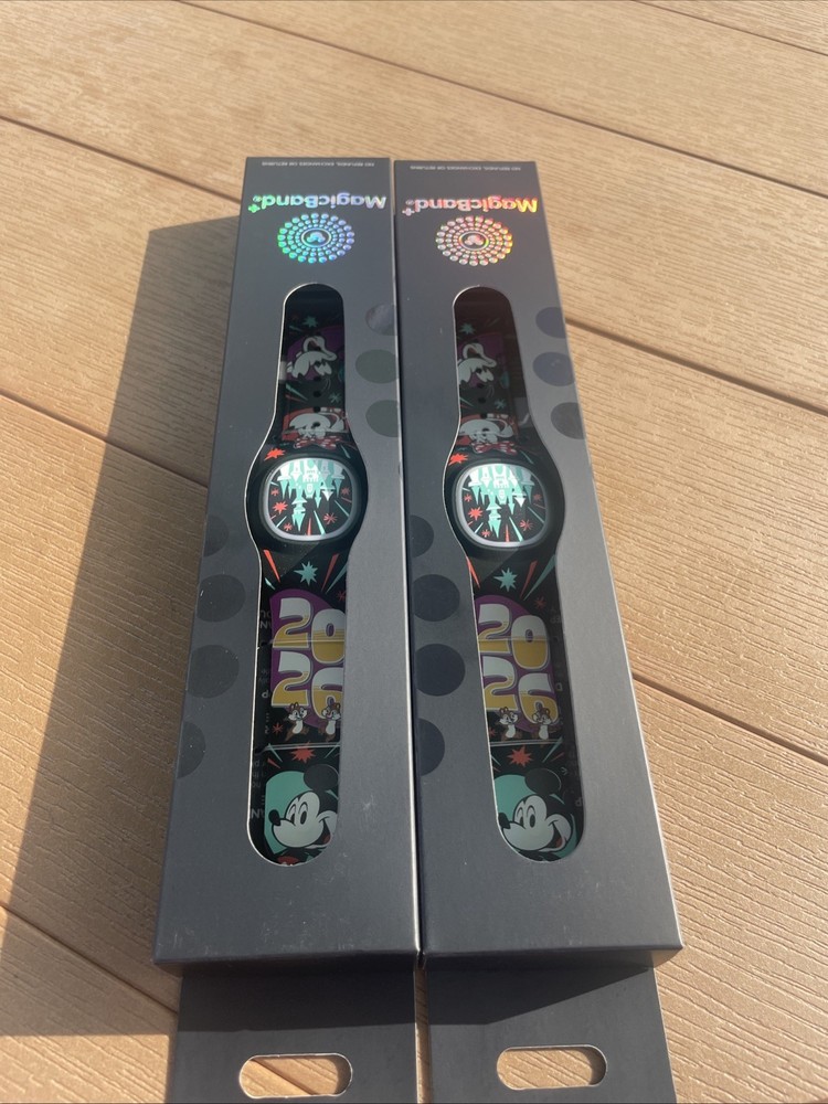 SET OF TWO! 2026 Disney MagicBands featuring Mickey Mouse with friends and Cinderella's Castle. These exclusive items are from Disney Theme Parks with characters including Mickey Mouse, Minnie Mouse, Goofy, and Chip and Dale. The MagicBands are unlinked and part of the Disney franchise. Perfect for Disney collectors and fans alike!