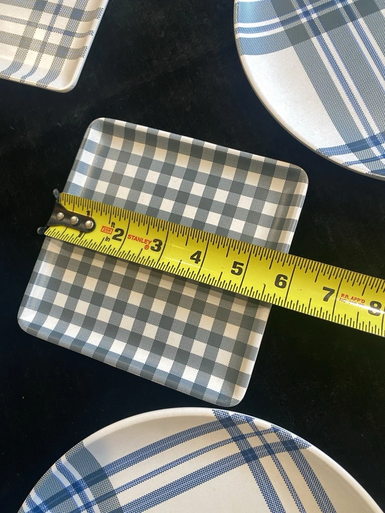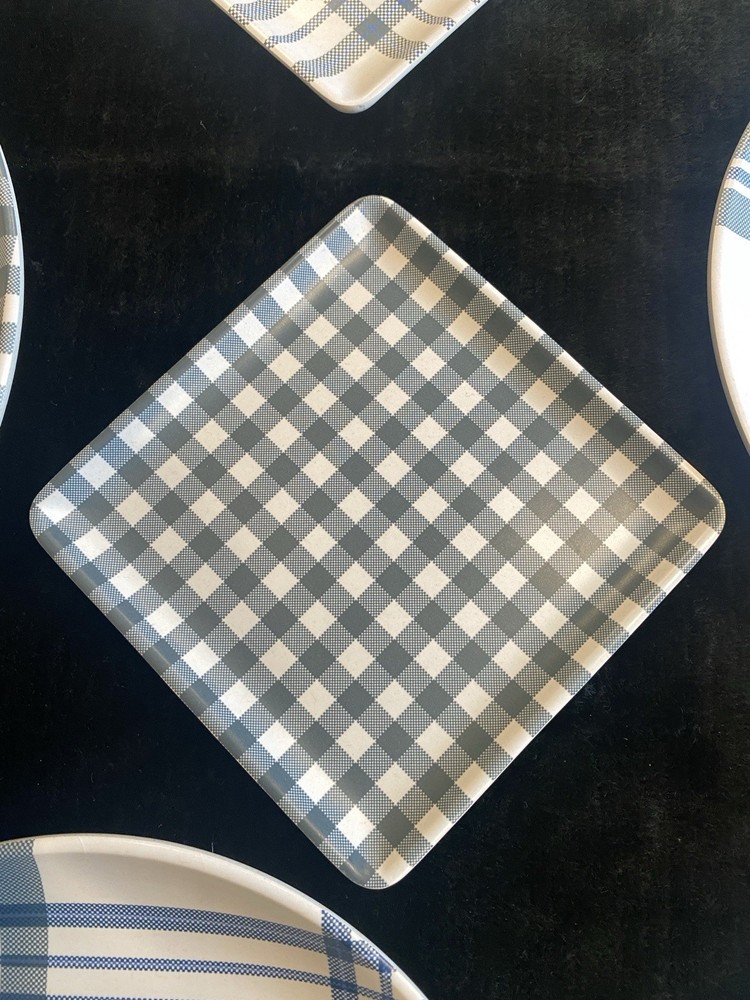 Brand:Tommy BahamaColor:Gray, WhiteType:Dinner Plate, Salad PlatePlate Diameter:10 in, 6 inNumber of Compartments:1Number of Items in Set:Eight-PieceDepartment:AdultsPattern:Plaid & Tartan, CheckedShape:Round, SquareMaterial:MelamineFinish:Matte