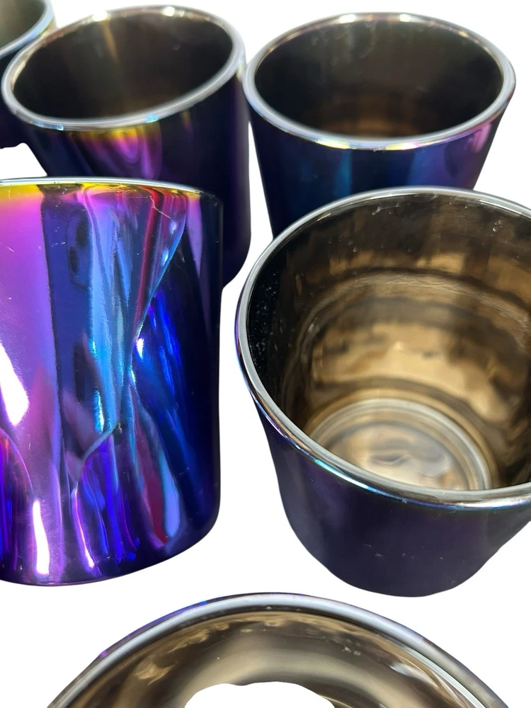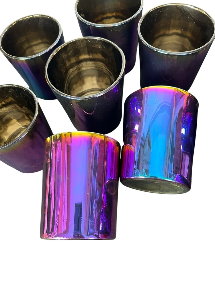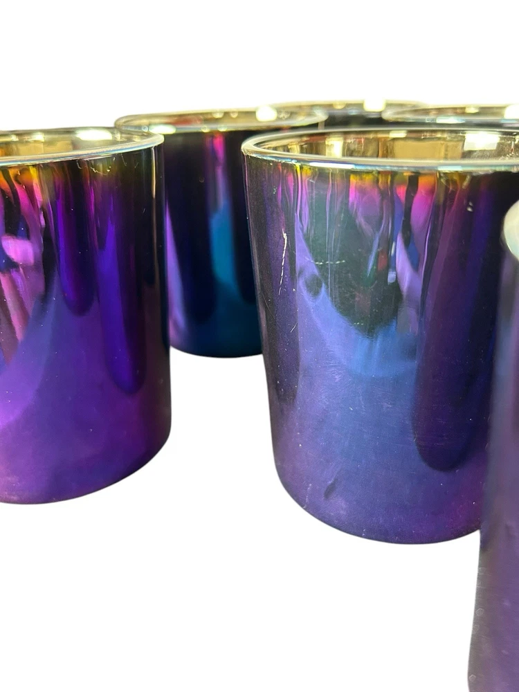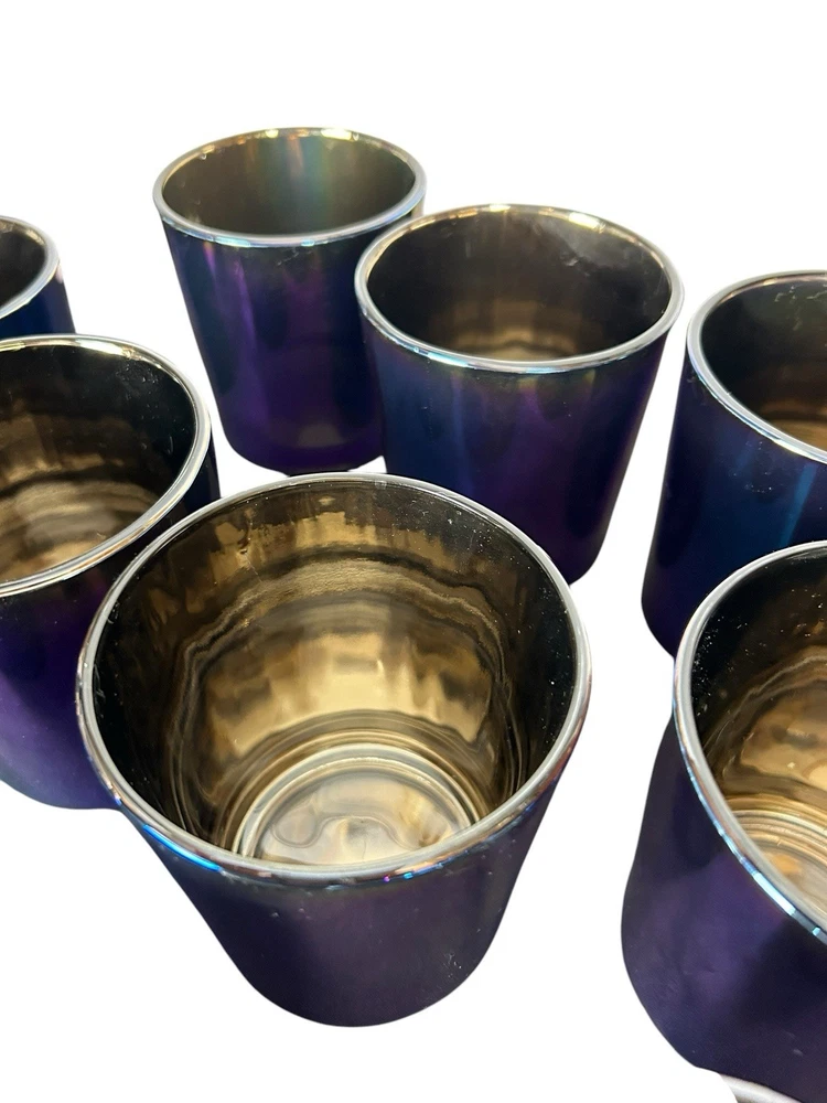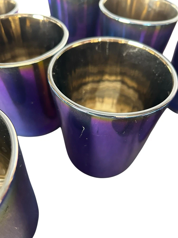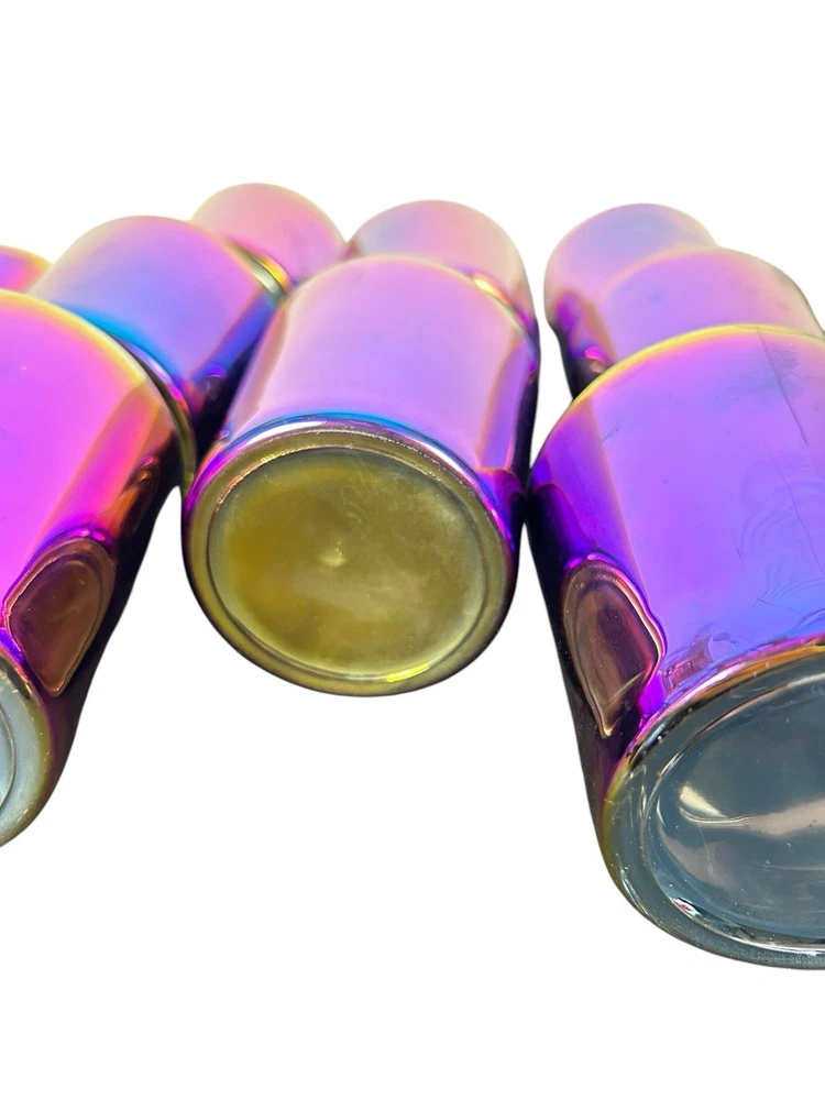 Set of 10 Glasses Or Candle Vases Vtg Carnival Glass Iridescent Oil slick Luster Good vintage condition. Normal signs of wear and use. There are some scratches on about 3 of the glasses/vases, and the rest has some minor scratches. Please study pictures before purchasing Feel free to ask us any questions. Thank you for visiting our store! Shlv