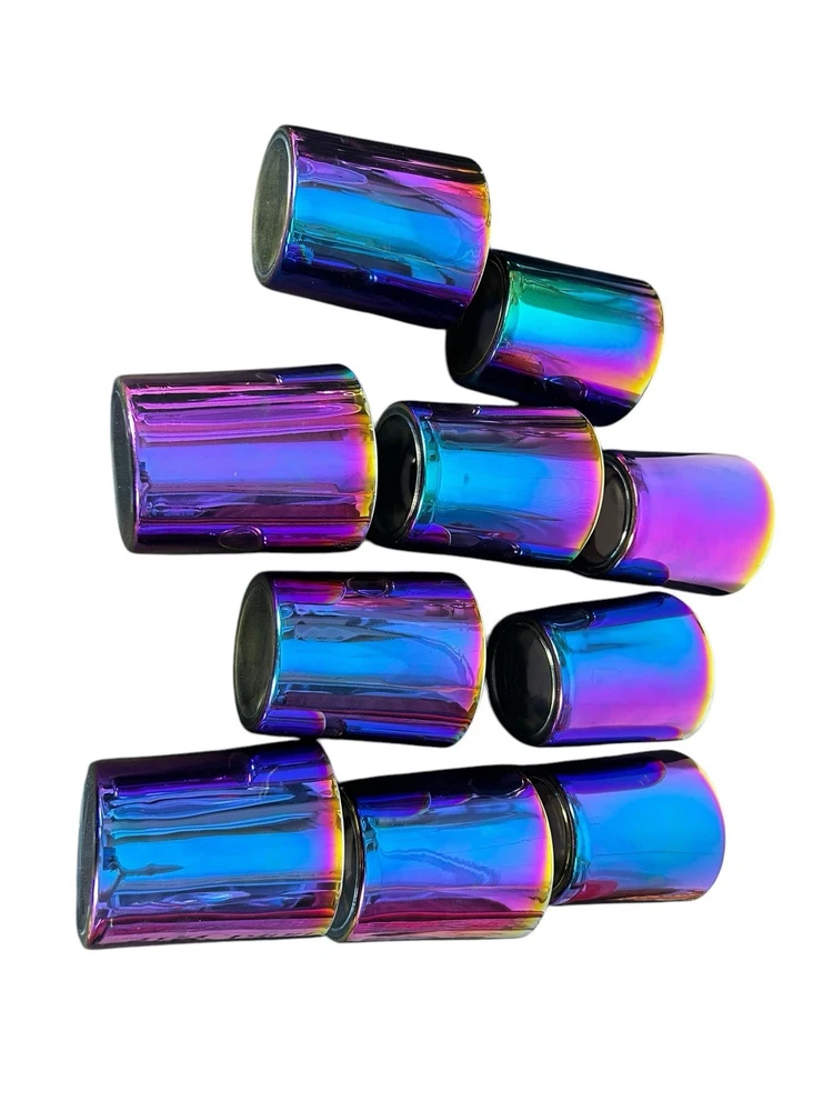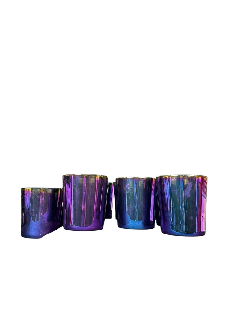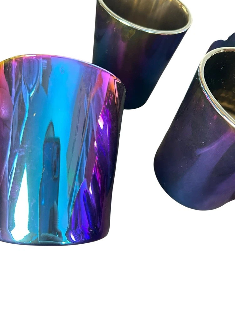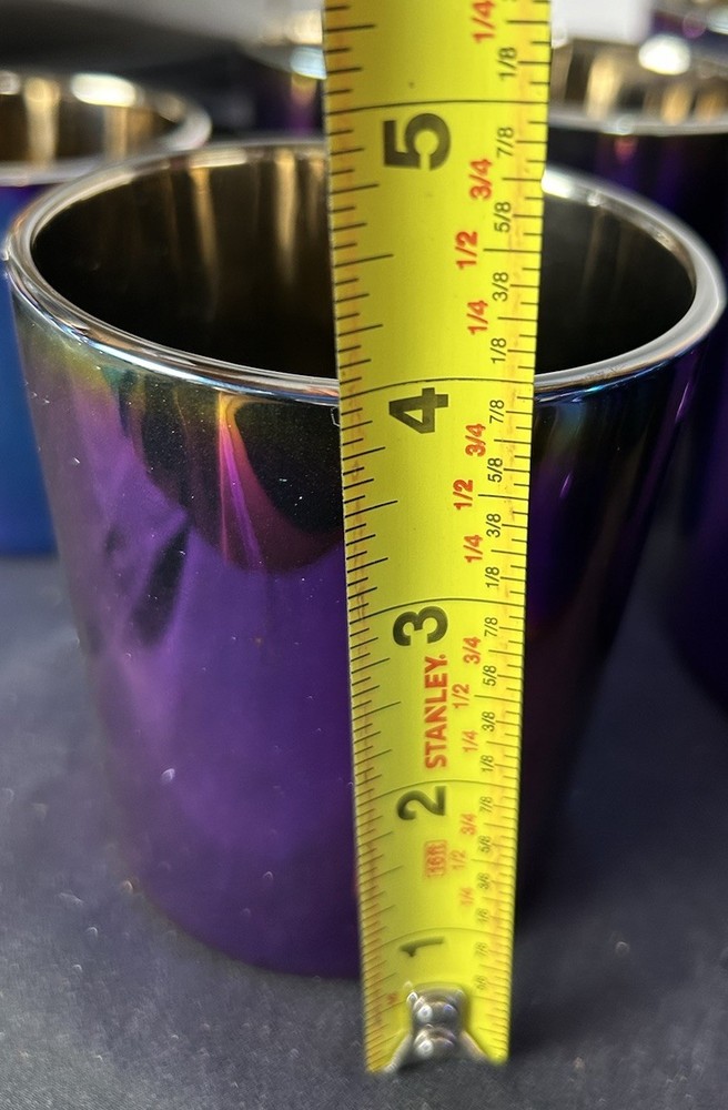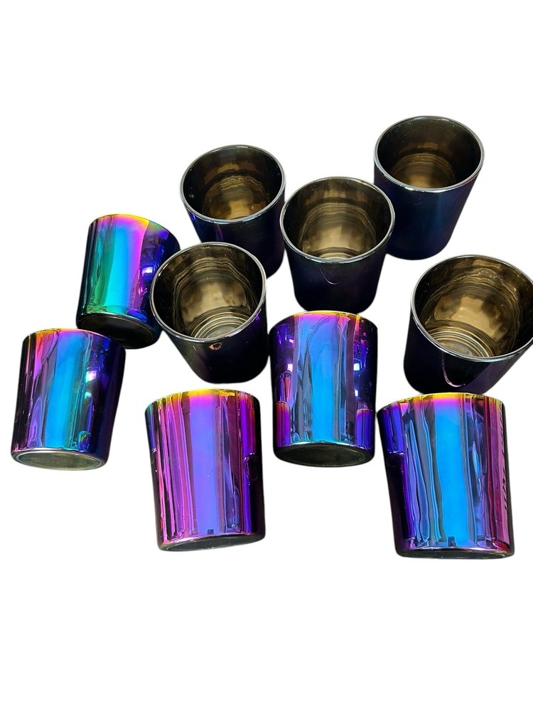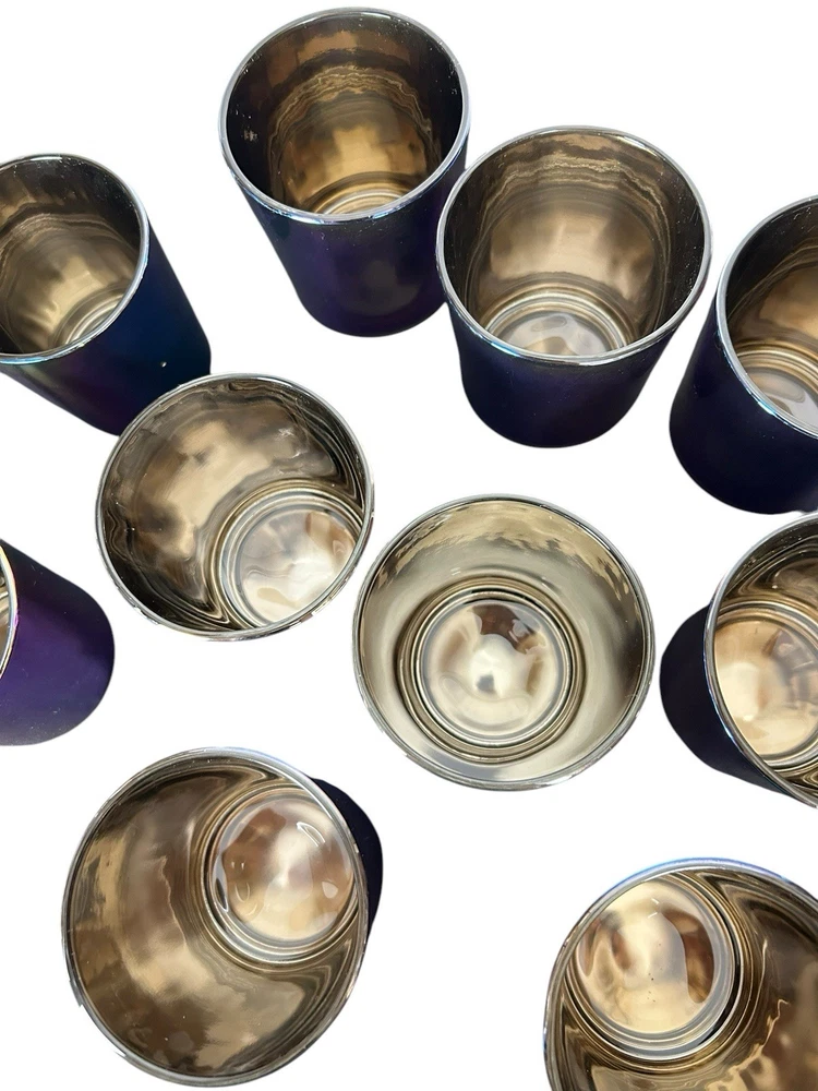 Set of 10 Glasses Or Candle Vases Vtg Carnival Glass Iridescent Oil slick Luster Good vintage condition. Normal signs of wear and use. There are some scratches on about 3 of the glasses/vases, and the rest has some minor scratches. Please study pictures before purchasing Feel free to ask us any questions. Thank you for visiting our store! Shlv