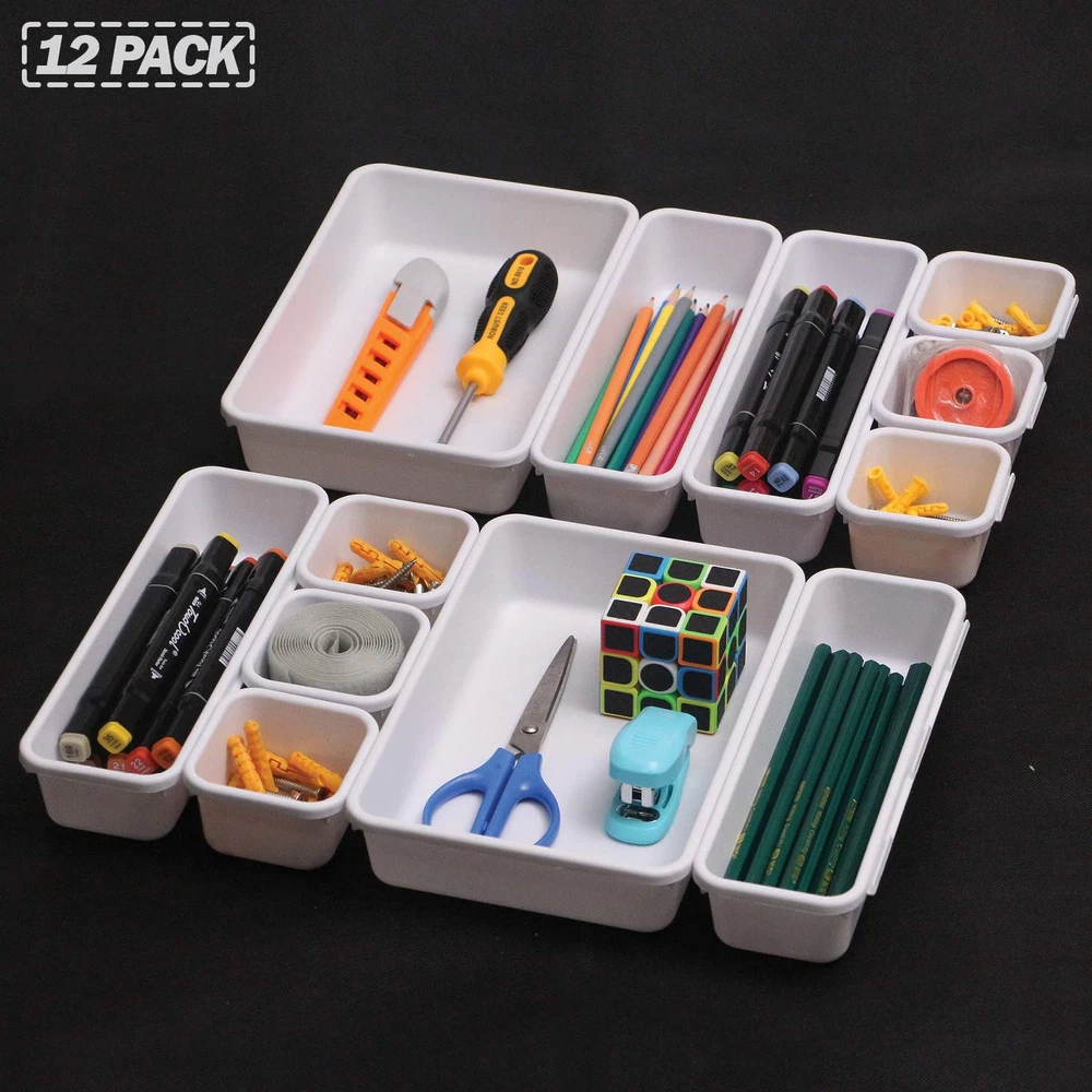 1.DRAWER ORGANIZER: These shallow desk drawer organizer will keep your accessories neat, tidy and organized. Perfect drawer inserts for makeup drawer organizer, bathroom drawer organizer, office drawer organizer, bathroom drawer dividers being ideal for bathroom, office products, cosmetics or vanity to organize hair accessories. Set of 12 includes 2 Large Bin Trays each 9.3 x 6.1 x 1.8 inches, 4 Medium bins 9.3 x 3.0 x 1.8 inches, 6 Small Bins of 3.0 x 3.0 x 1.8 inches. 2.CUSTOMIZE LAYOUT: Different size drawer organizers which you can customize the layout to fit any size drawer or specific need. Separate pieces can be split up for different uses and drawers. Perfect for dresser / bathroom / kitchen / office drawers, organizing cosmetic, make up tools, hair accessories, nail polish, hairbrushes, silverware, office supplies etc. 3.DURABLE & EASY TO CARE: Made from durable plastic, these shallow drawer dividers organizers can be used together or separately, and rearranged to suit the exact dimensions of your drawer. The vanity drawer organizer helps you maximize unused spaces throughout the home areas including; closets, laundry, office and other living spaces. Only requires a cloth for fast and effortless cleaning. Makes everything look beautiful and better organized. It will match almost any decor. 4.THE EVERYTHING INTERLOCKING DRAWER ORGANIZER: No matter where you use this set of 12 durable desk drawer organizers and storage — in the kitchen, bathroom, vanity makeup, or office — this multipurpose desk drawer organizer tray shallow keeps your things in order. You can freely mix and match them to increase the storage capacity in your drawers to fit a variety of home and office needs. 5.HANDY & VERSATILE: Not just for the kitchen – organize office, bathroom, vanity and make up drawers too. Our small organizer bins are designed for the bathroom, kitchen, make up closet, laundry, cosm DRAWER ORGANIZER: These shallow desk drawer organizer will keep your accessories neat, tidy and organized. Perfect drawer inserts for makeup drawer organizer, bathroom drawer organizer, office drawer organizer, bathroom drawer dividers being ideal for bathroom, office products, cosmetics or vanity to organize hair accessories. Set of 12 includes 2 Large Bin Trays each 9.3 x 6.1 x 1.8 inches, 4 Medium bins 9.3 x 3.0 x 1.8 inches, 6 Small Bins of 3.0 x 3.0 x 1.8 inches. CUSTOMIZE LAYOUT: Different size drawer organizers which you can customize the layout to fit any size drawer or specific need. Separate pieces can be split up for different uses and drawers. Perfect for dresser / bathroom / kitchen / office drawers, organizing cosmetic, make up tools, hair accessories, nail polish, hairbrushes, silverware, office supplies etc. DURABLE & EASY TO CARE: Made from durable plastic, these shallow drawer dividers organizers can be used together or separately, and rearranged to suit the exact dimensions of your drawer.The vanity drawer organizer helps you maximize unused spaces throughout the home areas including; closets, laundry, office and other living spaces.Only requires a cloth for fast and effortless cleaning.Makes everything look beautiful and better organized.It will match almost any decor. THE EVERYTHING INTERLOCKING DRAWER ORGANIZER: No matter where you use this set of 12 durable desk drawer organizers and storage — in the kitchen, bathroom, vanity makeup, or office — this multipurpose desk drawer organizer tray shallow keeps your things in order. You can freely mix and match them to increase the storage capacity in your drawers to fit a variety of home and office needs. HANDY & VERSATILE: Not just for the kitchen – organize office, bathroom, vanity and make up drawers too. Our small organizer bins are designed for the bathroom, kitchen, make up closet, laundry, cosmetic.