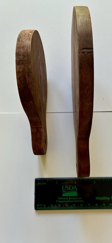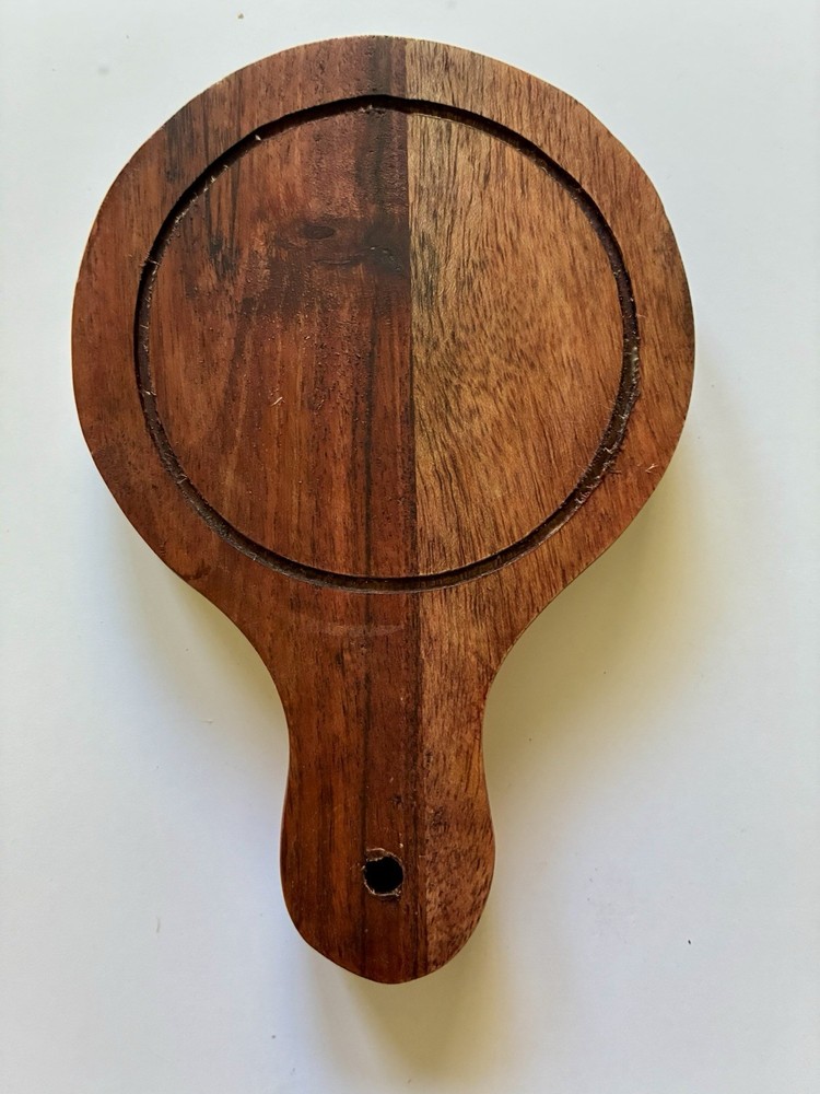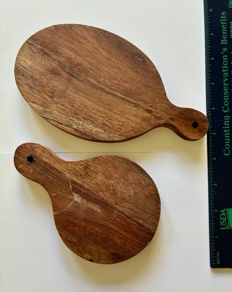 Set of 2 Acacia Wood Serving Boards – Rustic Style Nice set of two solid wood serving boards, likely acacia, with natural grain variation and warm tones. Great for serving cheese, charcuterie, snacks, or small appetizers. Can be used as coasters too. Details: • Set includes 2 boards (as shown) • Solid wood (not bamboo or composite) • Natural variation in grain and color • Handles with hanging holes Condition: • Pre-owned with visible signs of use • Some surface wear, marks, and dry areas from normal use • No cracks or structural damage • Could benefit from light sanding and oiling to restore finish Notes: • Rustic look – perfect for casual entertaining • Compact size – ideal for individual servings or small displays • See photos for exact condition and appearance Ships carefully packaged.