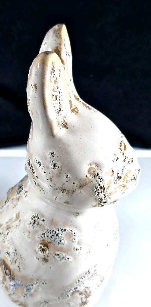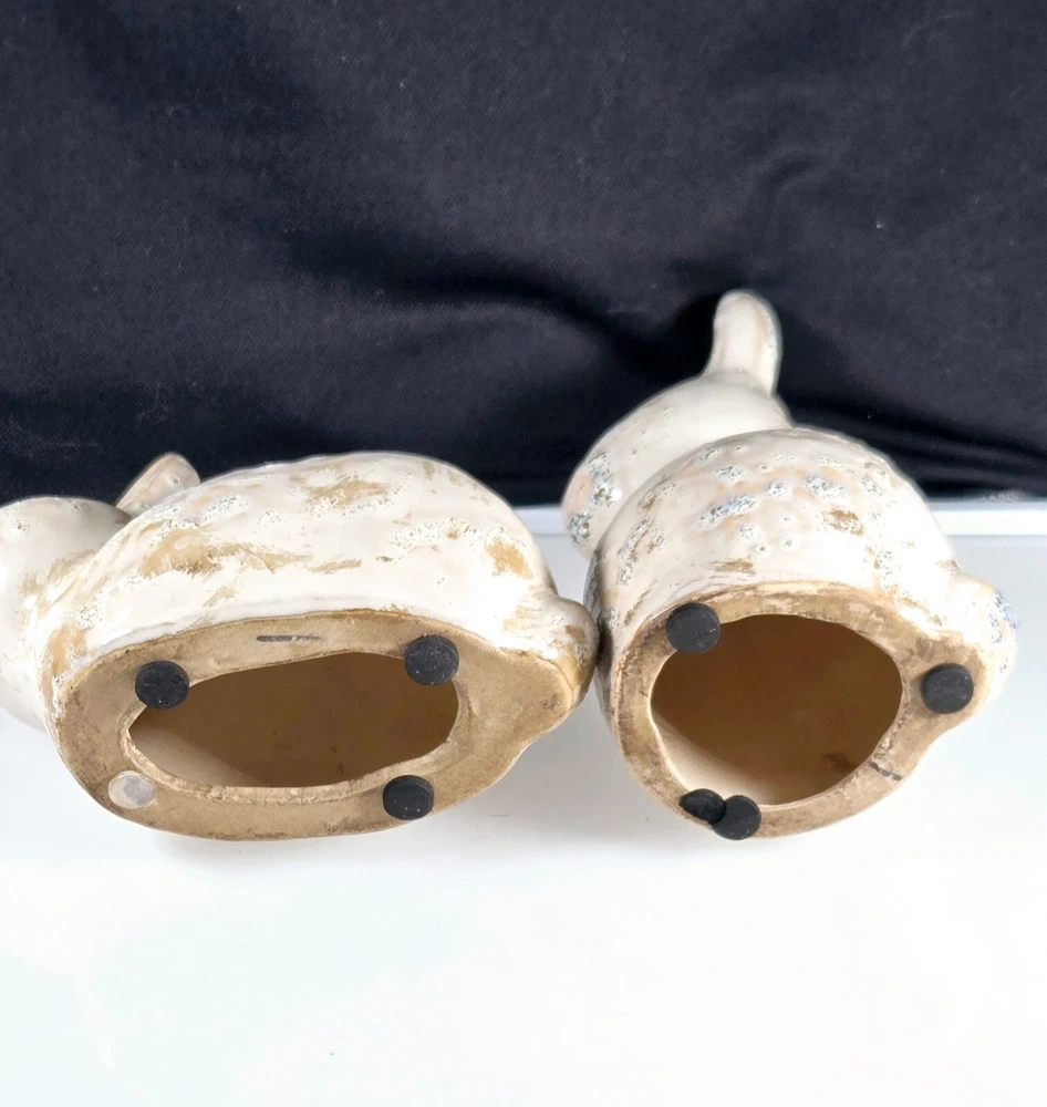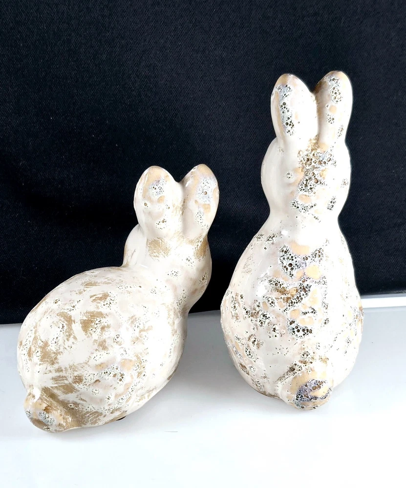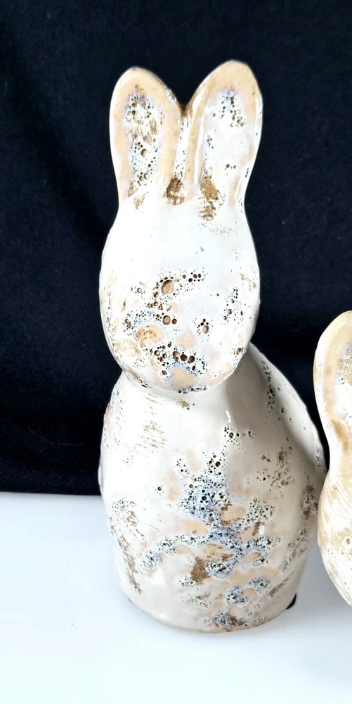 This set features two rustic ceramic bunnies, with one measuring 7.25 inches in height and the other 5.5 inches. The figurines are unmarked and have a beige glazed finish, adding a charming touch to any decor. Crafted from ceramic in an art pottery style, these bunnies showcase a handmade aesthetic, perfect for those who appreciate artisanal pieces. The rabbits are a delightful addition to any space, exuding a quaint and whimsical vibe with their charming design. J011