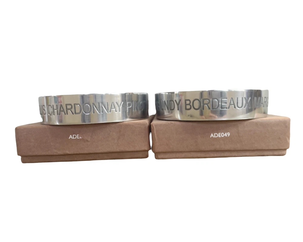 Set of 2 Bombay London Wine Coasters Etched Aluminium Boxed Red White Wine Measure approx 4" D X 1' H Set of 2 Cast Aluminum Coasters White Wine has etched Pinot Grigio, Pouilly Fume, Sanceree, Chablis, Chardonnay Red Wine has etched Burgandy, Bordeaux, Marguex, Beaujolais, Cotes du Rhone. Smoke free home Please visit my store at https://www.ebay.com/str/theuniqueredhead . Thank you for your consideration. Please message me if you have any questions. I do combined shipping on my items in the store.