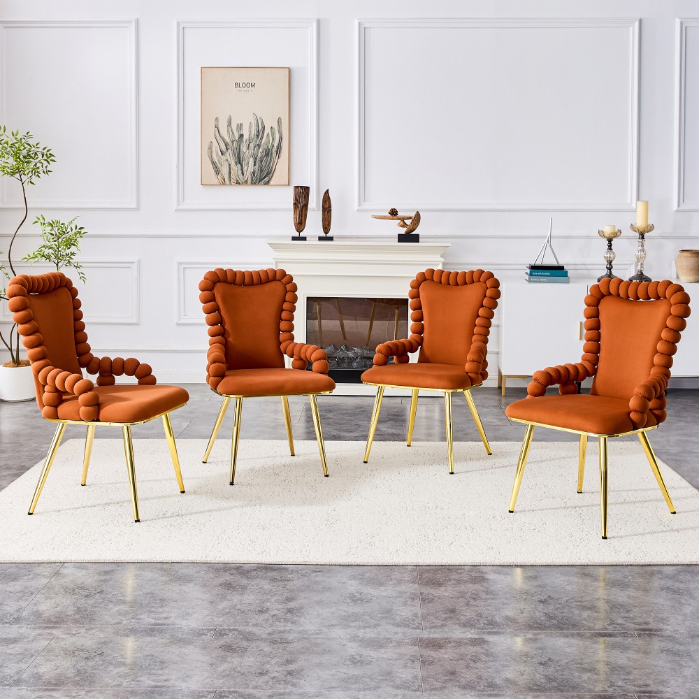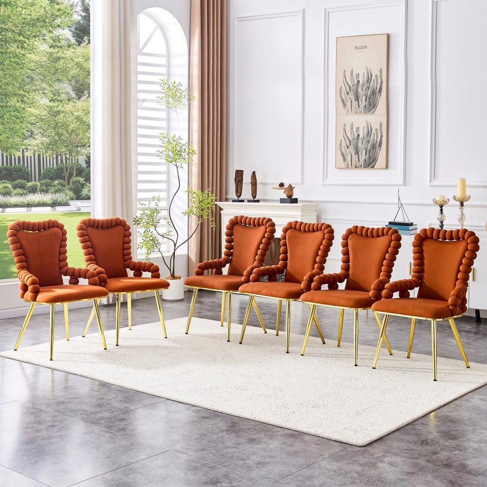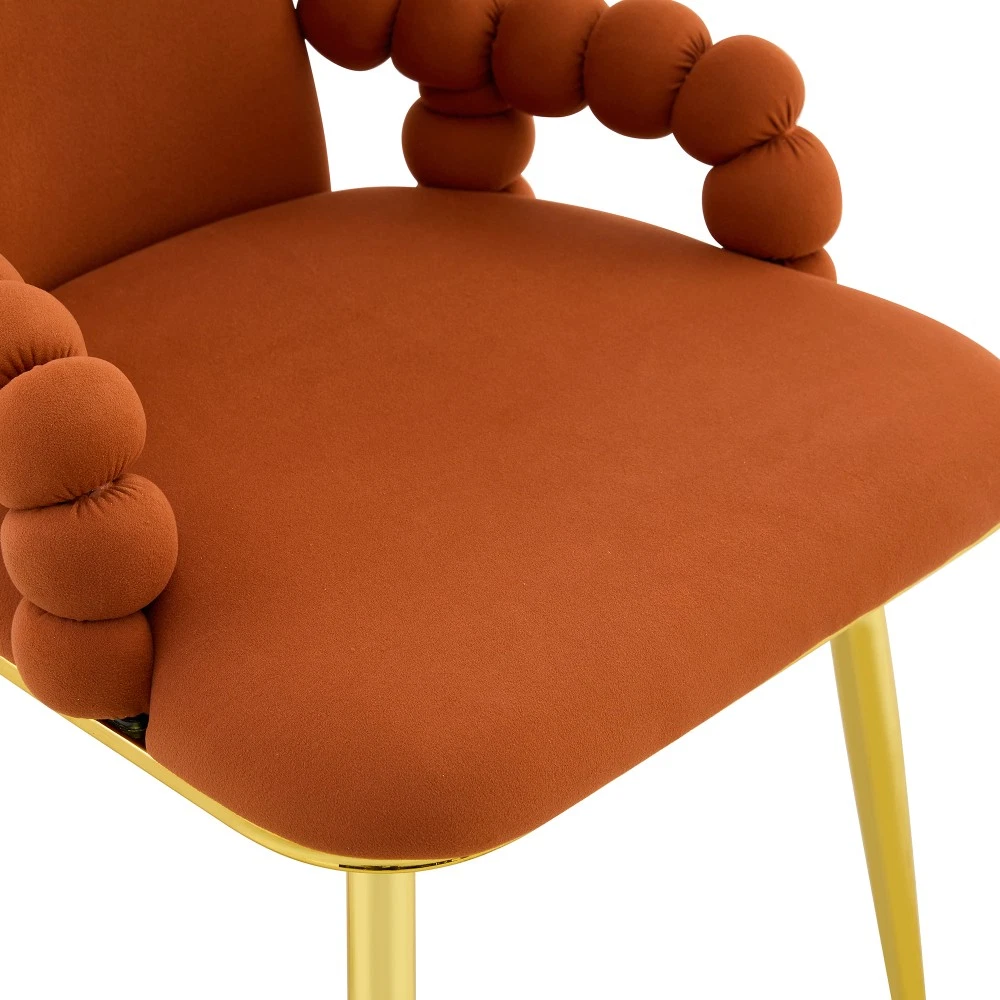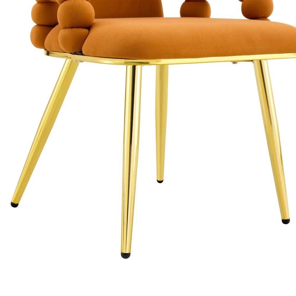 Set of 2 Brown Puffy Bubble Chain Dining Chairs, Velvet Upholstered with Gold Metal Legs & Armrests for Dining Room, Kitchen Elevate your dining space with a perfect blend of sculptural artistry and plush comfort—introducing this set of 2 bubble chain dining chairs! Crafted with luxurious brown Dutch velvet and sleek gold metal legs, these chairs aren’t just seating solutions; they’re eye-catching statement pieces that add warmth, glamour, and personality to your dining room or kitchen. Whether you’re hosting a dinner party, enjoying a family meal, or simply relaxing, they deliver unmatched style and all-day coziness. Unique Ball-Chain Bubble Design: A Sculptural Home Accent Inspired by high-end jewelry and contemporary art, these dining chairs feature a one-of-a-kind ball-link backrest. Made of plush round cushions that resemble a chain of delicate bubbles, the design turns ordinary dining seating into a conversation starter. The sculpted armrests further enhance the artistic appeal, making each chair a stunning focal point that transforms your space with modern sculptural charm. Premium Non-Directional Dutch Velvet Upholstery Upholstered in top-quality Dutch velvet, these chairs stand out from standard velvet seating. Unlike ordinary velvets, Dutch velvet has no shading effect or “nap,” boasting a soft, consistent texture that looks smooth and refined from every angle. The rich brown hue adds a touch of warmth to your space, while the plush fabric feels gentle against the skin and holds up well to daily use—perfect for busy dining areas. Luxurious Gold Metal Legs: Glamour Meets Stability The electroplated gold metal legs exude chic contemporary style, pairing beautifully with the soft brown velvet for a balanced mix of glamour and modern minimalism. Beyond aesthetics, the sturdy metal construction ensures reliable stability, supporting daily use for years to come. The polished gold finish showcases exceptional craftsmanship, instantly upgrading the ambiance of your dining room or kitchen with a high-end touch. Ergonomic Comfort for All-Meal Enjoyment Designed with comfort at the core, the gently curved bubble backrest hugs your body’s natural shape, providing optimal lumbar support during extended meals. The seat is padded with thick foam, delivering plush, cloud-like comfort that keeps you cozy even during long dining sessions. The ergonomic high back and velvet cushioning work together to reduce strain, making these chairs ideal for both dining and casual relaxation. Versatile Style for Multiple Spaces This set of 2 dining chairs is perfect for instantly upgrading your dining area’s aesthetic, but their versatility doesn’t stop there. They also work beautifully as accent chairs in your living room or extra seating in the kitchen, blending seamlessly with various interior decor styles—from modern and contemporary to eclectic and luxurious. A perfect combination of style, comfort, and functionality for any home space. Product Specifications Material: Metal (Legs), Velvet (Upholstery) Color: Brown (Upholstery), Gold (Legs) Seating Capacity: Set of 2 Features: Armrests, Ergonomic High Back, Thick Foam Padding Assembled Dimensions: 22.00" (Length) x 19.00" (Width) x 37.00" (Height) Product Weight: 34.67 lbs Packaging Details Package Dimensions: 27.95" (Length) x 22.05" (Width) x 21.65" (Height) Package Weight: 39.82 lbs Included in Package: 2 x Brown Velvet Bubble Chain Dining Chairs with Gold Metal Legs Shop With Confidence We stand behind the quality and craftsmanship of these bubble chain dining chairs! Enjoy a 1-Year Warranty for peace of mind against manufacturing defects, plus a 30-Day Free Return & Exchange Policy. If you’re not completely satisfied with your purchase, we offer a hassle-free return or exchange process—no hidden fees, just total satisfaction guaranteed.