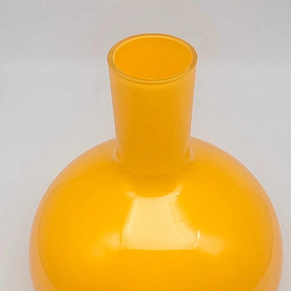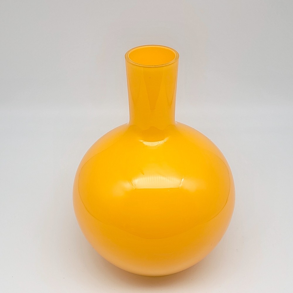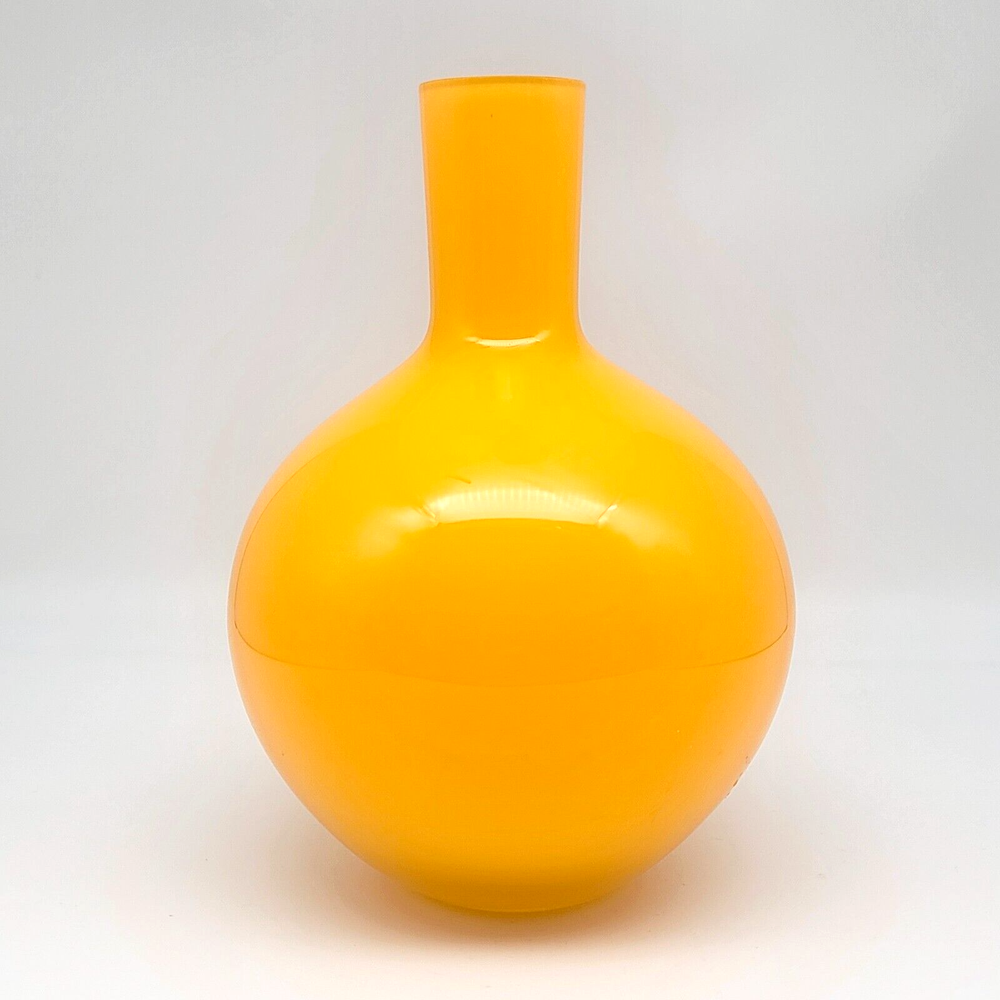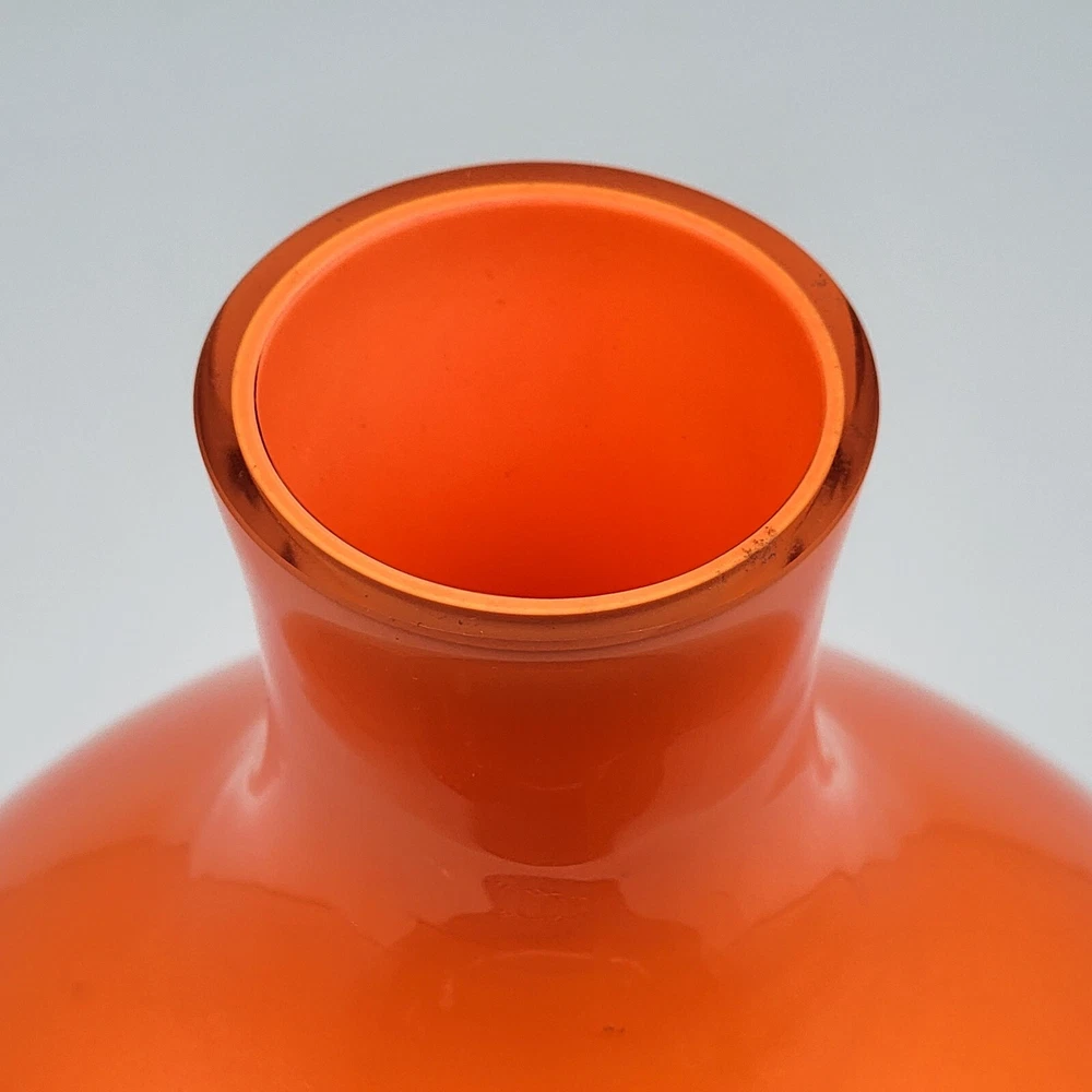 Set of 2 Crate and Barrel Encased Glass Vases Yellow 8.25" T and Orange 9.5" T The vases feature a glossy finish and bright yellow and orange colors. Yellow vase measures 8.25" T and 5.5" Diameter. Orange vase measures 9.5" T and 6.5" Diameter. Yellow vase has a 1 3/8" opening at the top. Orange vase has a 1 5/8" opening at the top. Used but in very good condition. Yellow vase has a small black spot inside the glass. The orange vase has a few small scratches that are hard to see because of the glossy finish and bright color. See photos for details.