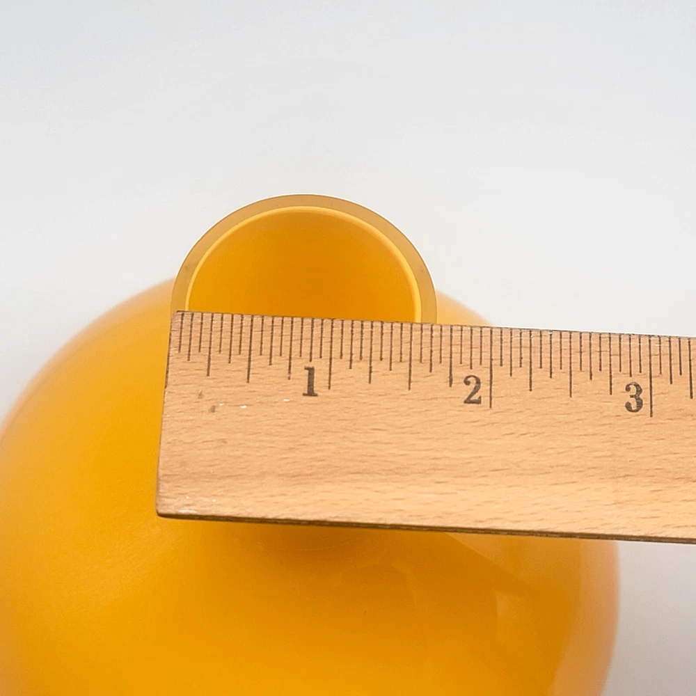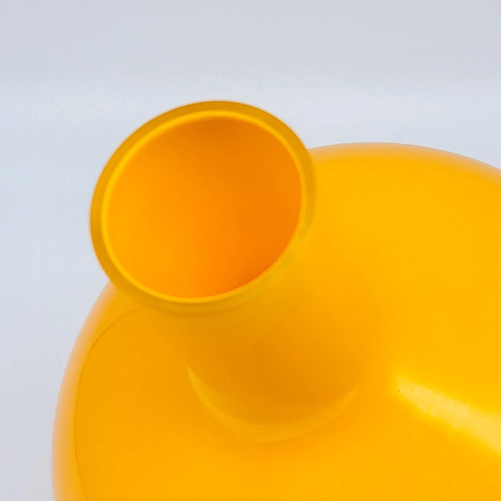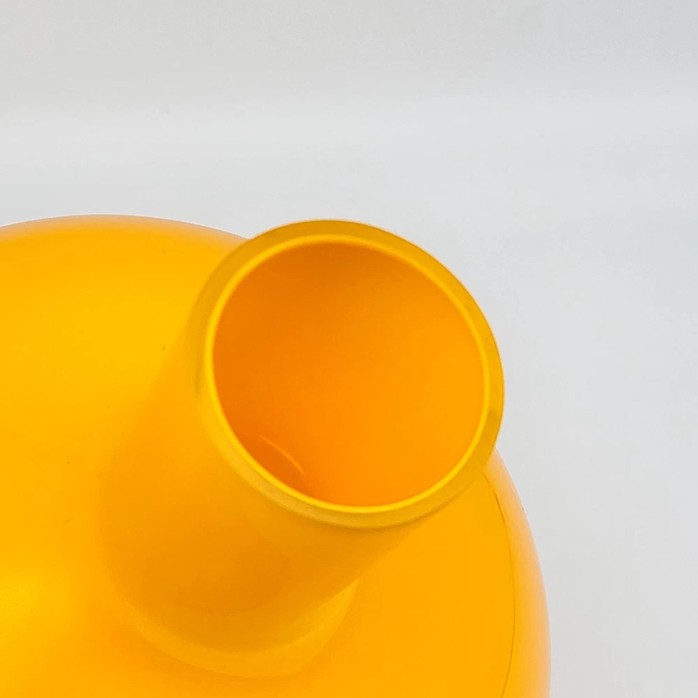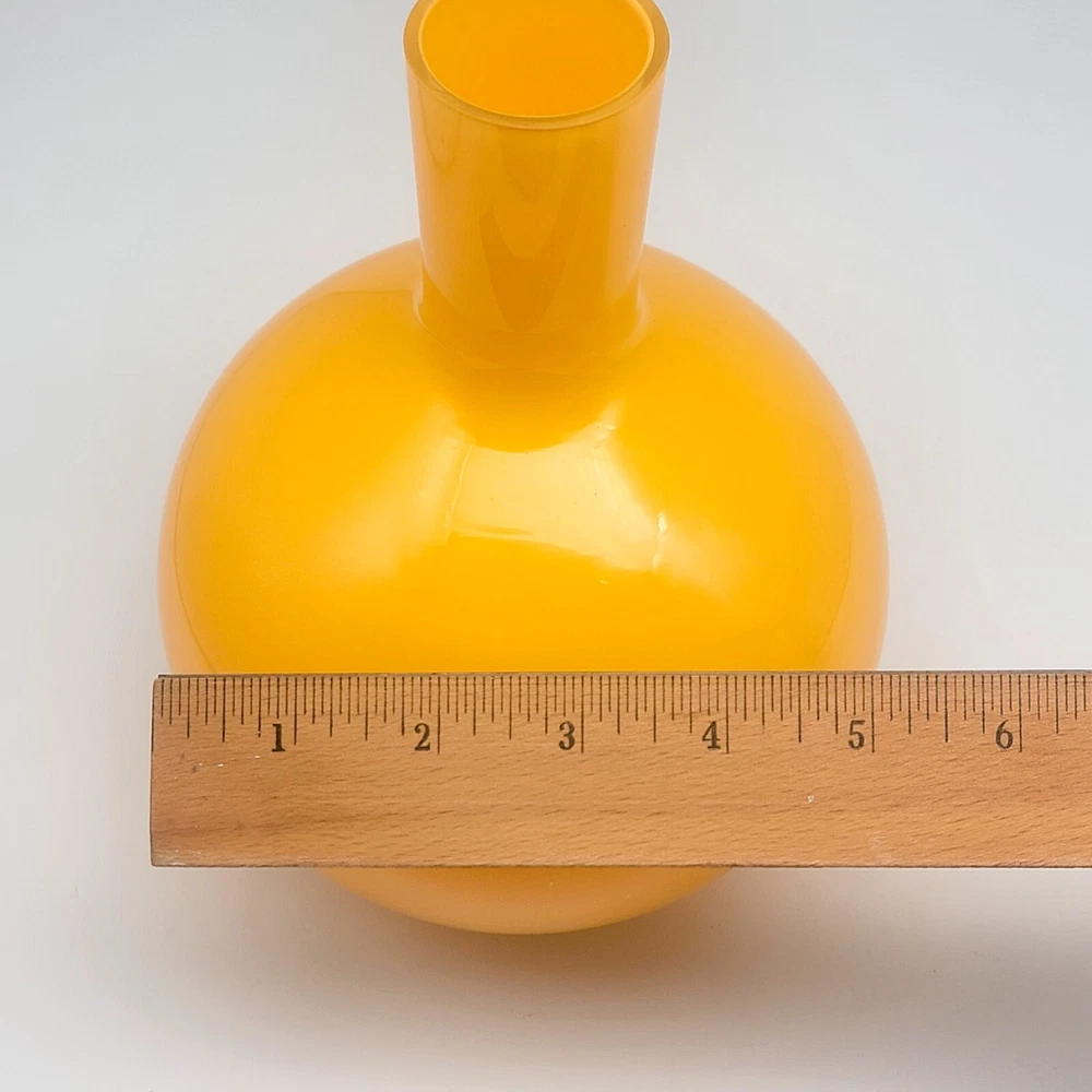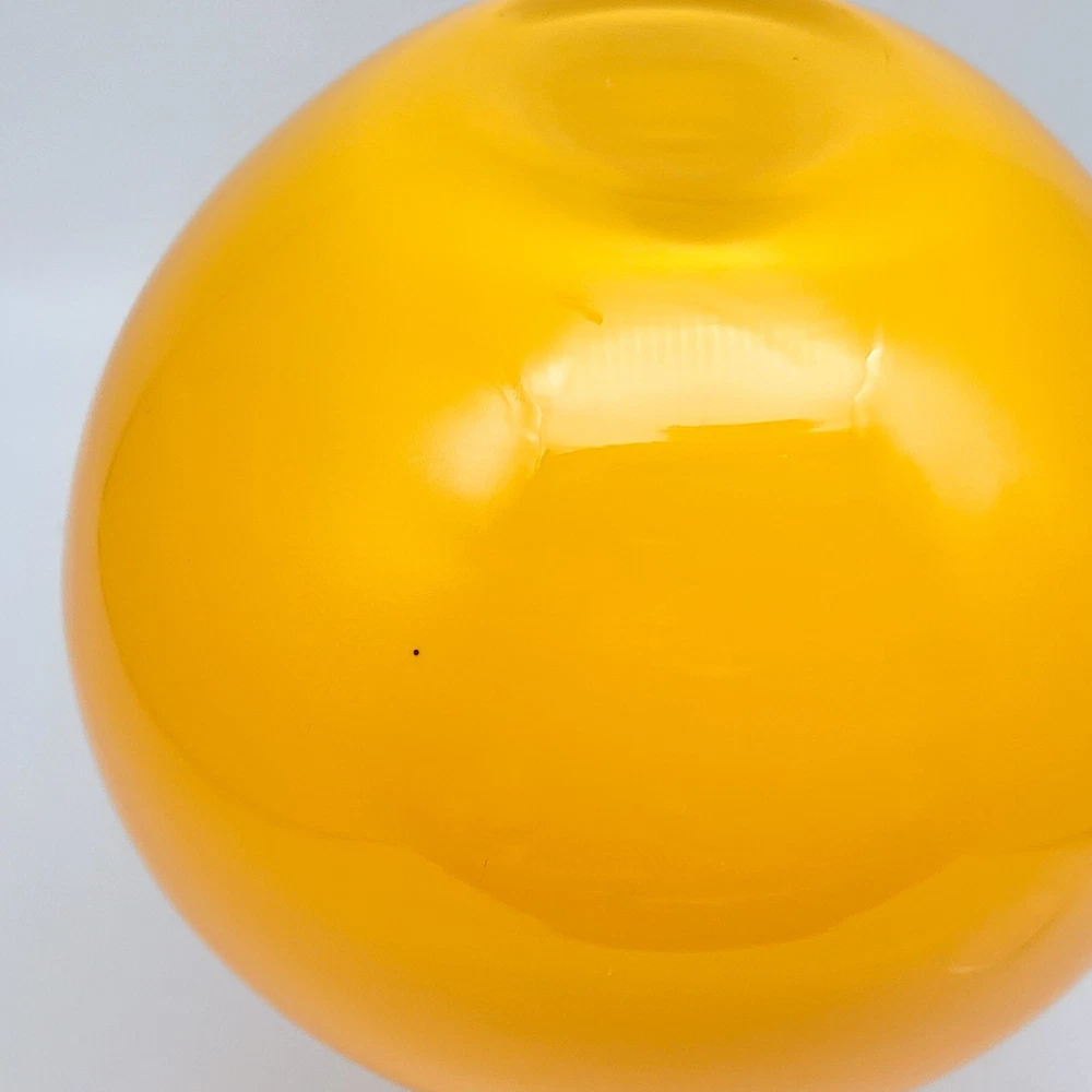 Set of 2 Crate and Barrel Encased Glass Vases Yellow 8.25" T and Orange 9.5" T The vases feature a glossy finish and bright yellow and orange colors. Yellow vase measures 8.25" T and 5.5" Diameter. Orange vase measures 9.5" T and 6.5" Diameter. Yellow vase has a 1 3/8" opening at the top. Orange vase has a 1 5/8" opening at the top. Used but in very good condition. Yellow vase has a small black spot inside the glass. The orange vase has a few small scratches that are hard to see because of the glossy finish and bright color. See photos for details.