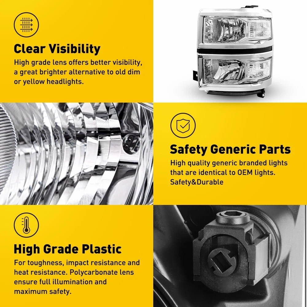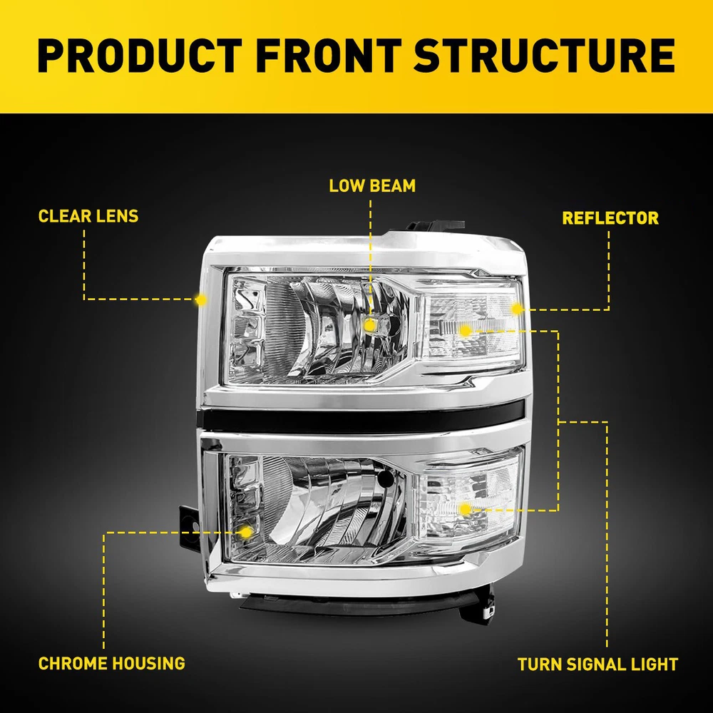 Fit for: 2014-2015 Chevy Silverado 1500 Models Only (Fit 2014 New Body Style Models Only; Does NOT Fit HD Models) Specifications: OE number: 20933724, 20933725, 20933722, 20933723, 23172782, 23172783 GM2502389, GM2503389, GM2502395, GM2503395, GM2502410 Material: ABS+PC (ABS Plastic Housing/Polycarbonate lens) Appearance color: 1.Housing Color: Chrome 2.Lens Color: Clear 3.Reflector Color: White Note: Projector × (Not include) DRL × ( Not Include) Bulb × (Not include) Set of 2 For Chevy 2014-2015 Silverado 1500 Chrome Housing Headlights Head EXA Fit for: 2014-2015 Chevy Silverado 1500 Models Only (Fit 2014 New Body Style Models Only; Does NOT Fit HD Models) Specifications: OE number: 20933724, 20933725, 20933722, 20933723, 23172782, 23172783 GM2502389, GM2503389, GM2502395, GM2503395, GM2502410 Material: ABS+PC (ABS Plastic Housing/Polycarbonate lens) Appearance color: 1.Housing Color: Chrome 2.Lens Color: Clear 3.Reflector Color: White Note: Projector × (Not include) DRL × ( Not Include) Bulb × (Not include) Features: *Easy to install: Direct replacement, drilling and cutting are not required. *Superior quality: Made of ABS and PC materials with toughness and heat resistance functions to ensure its long service life and durability. *Angle adjustment: Equipped with a headlamp Angle adjustment knob, you can adjust the best Angle of view through the knob. Suggestion: 1.Please confirm the OE number before purchasing!!! 2.Professional installation is required!!! Package Included: Headlights *2 (Left+Right) Item Specifics Number of Pieces 2 Type Headlight Assembly OE/OEM Part Number 20933724, 20933725, 20933722, 20933723, 23172782, 23172783 Fitment for 2014-2015 Chevy Silverado 1500 Models Only Attention Fit 2014 New Body Style Models Only; Does NOT Fit HD Models Manufacturer Warranty 1 Year Universal Fitment No Interchange Part Number GM2502389, GM2503389, GM2502395, GM2503395, GM2502410 Fitment Type Direct Replacement Brand Unbranded OE/OEM Part Number 20933724, 20933725, 20933722, 20933723, 23172782, 23172783 Fitment for 2014-2015 Chevy Silverado 1500 Models Only Attention Fit 2014 New Body Style Models Only; Does NOT Fit HD Models Manufacturer Warranty 1 Year Universal Fitment No Interchange Part Number GM2502389, GM2503389, GM2502395, GM2503395, GM2502410 Fitment Type Direct Replacement Payment We only accept PayPal payment, should be received within 3 days from the date of purchase. Please keep the consistency of Paypal address and ebay address. Payment should be made within 4 days once you won a item ,or ebay will launch Unpaid Reminder agaist you and there will be bad record on your ebay account . Buyers are responsible for import duties, custom fees and taxes.Please check with your country's custom office to determine the additional costs before you finally make the purchase Shipping All items will be shipped in 48 hours after receiving your payment . We ship this item to US only via USPS first class mail. It usually takes 3-6 working days to deliver. Returns We offer 30 days return policy. Please contact us within 30 days t from the date you receive your order if you have any issues with the product or want return .Refund will be send after we got your resend package. All returned items should be in the original packaging , return tracking information should be provided .. Buyer is responsible for return shipping cost due to the problem not caused by item quality itself . Contact Us Our office hours are MONDAY - FRIDAY 9:00PM - 6:00PM PST, but we will response you once we get your message .There will be some delay on response if you send message or E-Mail on weekend. FAQ Q1: Will this bulb fit my vehicle? A: We can match almost any vehicle to one of our bulb sizes. eBay only lets us include partial vehicle fitments per listing, but if your vehicle does not show up on the compatibility table at the top of our listings, welcome you to contact us for free consulation before purchasing a product. Q2: My item has not arrived, what's taking so long? A: Sometimes items take longer than expected, especially if it’s going far or to rural area. Check with your post office to see if your item has been held up. Sometimes USPS will not update a tracking number until it has arrived at its destination. If your item still has not arrived after a few days, let us know so we can double check for you and help solve it asap. Q3: Do I need to mention the Year, Make and Model in the notes when place order? A: YES. Please include the Year, Make, and Model in the notes section during checkout to ensure you receive everything needed for your kit! Q4: My bulbs won't fit, help! A: Special bulb holder may be required. See if you can take the holder from the stock bulb. If not, let us know. The bulb size may be wrong, double check the item you received with the item you ordered. Do you have an aftermarket lighting housing? These may not be perfectly fitted for aftermarket bulbs and will require some manual modifications. Q5: Neither side lighting up? Both sides flicker, flash, or work inconsistantly. A:Check the headlight fuses, and then check the ballast plugs to insure correct installation. If this doesn't work, there may be a voltage problem with the vehicle. You probably just need a relay or capacitor. Q6: WARNING ABOUT POLARITY Unlike halogen bulbs, LED are polarity sensitive. BEFORE you start your LED kit installation, verify the polarity on your vehicle by simply plugging the LED bulb into your vehicle socket. - if your light turns on, please proceed to install both bulbs onto your vehicle. - if your light DOES NOT turn on, disconnect the bulb and flip the socket in order to reverse the polarity (this will not damage your vehicle electrical system in any way). Once you made sure the LED bulb turns on, please proceed to install both bulbs onto your vehicle. Note: There is no convention when it comes to polarity. Different car manufactures have different polarity setup, even within the car model th