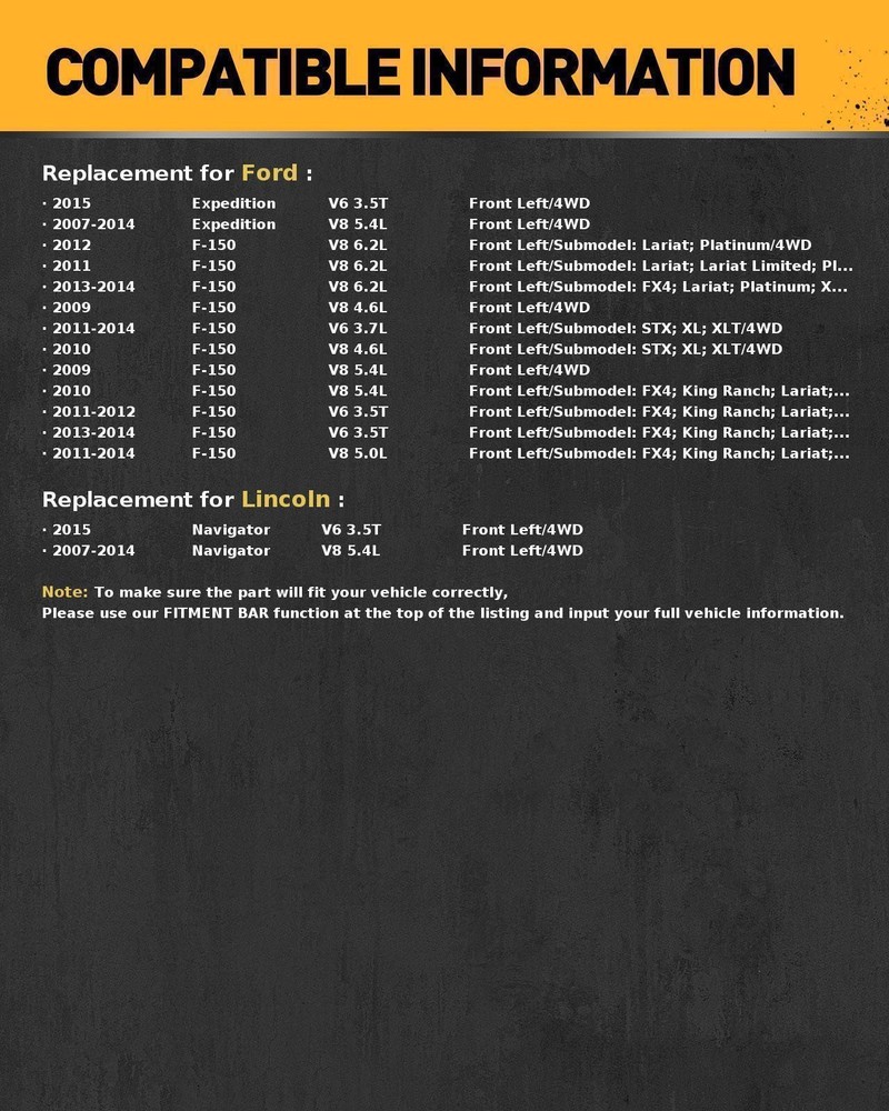 CV axles serve as the final link between the engine and the wheels, transferring power from the vehicle's transmission and differential to the wheels to drive the vehicle forward Increased transmission flexibility: With our half shafts, you can increase transmission efficiency by reducing unnecessary friction and energy losses Value for Money: Our steering gear offers excellent value for your investment, providing reliable performance at an affordable price Features: In order to ensure proper fit.Axle is measured 100% after assembly. Threads are precision rolled to ensure proper fit when axle nut is installed. Boot clamps are pneumatically crimped creating a perfect seal between the boot and housing. We Select Engineered (CSE) Technology ensures that all CV axles meet or exceed O.E. form, fit and function. High quality grease withstands high-temperature and high-torque demands to ensure long-lasting, reliable performance. Transmission seal diameter is precision-machined after heat treatment to ensure correct surface finish, promoting long seal life. Splines are precision rolled to ensure proper fit of axle into the mating hub and transmission, which eliminates installation hassles. Features & Details Machine Type: Car Items Included: 1x Front cv axle shaft - 66-21911x Front cv axle shaft - 66-2192 Manufacturer Part Number: Does not apply UPC: Does not apply Quantity: 2 Output Shaft Spline Count: 45 Superseded Part Number: 662191 Input Shaft Spline Count: 31 Placement on Vehicle: Front Brand: KAC Type: CV Axle Joint Shaft Assembly Interchange Part Number: 662191 Axle Nut Included: Yes OE/OEM Part Number: 7L1Z3B437A,AL1Z3A427B Manufacturer Warranty: 10 Years ABS Ring Included: Yes Compressor Length(IN): 24.93in/22in Key Benefits - Designed to fit for 2011-2014 Ford F-150 V8 5L, for 2013-2014 Ford F-150 V6 3.5T, and for 2011-2012 Ford F-150 V6 3.5T, ensuring a precise installation. - Made with durable materials, offering long-lasting performance and reliability on the road. - Equipped with ABS Ring and Axle Nut for complete integration and functionality with your vehicle's system. - Backed by a 10-year manufacturer warranty, providing peace of mind and assurance of quality. Compatibility For Ford: Ford F-150 2009 V8 4.6L (DriveType:4WD) Ford F-150 2009 V8 5.4L (DriveType:4WD) Ford F-150 2010 V8 4.6L (DriveType:4WD, SubModel:STX; XL; XLT) Ford F-150 2010 V8 5.4L (DriveType:4WD, SubModel:FX4; King Ranch; Lariat; Platinum; XL; XLT) Ford F-150 2011 V8 6.2L (DriveType:4WD, SubModel:Lariat; Lariat Limited; Platinum) Ford F-150 2011-2012 V6 3.5T (DriveType:4WD, SubModel:FX4; King Ranch; Lariat; Platinum; XL; XLT) Ford F-150 2012 V8 6.2L (DriveType:4WD, SubModel:Lariat; Platinum) Ford F-150 2013-2014 V6 3.5T (DriveType:4WD, SubModel:FX4; King Ranch; Lariat; Limited; Platinum; XL; XLT) Ford F-150 2011-2014 V8 5.0L (DriveType:4WD, SubModel:FX4; King Ranch; Lariat; Platinum; STX; XL; XLT) Ford F-150 2011-2014 V6 3.7L (DriveType:4WD, SubModel:STX; XL; XLT) Ford F-150 2013-2014 V8 6.2L (DriveType:4WD, SubModel:FX4; Lariat; Platinum; XLT) Ford Expedition 2007-2014 V8 5.4L (DriveType:4WD) Ford Expedition 2015 V6 3.5T (DriveType:4WD) For Lincoln: Lincoln Navigator 2007-2014 V8 5.4L (DriveType:4WD) Lincoln Navigator 2015 V6 3.5T (DriveType:4WD) What's Included 1x Front cv axle shaft - 66-2191 1x Front cv axle shaft - 66-2192 Installation Guide - Ensure the vehicle is parked on a flat and stable surface. - Safely raise and support the vehicle using appropriate jack stands. - Remove the wheel and disconnect the brake components as necessary. - Detach the old CV axle from the hub assembly carefully. - Install the new CV axle by aligning it with the hub and securing it with the axle nut provided. - Reconnect the brake components and reinstall the wheel. - Test drive the vehicle to ensure the installation is performed correctly. Important Notes - Verify the part numbers OE 7L1Z3B437A, AL1Z3A427B, and interchange 662191 to ensure compatibility with your vehicle before purchase. - It is recommended to have a professional mechanic perform the installation for optimal results. - Please adhere to all safety guidelines and wear appropriate protective gear during installation. - Inspect all vehicle components involved for wear and damage before replacing the CV axle. Payment Shipping Return Policy Contact Us Important Points 1) we accepts all major credit cards via PayPal: MasterCard, Visa, American Express and Discover. 2) We will only ship to the confirmed PayPal shipping address given with the payment. Please make sure your PayPal and eBay address is correct. If not, please correct it before payment. Thank you. 3) If you want to ship to another address, please change your PayPal shipping address before you make payment. 4) To avoid initiating an unpaid item claim, please pay within 7 days. 5) Custom duties, taxes, or charges are not included in the cost you pay to us. We only ship this item to United States ! 1. We ship to your eBay address. Each package will be shipped by UPS or Fedex with tracking number. 2. Ship within 1 business day once payment completed. Orders placed on weekend will be shipped within 3 days. 4. Seriously promise: Refund or resend will be offered if item still not arrive in 7-10 business days. Just send us an email ,we will give you a satisfied solution as soon as possible. If you send us an e-mail, it will be answered within 48 hours during our working hours. Please feel free to contact us if you have any questions: Dear my friend,we appreciate your support.And our goal is service you well and give you a pleasant shopping time in our store. ✅Dear customer, when you want to return or exchange goods (Please contact us first, instead of directly initiating a dispute) 1: Contact the seller first 2: Send pictures: outer packaging&scanned labels&item itself&with complete accessories, etc necessary condition Rule A: The original packaging of the item is in an unused state. Rule B: The outer packag
