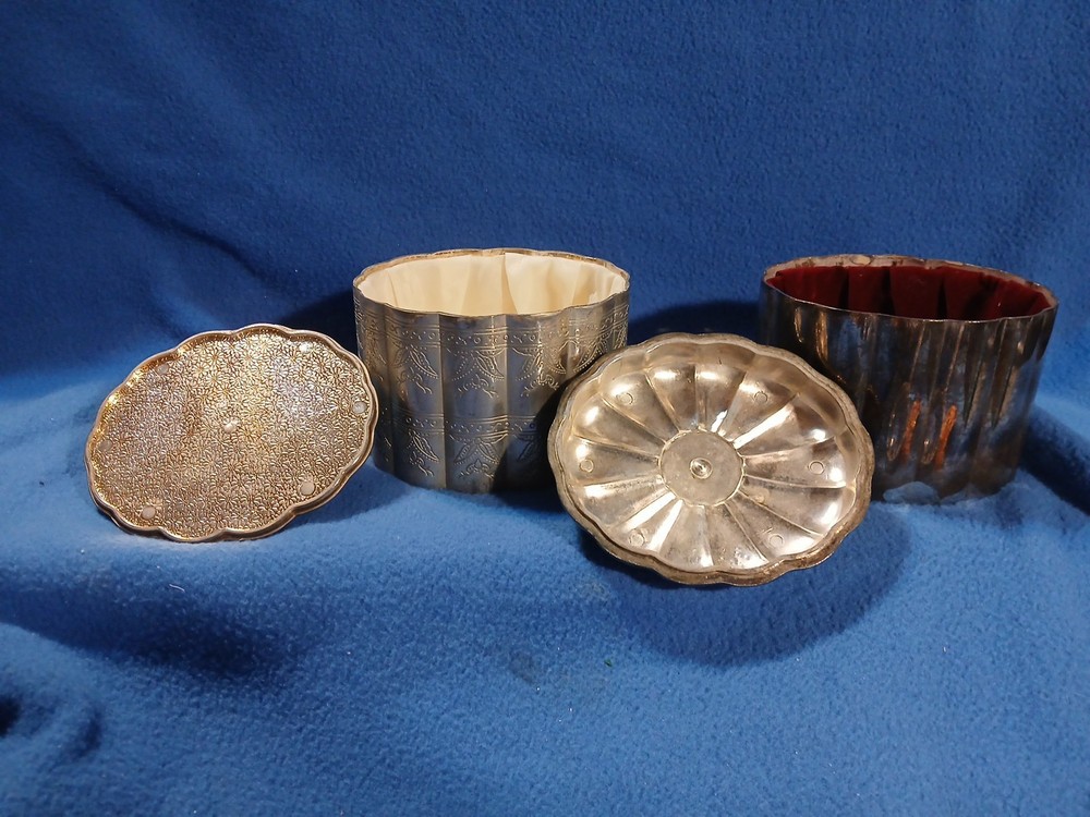 This set of 2 International Silver Company trinket boxes features an oval shape with a red and white silk and velvet lining. The silver plated boxes are adorned with an engraved design and have a lid for secure closure. Perfect for all occasions, these medium-sized jewelry boxes are a part of the Keepsake Boxes collection, adding elegant decor to any room in your home. Ideal for storing small treasures or jewelry, these ornate boxes exude a touch of vintage charm from the late 20th century.
