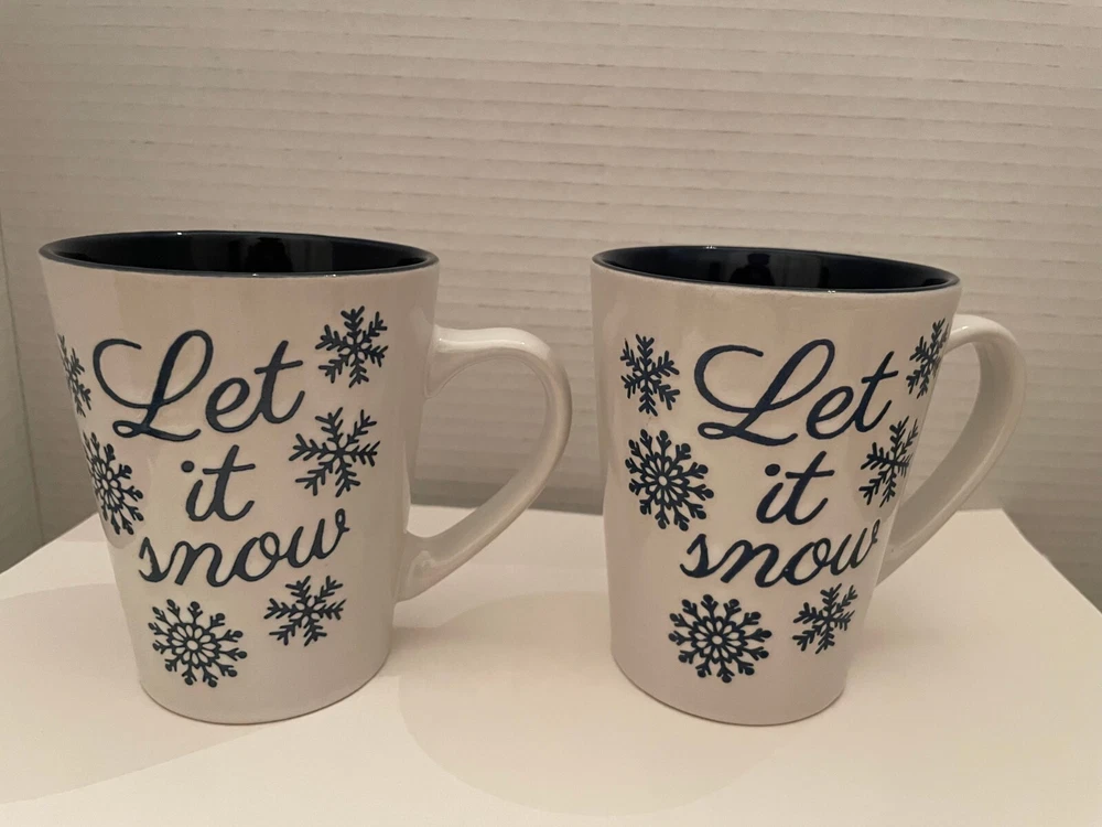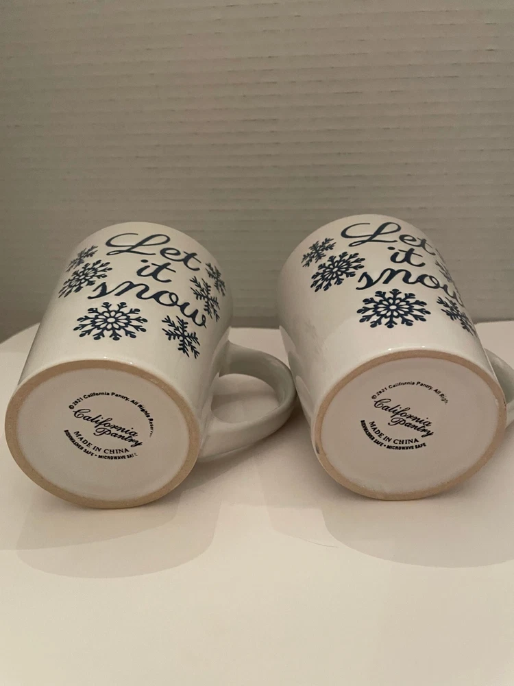 Set of 2 California Pantry 'Let It Snow' Holiday Season Mugs. Color: White with Navy Letters and Snowflakes. Condition: Used. Very Good Condition. Like new. Zoom in on photos. Great for coffee, tea or hot chocolate bar. Great for the collector in your family. Buyer pays shipping. I SHIP FAST Weight: l lb. 8 oz. Packing will increase overall weight. Buyer location determines final shipping costs. Height: 4 1/4" Care: Dishwasher Safe Microwave Safe Made in China Zoom in on pictures. Please message questions or concerns. Working to earn your Positive Feedback with Value, Variety and Service. Thank you for your consideration. Have a great day.