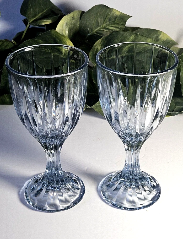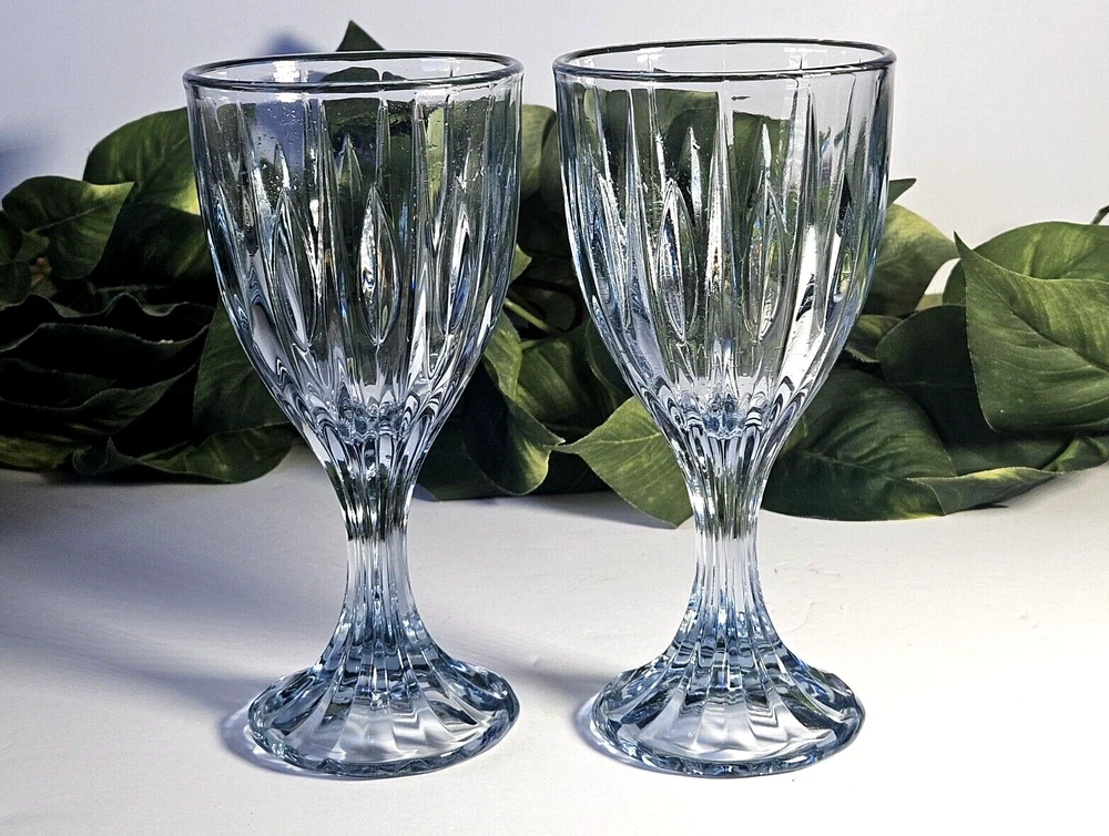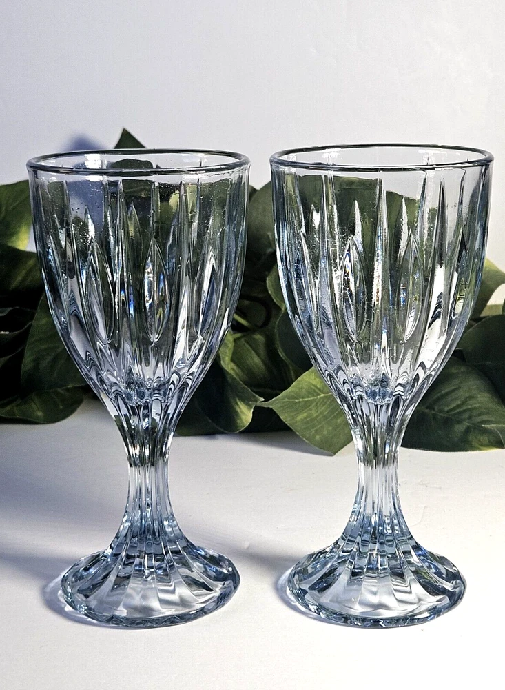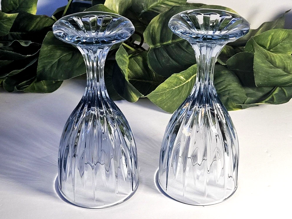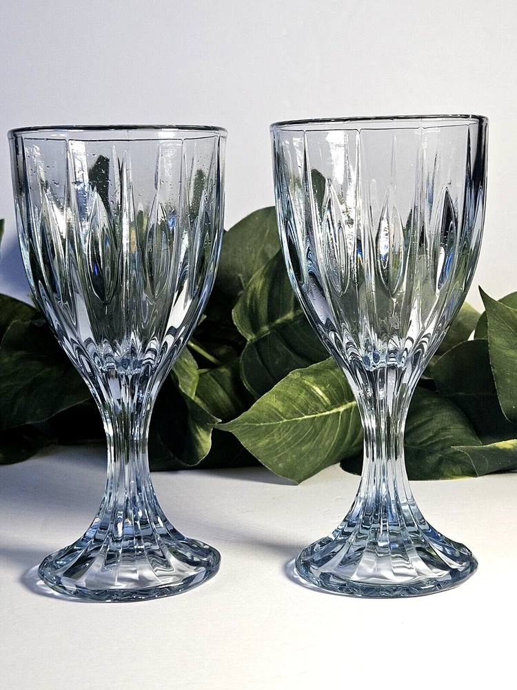 Add elegance to your dining table with this set of two light blue Noritake Entree Crystal wine goblets. Made in Japan in 1993, these round-shaped goblets are perfect for all occasions. The glossy finish and cut pattern make them a great addition to your collection. Each goblet has a capacity of 8 oz and stands at a height of 6.75 inches. They are not signed but are original pieces from the Noritake brand. The production technique is pressed glass and the style is retro. These goblets are perfect for anyone who loves elegant glassware and want to add a touch of sophistication to their home.