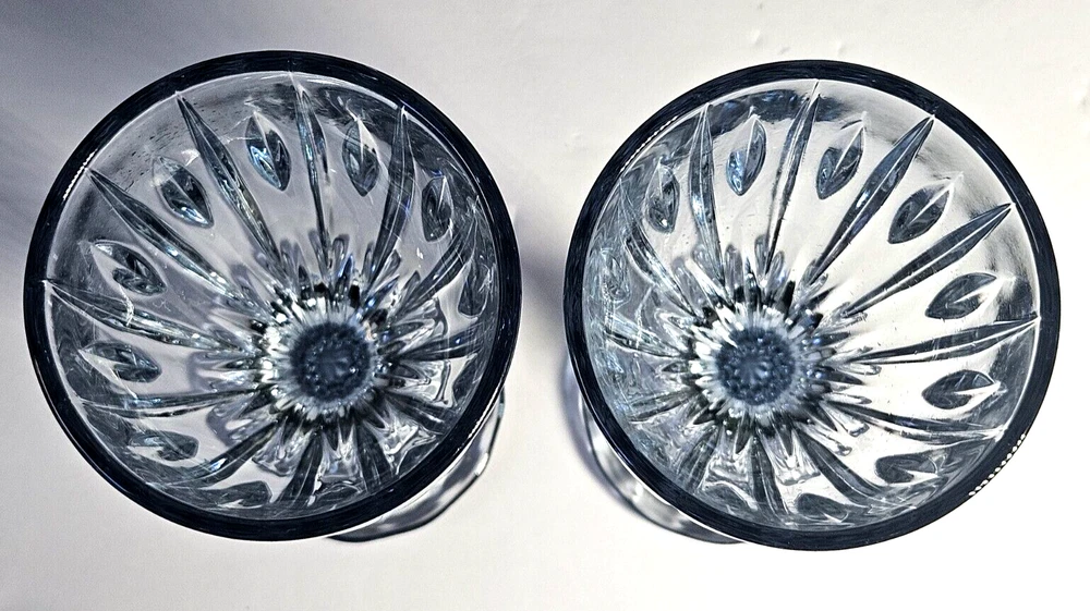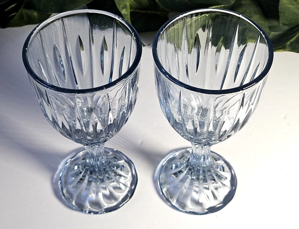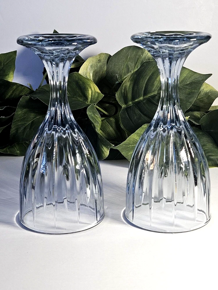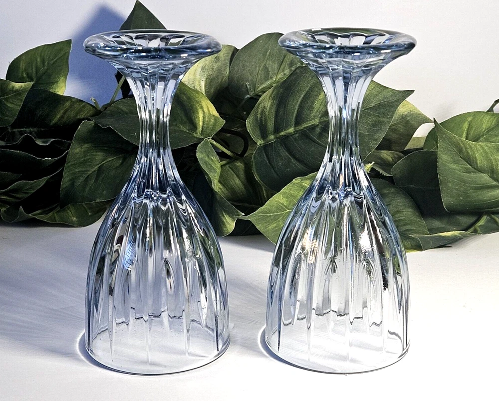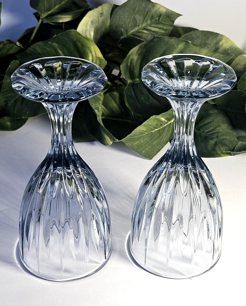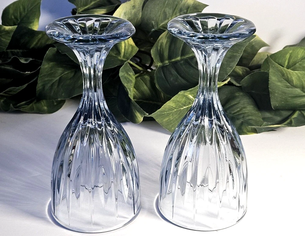 Add elegance to your dining table with this set of two light blue Noritake Entree Crystal wine goblets. Made in Japan in 1993, these round-shaped goblets are perfect for all occasions. The glossy finish and cut pattern make them a great addition to your collection. Each goblet has a capacity of 8 oz and stands at a height of 6.75 inches. They are not signed but are original pieces from the Noritake brand. The production technique is pressed glass and the style is retro. These goblets are perfect for anyone who loves elegant glassware and want to add a touch of sophistication to their home.