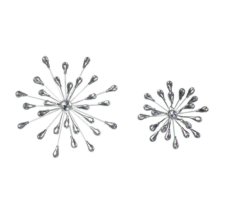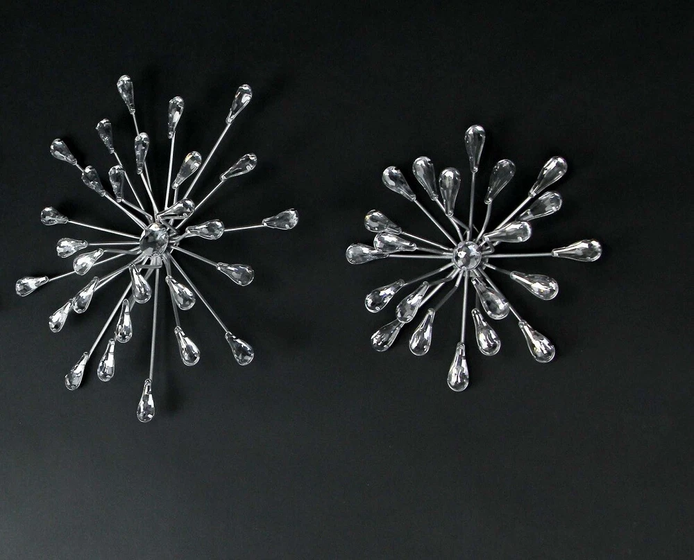 NOTE - DUE TO THIS IS A SET OF 2 this item is being sold at a reduced price. OVERALL SIZE - Medium - 9 Inch Diameter, 1.5 Inch Depth - Small - 6 Inch Diameter, 1.5 Inch Depth DURABLE MATERIAL - Crafted of Metal For Years of Maintenance Free Display EYE CATCHING DECOR - Polished Silver Finish For Starbursts That Brighten Up Any Room EASY TO HANG - Triangular Metal Hangers Mounted on Each Sculpture Our eBay Store About Us Add to Favorite Sellers Set of 2 Silver Teardrop Starburst Rhinestone Jeweled Metal Wall Hanging Art Decorative Crystal Home Decor NOTE: DUE TO THIS IS A SET OF 2 this item is being sold at a reduced price. NOTE - DUE TO THIS IS A SET OF 2 this item is being sold at a reduced price. OVERALL SIZE - Medium - 9 Inch Diameter, 1.5 Inch Depth - Small - 6 Inch Diameter, 1.5 Inch Depth DURABLE MATERIAL - Crafted of Metal For Years of Maintenance Free Display EYE CATCHING DECOR - Polished Silver Finish For Starbursts That Brighten Up Any Room EASY TO HANG - Triangular Metal Hangers Mounted on Each Sculpture NOTE: DUE TO THIS IS A SET OF 2 this item is being sold at a reduced price. Cheerful rays bursting with sparkling droplets out from the center creating uniquely beautiful wall accents. They might remind you of splashing rain, floating dandelions, or maybe even fireworks. Each piece consists of a sphere of metal rods with teardrop-shaped, faceted clear glass gems bursting outward from the center. They bring visual excitement to any room and a simply stylish impact just as they are, and they work well with your other wall decor. Hang each orb separately to tie a larger space together, or arrange them in a series to create a sophisticated and coordinated look. The medium one is 9 inches in diameter and the smallest one is 6 inches in diameter. All of them stick out 1.5 inches from your wall. These wall sculptures are perfect for those with an eye for the unusual and a modern sense of style. Product Details Color Silver Height 12 Length 12 Weight 0.75 LB