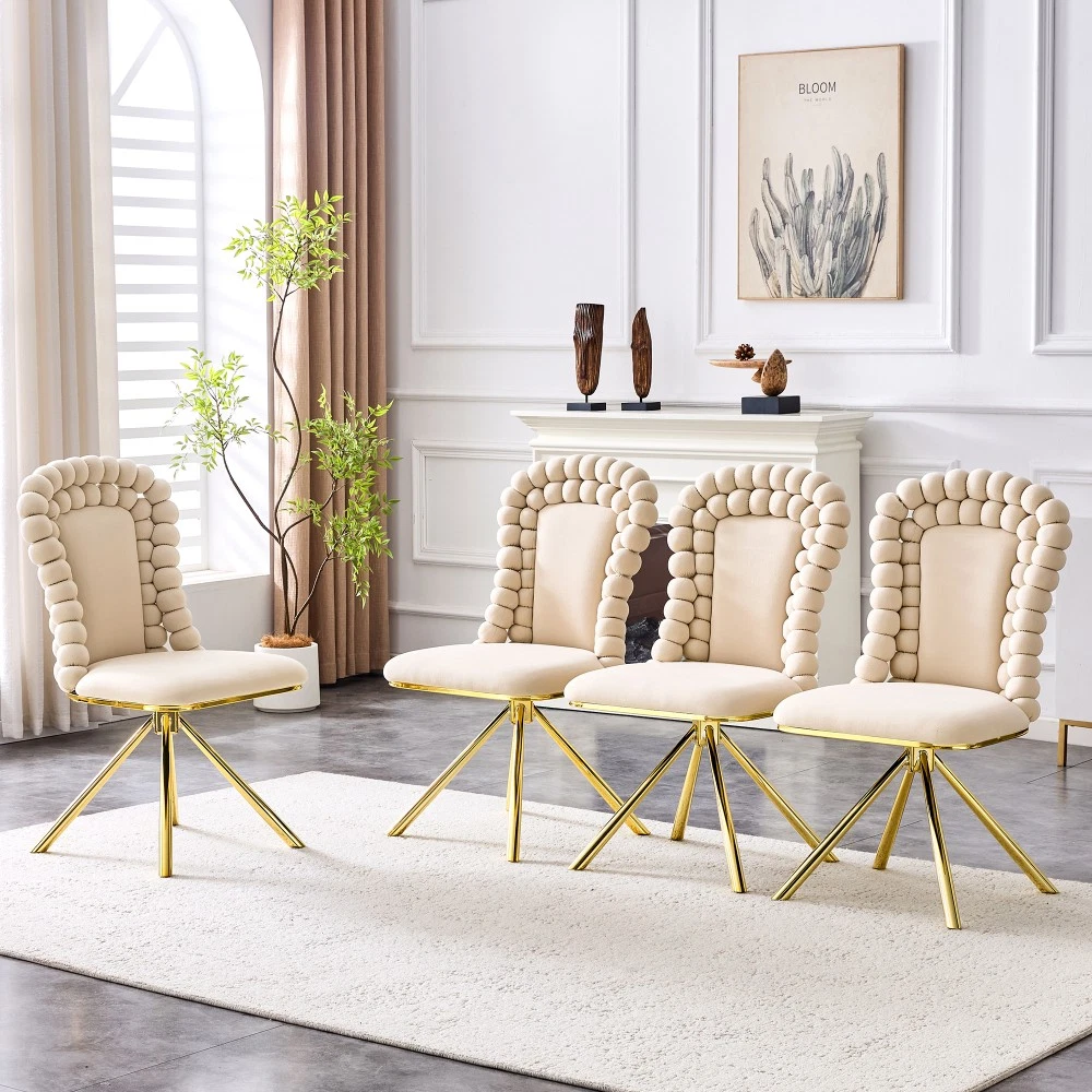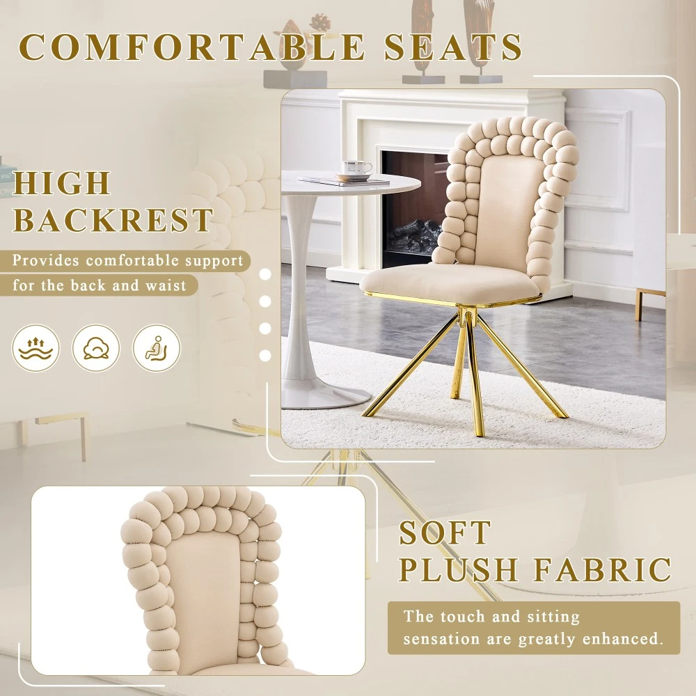 Set of 2 Orange Velvet Bubble Dining Chairs, Gold Metal Legs - Modern Upholstered Accent Chairs for Dining Room & Kitchen Elevate your dining space with this stunning set of 2 orange velvet bubble chairs! Blending artistic flair with luxurious comfort, these chairs feature a one-of-a-kind ball-chain bubble backrest, premium Dutch velvet upholstery, and sleek gold metal legs. More than just seating, they’re a striking statement piece that infuses your dining room, kitchen, or any living area with modern sculptural charm and vibrant personality—perfect for upgrading your home decor with style and functionality. Unique Ball-Chain Bubble Design & Artistic Appeal : Inspired by jewelry and modern art, each chair boasts a creative ball-link backrest crafted from plush round cushions, resembling a chain of delicate bubbles. This distinctive spherical tuft silhouette brings sculptural elegance to any interior, turning the chairs into an instant conversation starter. The intricate back structure not only catches the eye but also enhances the overall aesthetic, making them a focal point in both formal dining spaces and cozy kitchen nooks. Premium Non-Directional Dutch Velvet Upholstery : Upholstered in high-quality Dutch velvet, these chairs offer a superior texture that outshines ordinary velvets. The non-directional fabric has no shading effect or “nap,” ensuring a smooth, even appearance from every angle. Soft and plush to the touch, the velvet upholstery provides a luxurious seating experience, while the vibrant orange hue adds a pop of color that effortlessly brightens up any space. Luxurious Gold Metal Legs & Exquisite Craftsmanship : Supported by sturdy electroplated gold metal legs, the chairs exude chic contemporary glamour. The polished gold finish pairs beautifully with the orange velvet, striking a perfect balance between luxury and modern minimalism. Meticulously crafted with attention to every detail, from the spherical tufts to the smooth leg surfaces, these chairs showcase exceptional craftsmanship and a sophisticated aesthetic that elevates any decor. Ergonomic Design for All-Day Comfort : Designed with comfort at its core, the gently curved bubble backrest hugs your body to provide optimal lumbar support. The seat is thickly padded with high-density foam, ensuring superior comfort during long meals, gatherings, or casual relaxation. Whether you’re enjoying a family dinner or working at the kitchen counter, these chairs keep you cozy and supported throughout the day. Versatile 2-Piece Set for Easy Decor Upgrade : Each package includes 2 dining chairs, offering a convenient solution to instantly refresh your dining area’s ambiance. Their versatile design makes them easy to integrate into existing decor, complementing both modern and eclectic styles. Beyond the dining room and kitchen, they also work beautifully as accent chairs in living rooms or home offices, adding a touch of luxury wherever they’re placed. Detailed Product Specifications : - Color: Orange (Velvet) + Gold (Metal Legs); - Material: Metal + Premium Dutch Velvet + High-Density Foam (Filling); - Quantity: Set of 2; - Overall Assembled Dimensions: 20.50"L × 18.00"W × 38.00"H; - Product Weight (2 Chairs Total): 45.00 LBS; - Package Dimensions: 27.95"L × 22.05"W × 21.65"H; - Package Weight: 54.60 LBS; - Key Features: Unique Ball-Chain Bubble Backrest, Non-Directional Dutch Velvet, Electroplated Gold Metal Legs, Ergonomic Curved Back, Thick Foam Padded Seat, Artistic Statement Piece; - Suitable For: Dining Room, Kitchen, Living Room, Home Office (as Accent/Dining Chairs). Important Notes : - Manual measurement may result in minor reasonable deviations; please refer to the actual product for precise details. - The actual color may vary slightly from the images due to factors such as lighting conditions, screen settings, and resolution differences. - To preserve the velvet upholstery and gold finish, clean the chair surface with a soft brush or damp cloth; avoid using harsh chemicals or abrasive cleaners that may cause damage. - Assembly is required; detailed instructions and all necessary hardware are included for hassle-free setup. Worry-Free Purchase Guarantee : We stand behind the quality of this set of 2 orange velvet bubble dining chairs with a 1-Year Warranty. If you’re not completely satisfied with your purchase for any reason, we offer a 30-Day Free Return & Exchange Policy. Shop with confidence, knowing you’re getting a stylish, durable, and comfortable seating solution that elevates your home decor!