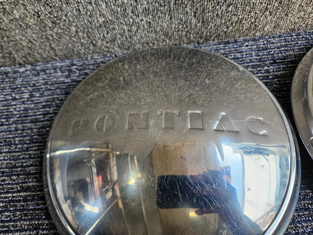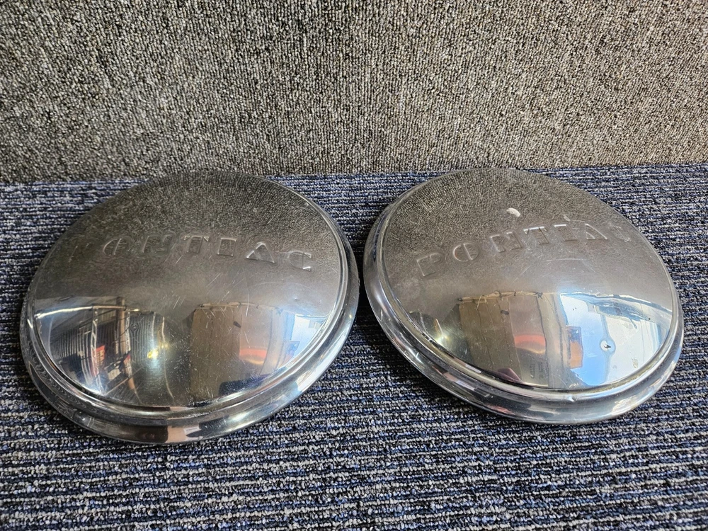 Set of 2 Pontiac Dog Dish Hubcaps Chrome 9.5in, Embossed Logo 1940s