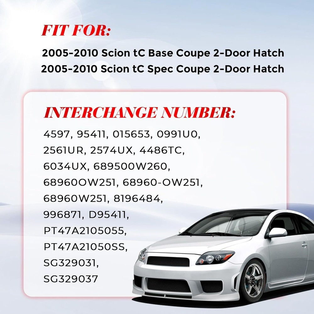 These lift supports are a perfect upgrade for the 2005-2010 Scion tC! Installation was quick, and they provide strong, smooth lifting power—way better than the worn-out OEM ones. The hatch stays open securely now, no more sagging. Great fit, no modifications needed. Highly recommend if your struts are failing!