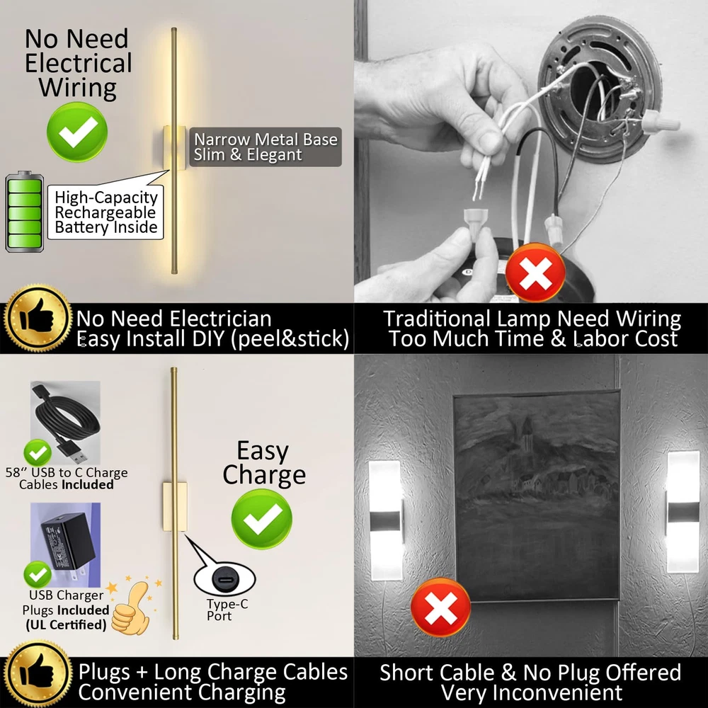 【Excellent Design】This set of 2 rechargeable wireless wall sconces use narrow base design which make the whole lamp looks slim and elegant. They are made of strong metal and dimmable. You could use remote control or touch switch to control light on/off, change brightness and color temperature among cold white/warm white/neutral white. 【Don’t Need Electrician and Super Easy to Install】These gold cordless wall sconces are battery operated so they don't need wiring. Installation iron plate was included you could fix it to wall by either double-sided tape or screws. As lamp back has magnetics so you just put lamp onto iron plate (magnetic connection). Done. Later it's also very easy for you to pull out the lamp from iron plate. The installation way by double-sided tape is suitable for almost every installation surface like painted wall, ceramic tile wall, wood surface, wall covering, glass surface, mirror etc. 【Super Easy to Charge】Each package includes 2 pieces of long (58’’) USB-C charge cables AND 2 pieces of charger plugs so it’s super easy to charge if you have outlet nearby. You could also pull wall sconce out from iron plate to charge. 【Long Endurance】Each battery operated wall sconce has big capacity battery inside. After full charged, lamp could keep working for 10~80+ hours (depends on brightness). Press down the touch switch on lamp could get lowest brightness. 【Various Applications】These modern and minimalist cordless wall sconces are ideal for living room, bedroom, corridors, entryway, bathroom, dining room, etc.