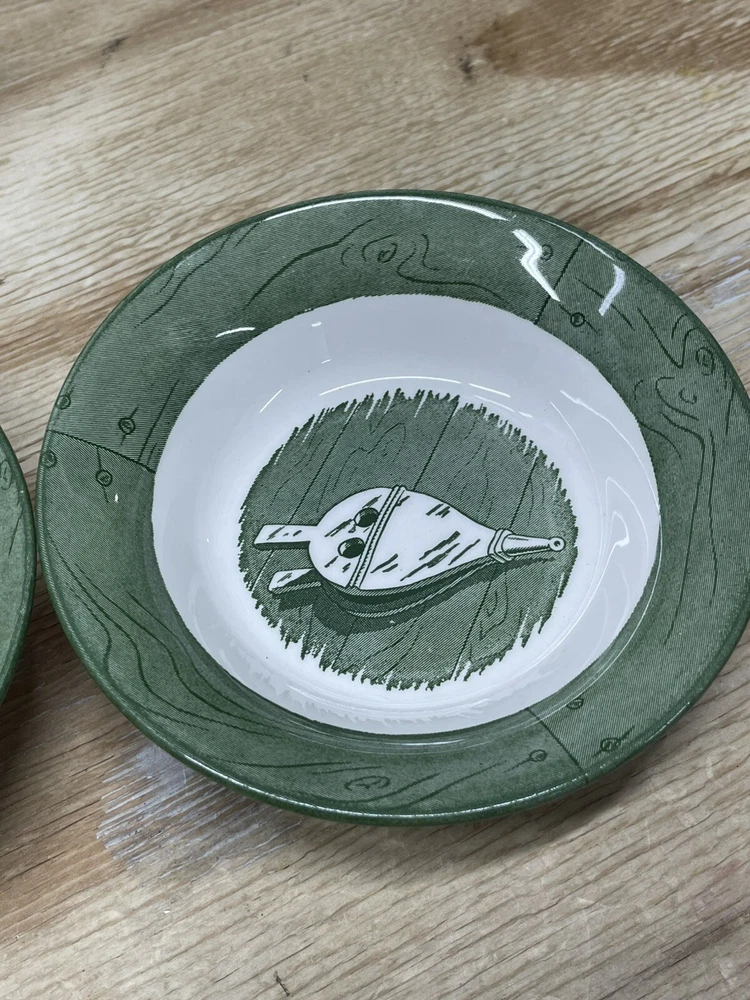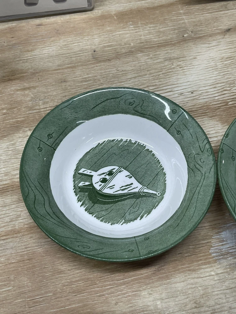 Add a touch of vintage charm to your dining table with this beautiful set of two round dessert and fruit bowls. The glossy green stoneware material is adorned with the Colonial Homestead pattern, making them perfect for all occasions. The bowls measure 5 5/8 inches in diameter and 1.5 inches in height, respectively. Crafted in the mid-20th century by Royal, a renowned brand in America, these bowls are original and boast a production style of art pottery. They are perfect for serving desserts and fruits and are sure to impress your guests. The set includes a fruit bowl and a dessert bowl, making it a great addition to your dinnerware collection. Hand wash only is recommended for care instructions. FAST SHIPPING! AUTHENTIC!