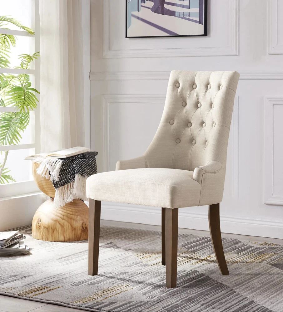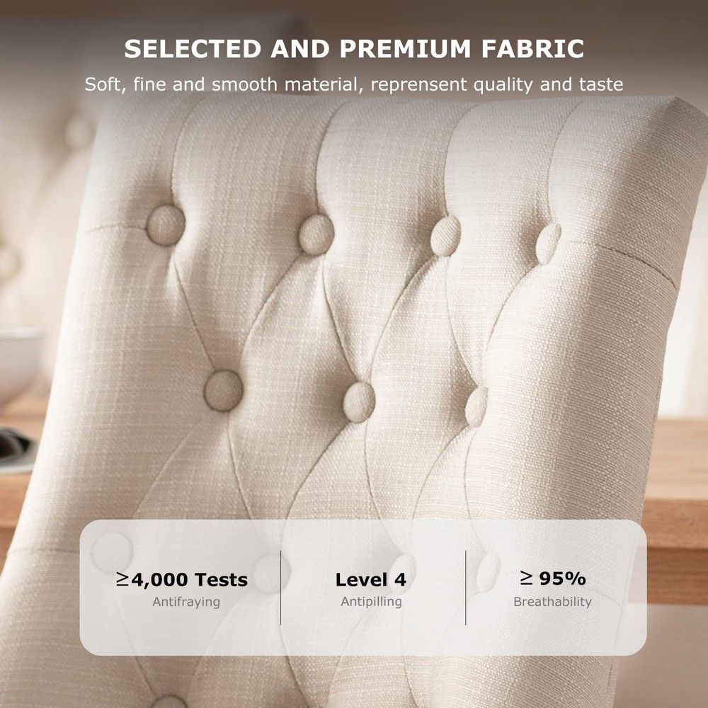 ELEGANT AND MODERN DESIGN: The dining side chairs strikes a curvaceous silhouette with a high back, sloping, integrated arms, and four rubberwood legs in a rich walnut finish. TUFTED AND PADDED DINING CHAIRS: Accented by deep button tufting and low-set arms. In the seat and back, cushioned foam padding provides comfortable support. SUPPORT UO TO 300LBS: Built to last, this attractive design features a solid wood frame that delivers consistent support and stands up to the demands of everyday use. VARIOUS APPLICATION SCENARIOS: These tufted chairs can not only be used in the dining room, but also used as accent chairs, reception chairs, and leisure chairs, etc. EASY TO ASSEMBLE AND EASY TO MOVE: Just need minor assembly. Our chairs for dining room are relatively lightweight, making them more convenient to transport and move around the space.