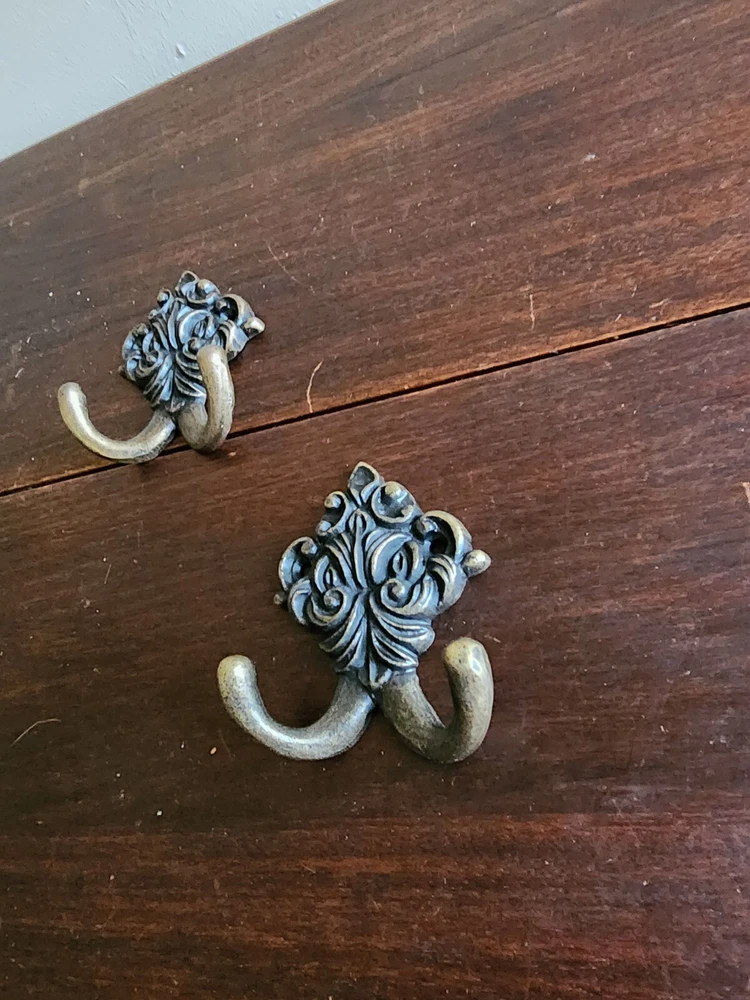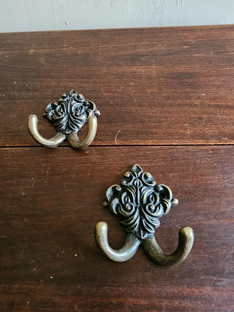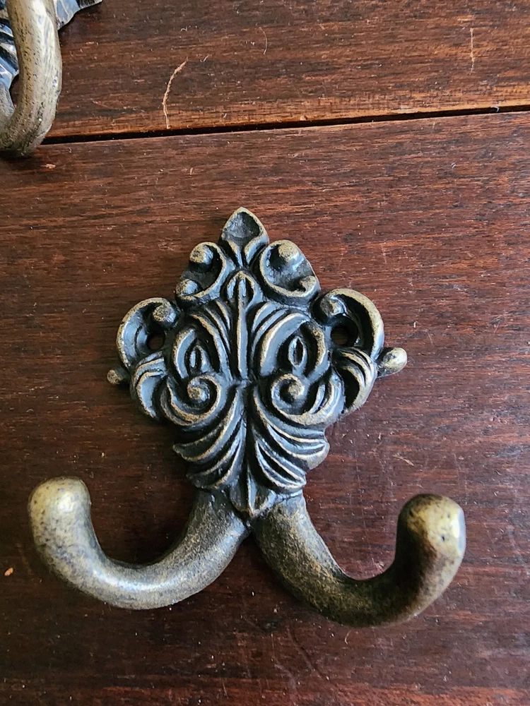 Set of 2 Wrought Iron Metal 2 Peg FLoral Wall Hanging Hook Coat/Towel Gold Tone