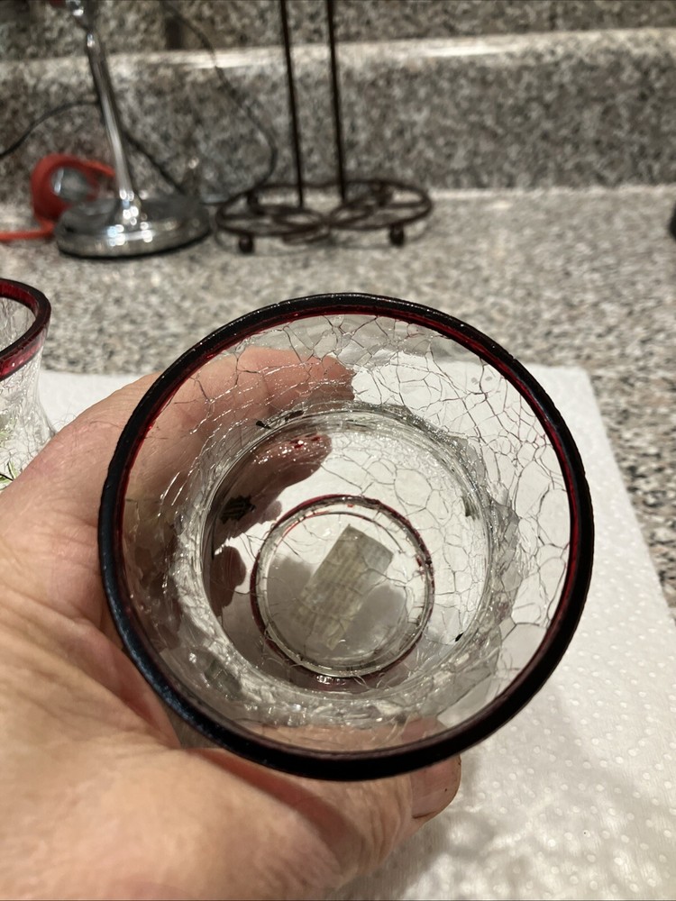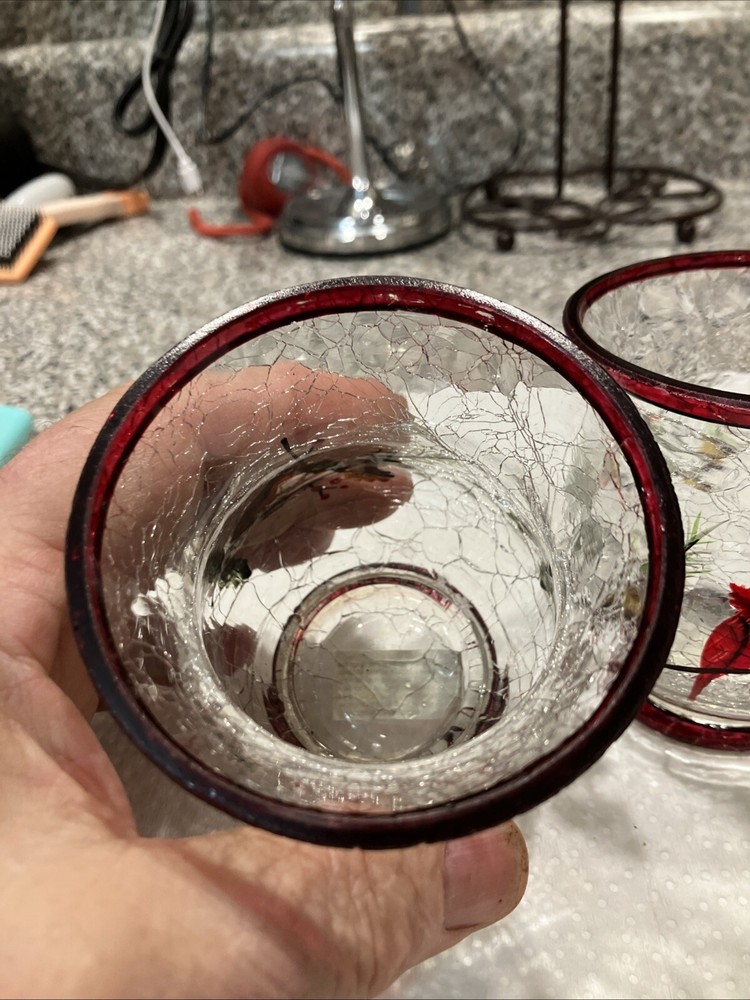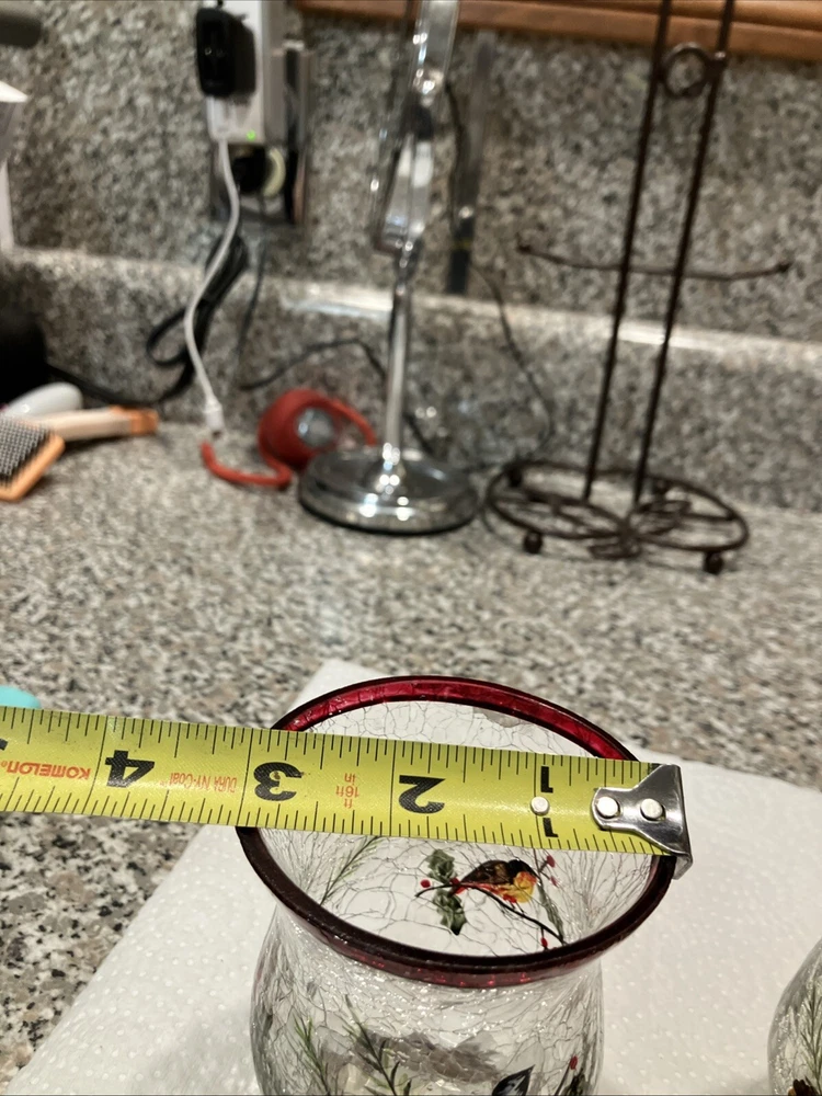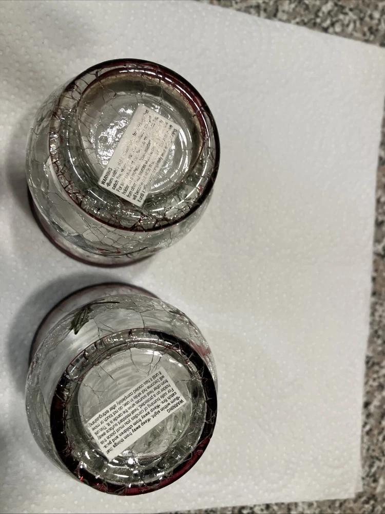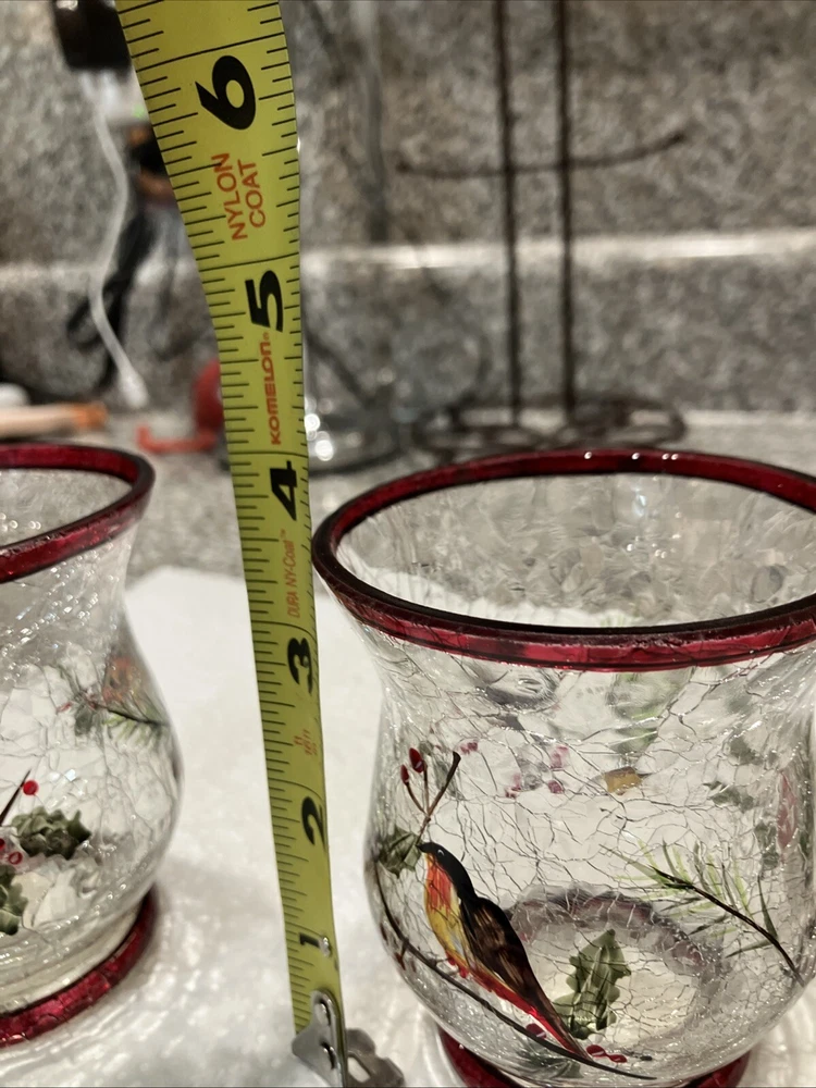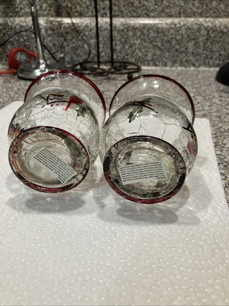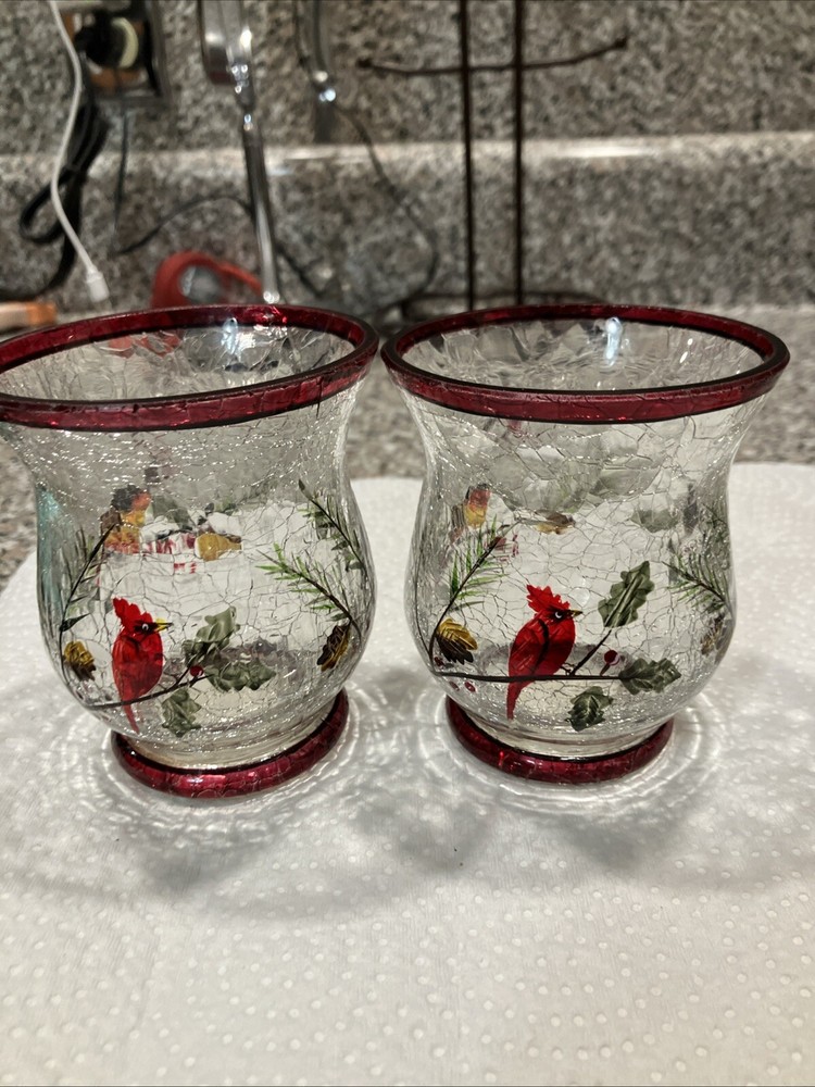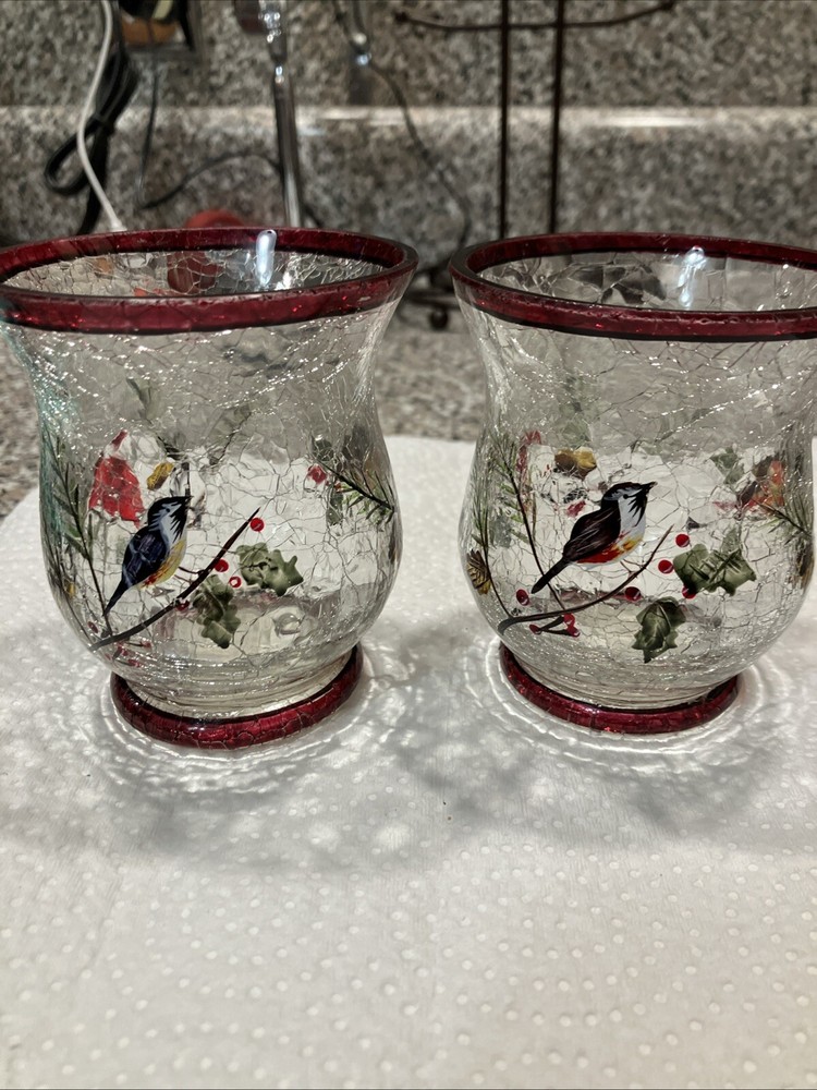 This set includes two large Yankee Candle candle holders made of cracked glass in a Christmas theme featuring birds. Perfect for adding a festive touch to your holiday decor.