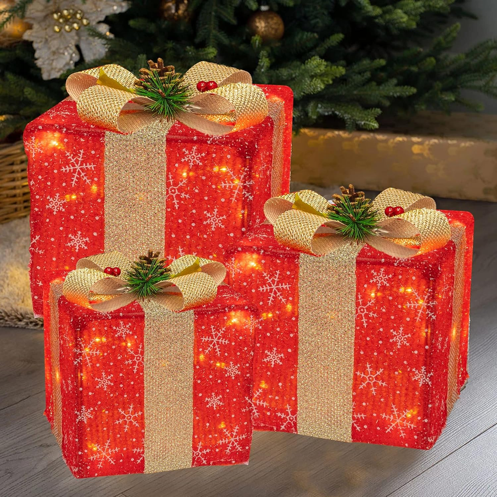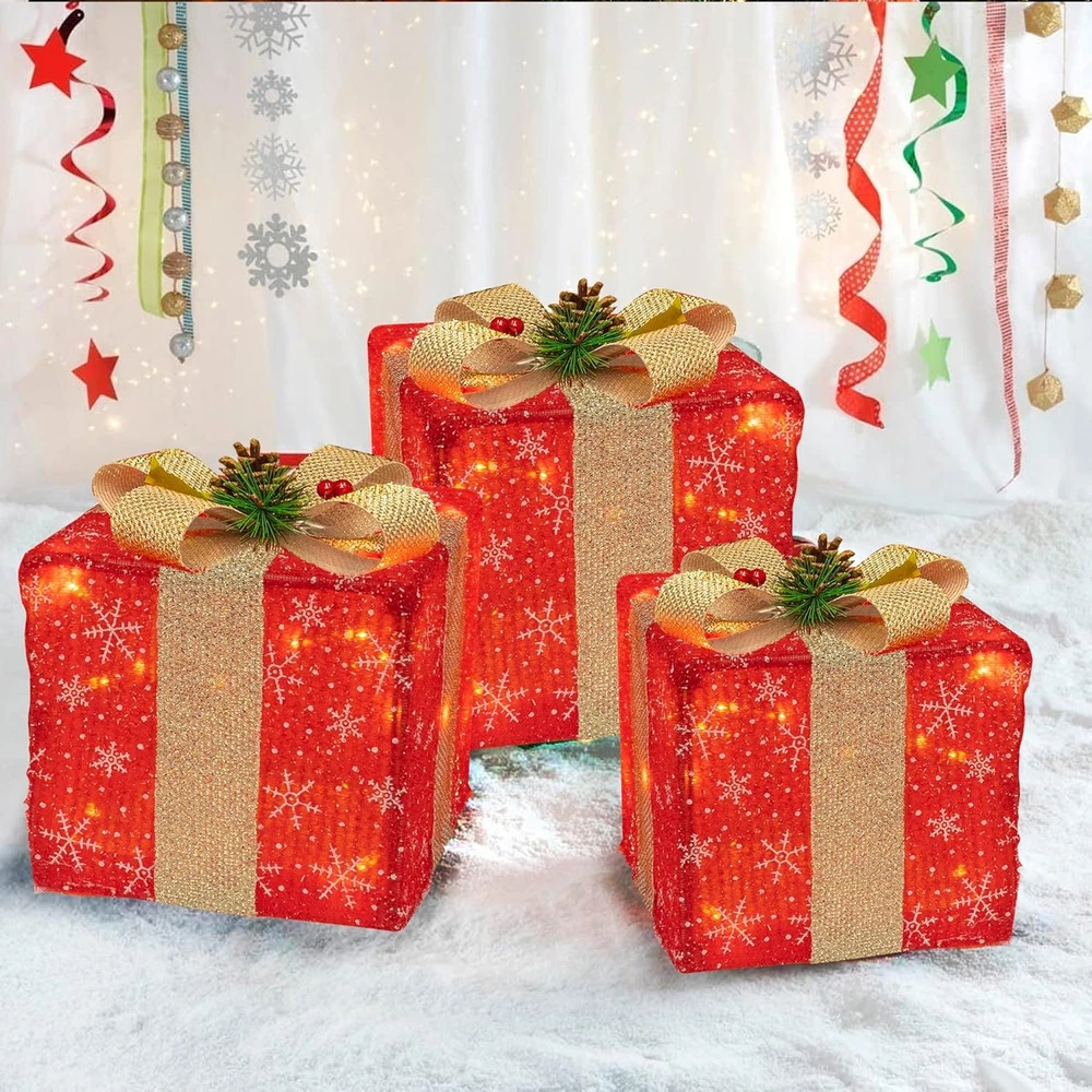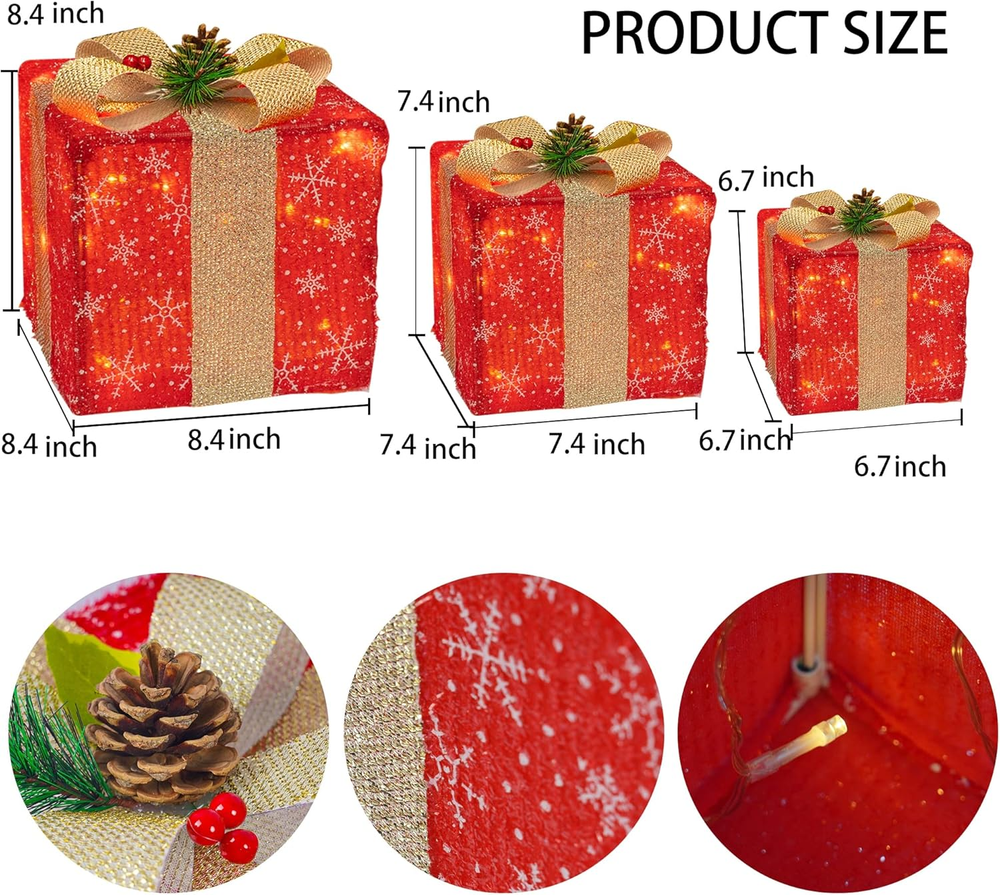 Store New Arrivals Add to Favorite View Feedback Contact Set of 3 Christmas Lighted Gift Boxes, 50 LED Christmas Box Decorations, Presents Boxes with Ribbon Bows Christmas Decorations for Xmas Tree, Yard, Home, Indoor Outdoor Holiday Decor Description Item model number 1 Item dimensions L x W x H 4 x 5 x 6 inches Number of Light Sources 60 Number of Items 3 Color red Light Color Warm White Material Metal, pine Style Christmas Red Item Weight 2.33 pounds Product Dimensions 4 x 5 x 6 inches Theme Christmas Frame Material Metal Christmas Lighted Gift Box: 3 sets of exquisite lighted red present boxes (with gillter ribbon bows and red berry, pine cone) are the best choice for Christmas, weddings, banquets, anniversaries, and Christmas decorations for houses, offices, restaurants, hotels, bars, etc. Decorate this beautiful lighted christmas packages in your home, they will be the perfect Christmas decoration for your home or yard. Classic Design: Stacking combination of boxes of different sizes is pleasing to your eyes. The interior is equipped with 50 warm white LED lights, which can emit a wonderful fairy-tale sparkle effect on New Year's Eve. Used it in courtyards, homes, shops, offices, hotels, restaurants, bars, etc, making your Christmas time memorable and full of fun. Foldable Gift Boxes: No tools need for install, is easy to set up the lighting present box. Just flip the box over, stretch the box, and then insert the white metal rod in the box into the diagonal hole to fix it, and place it wherever you want to decorate. When not in use, it can be folded for storage, which basically does not take up space and is convenient for storage. Ideal Gradient Size: Large Christmas gift box measures 8.4"L x 8.4"W x 8.4"H, Medium 7.4" L x 7.4" W x 7.4" H, and Small measures 6.7" L x 6.7" W x 6.7" H. Their sizes can be overlapped one by one to facilitate storage, carry and save space. At the same time, we use the power plug to replace the battery box, which is easy to install. When used them together, your Christmas Eve will shine, creating a warm, happy and unforgettable Christmas Eve. Safe Plug In: Just plug it into a power socket, you can easily illuminate the house or outdoor layout without worrying about replacing the battery. In addition, the comfortable white light can work under low pressure, is safe to touch, will not overheat after long-term use, and is also safe for children, the elderly and pets. The luminous gift box contains 50 safe and transparent LED, which are brighter than battery-powered lights. Product description ABOUT US We offer the best prices around on high quality products. Our E-store includes media such as books, movies, music and games while offering electronics, toys, sporting apparel, clothing, tools, general home, garden items and more. SHIPPING We are always working hard to ensure your package arrives as soon as possible. Please understand that some factors like weather, high postal traffic, and the performance of shipping companies are outside of our control. We offer free shipping to the lower 48 states and ship within 2 business days of payment, usually sooner. We do not accept P.O. Boxes. Please provide a physical address. For shipping outside of the continental USA, we only use eBay's Global Shipping Program.The item is shipped to KY and then sent to the rest of the world. International customers are responsible for all duties and taxes. Continue to check out in order to calculate costs for shipping the item to your country. Messages regarding eBay's Global Shipping Program MUST be directed at eBay EXCLUSIVELY. RETURNS We offer a 30-Day Return Policy on items which you are not completely satisfied with. You have the option for a full-refund or an exchange of the item. No returns are available on items shipped outside of the USA. PAYMENT We accept PayPal. CONTACT US This page content is yet to come Please ad us to your favorite seller and visit again later Thank You CUSTOMER SATISFACTION We try our very best to make sure every customer is completely satisfied. If there's a problem, message us! We're happy to help. WE ACCEPT Copyright © 2021 AutoDS. | All Rights Reserved