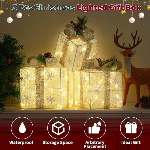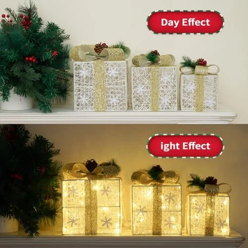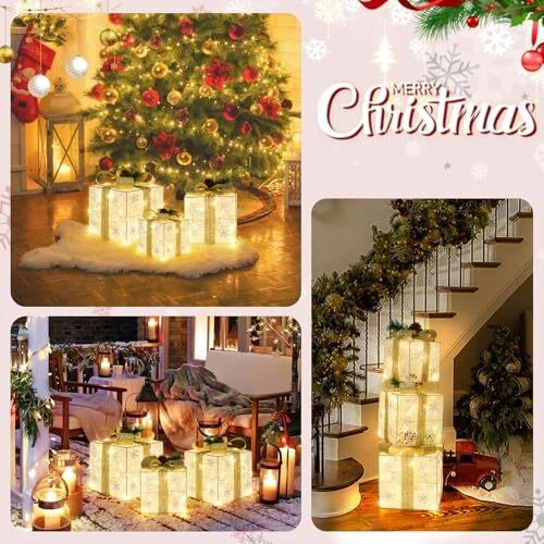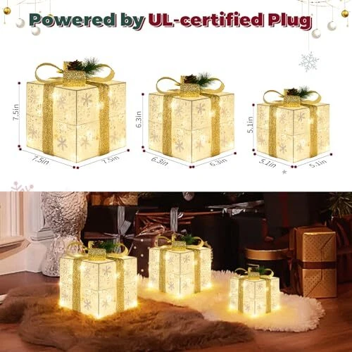 30 Days Return Policy Fast Delivery Trusted seller Set of 3 Christmas Lighted Gift Boxes, 60 LED Light Up Snowflake Champagne Gold Strap Box Decorations for Outdoor Indoor Christmas Tree, Yard, Home Decor Product Description Specific dimensions: Large size: 7.5 inches x7.5 inches x7.1 inches, Medium size: 6.1 inches x6.1 inches x5.9 inches, Small size: 5.1 inches x5.1 inches x4.9 inches. It can be stacked one by one for easy storage and space saving 3 gift box sets with lights: Each package contains 3 gift boxes with lights of different sizes, decorated with a total of 60 warm white LED lights. Gorgeous lights shimmer with gold, reflecting shimmering light to create a fairy tale like effect at night, satisfying all your Christmas decoration needs Great Christmas decoration design: The Christmas light gift box is completely handmade. The gift box is wrapped in shiny metal wire and glowing LED beads, and a fluorescent ribbon is designed at the top of the box. Ensure that your Christmas gift box attracts attention wver it is placed Wide application: Outdoor Christmas decoration gift boxes are suitable for various settings; They can be used to decorate Christmas trees, front doors, living rooms, fireplaces or cabinets, and even come in handy for weddings or other occasions Best Christmas Gift: Illuminate Gift Box Decorated and packaged in a beautiful colored box, perfect as a gift for your loved ones, colleagues, and friends Shipping Returns Payment Shipping Shipping is FREE to all addresses other than APO/PO boxes in the lower 48 states. All our stock ships from US-based warehouses. Shipped via USPS or UPS (depending on location and package weight) Unless stated otherwise, all orders will ship within 24-72 hours of your payment being processed. Check our feedback to see the great reviews of FAST shipping we offer. Returns As our valued customer, we will do our best to make sure the product you receive arrives to you on time and as expected. If you are not satisfied with your purchase, please contact us within 30 days of receiving your order to process a return. Payment We currently accept payment via eBay managed payments only. Once payment is cleared, we will dispatch your shipment within 1-3 business days. Please refer to the "Shipping" tab for more information regarding shipping speed to your destination.