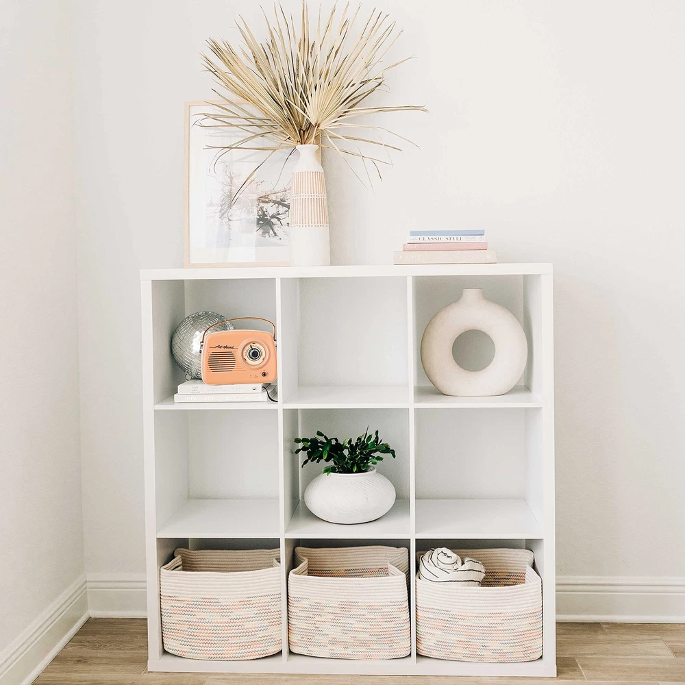 All-Purpose Cube Storage Baskets – These 15” x 10” x 9” rope storage baskets are ideal for keeping your everyday home life more organized and provide plenty of compact storage space for arts and crafts, classroom decor, kid’s toys, or nursery storage and room accessories Elegant Cotton Coiled Rope Cubes Design – A vintage feel with a modern touch these coiled rope baskets are made from tightly-woven cotton that’s strong, and more durable and resistant than regular wicker storage basket, linen closet organizers and storage baskets with lid. Vintage Colors to Match Every Style – Charming and stylish these versatile storage organizer bins come in 7 exclusive colors to match your home closet or style including 3-tone gray, blue / off-white, rainbow / off-white, pink / off-white, brown / off-white, gray / black, gray / honey, gray / off-white, honey / off-white, light honey / off-white, black, white and rainbow. Discrete, Built-In Carry Handles – These fabric rope baskets for storage also feature slim hand holds built right into the sides of each round basket for a seamless look that’s also functional. Perfect for picking up toys or carrying items around the house. Store Books, Blankets, Clothes, and More – The decorative shelf cube bin is deeper and taller than standard cotton rope baskets to provide plenty of depth when you’re storing home goods, hobby supplies, diapers, clothes, classroom storage or arts and crafts.
