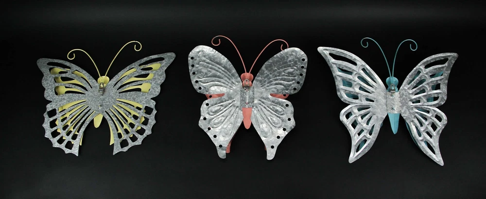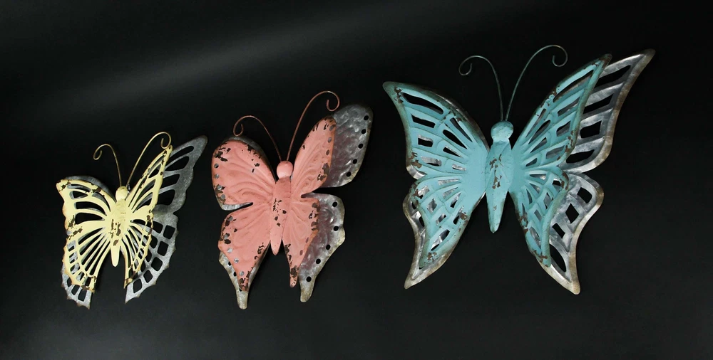 Whether displayed inside your home or on a garden fence or exterior wall, this trio of butterflies will make a big buzz! Creatively crafted from metal, they feature embossed designs, galvanized zinc coated accents and coral, yellow and blue enamel painted finished, purposefully distressed to give them vintage character. Each piece has a keyhole mount on the back for easy hanging. These butterflies are a fresh alternative to canvas prints or framed photos and bring a calming element of nature to your decor. The coral butterfly measures 16.5 inches high, 15.75 inches long, 0.75 inches deep, the yellow one is 16.5 inches high, 19.25 inches long, 0.75 inches deep, and the blue one is 16.5 inches high, 19.25 inches long, 0.75 inches deep. Our eBay Store About Us Add to Favorite Sellers Set of 3 Distressed Finish Metal Butterfly Wall Hangings Galvanized Zinc Accents OVERALL SIZE - Coral - 16.5 Inches High, 15.75 Inches Long, 0.75 Inches Deep. Yellow - 16.5 Inches High, 19.25 Inches Long, 0.75 Inches Deep. Blue - 16.5 Inches High, 19.25 Inches Long, 0.75 Inches Deep. DURABLE MATERIAL - Crafted of Metal For Years of Maintenance Free Display DISTRESSED EDGES - On Enamel Finish Gives an Antiqued Feel FARMHOUSE FINISH - Galvanized Zinc Finish for a Great Country Look PERFECT ACCENT - For Your Home, Porch or Patio Whether displayed inside your home or on a garden fence or exterior wall, this trio of butterflies will make a big buzz! Creatively crafted from metal, they feature embossed designs, galvanized zinc coated accents and coral, yellow and blue enamel painted finished, purposefully distressed to give them vintage character. Each piece has a keyhole mount on the back for easy hanging. These butterflies are a fresh alternative to canvas prints or framed photos and bring a calming element of nature to your decor. The coral butterfly measures 16.5 inches high, 15.75 inches long, 0.75 inches deep, the yellow one is 16.5 inches high, 19.25 inches long, 0.75 inches deep, and the blue one is 16.5 inches high, 19.25 inches long, 0.75 inches deep. Product Details Color Multicolored Height 16.5 Length 15.75 Weight 2.95 LB