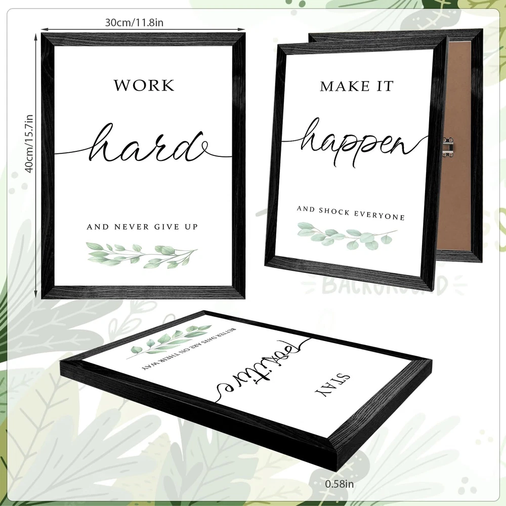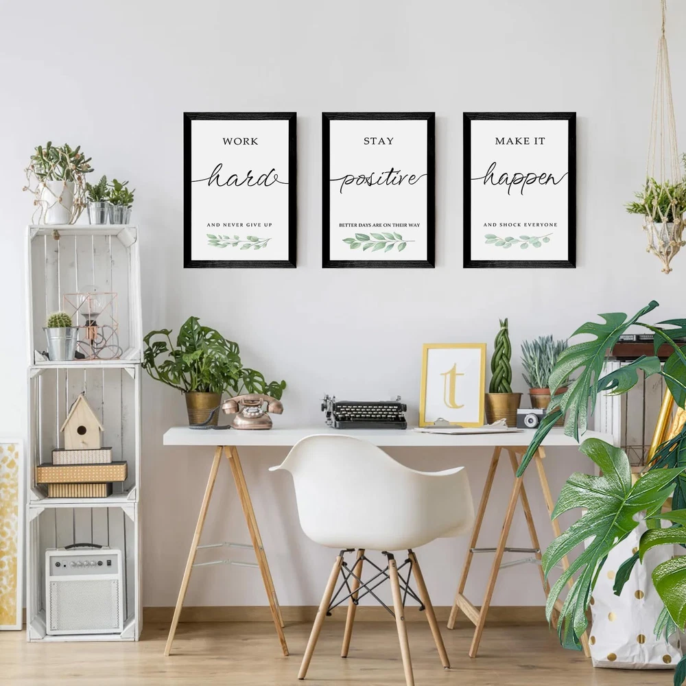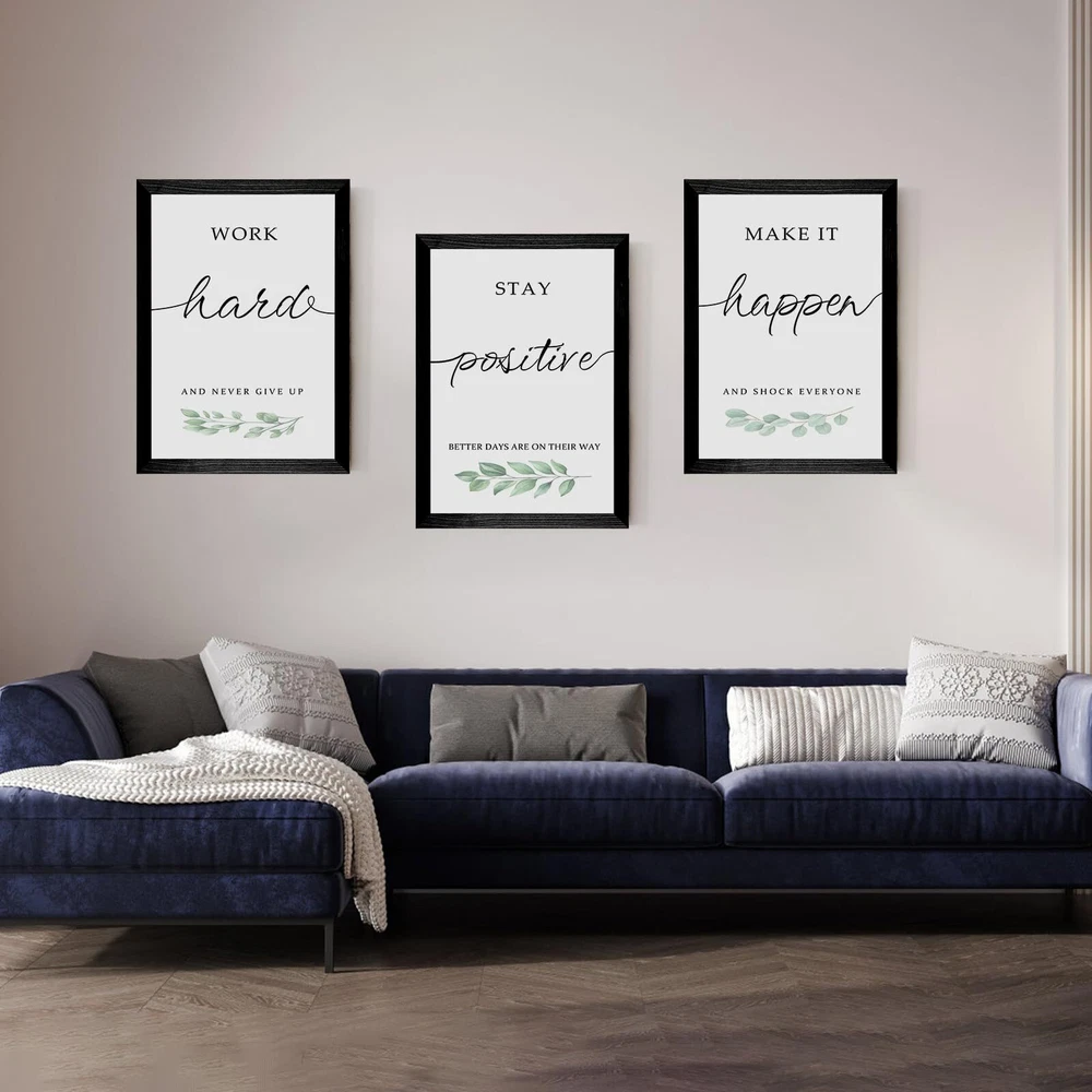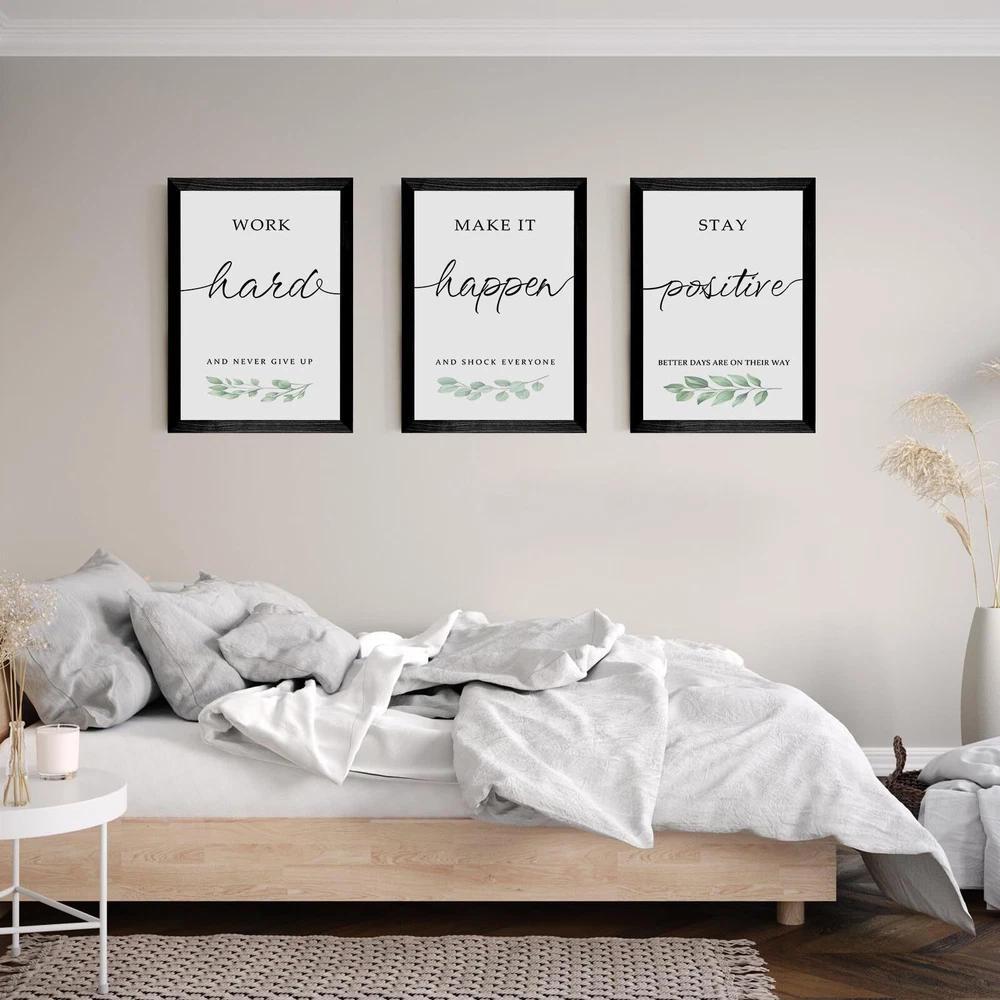 1 【FRAMED INSPIRATIONAL WALL ART】Set of 3 motivational framed wall art decor for bedroom conbined green botanical and motivational quotes,which remind you to keep a positive mindset and enhance self-confidence,bright colors gives your room an instant make-over and will be the perfect decorations for your bedroom and office. 【PERFECT DESIGN】The inspirational quote artwork wall decor for office contains 3 motivational wall slogans. Read them every day when you wake up,they will bring you full motivation throughout the day. 【HIGH QUALITY】You will get a set of 3pcs inspiring wall art with size 12"x16" to promote your taste in daily life,high quality wooden frame with canvas, printed clearly without fading, lightweight, wear-resistant and tear resistant, suitable for long-term use. 【EASY TO HANG】The inspirational signs over bed wall art decor for bedroom can be hanging easily, the hook is on the back of each framed,which you just need to put your favorite painting in the frame and hang it on the wall.The inspirational wall art is perfect for office,living room,home office, bedroom, classroom etc. 【WONDERFUL GIFT】These positive quotes above bed wall decor must be the perfect choice as a housewarming gift, Christmas gift, New Year gift, birthday gift, Valentine's Day gift, Thanksgiving gift to your family and friends,the special and meaningful inspirational wall art gifts will leave a deep impression on them definitely.