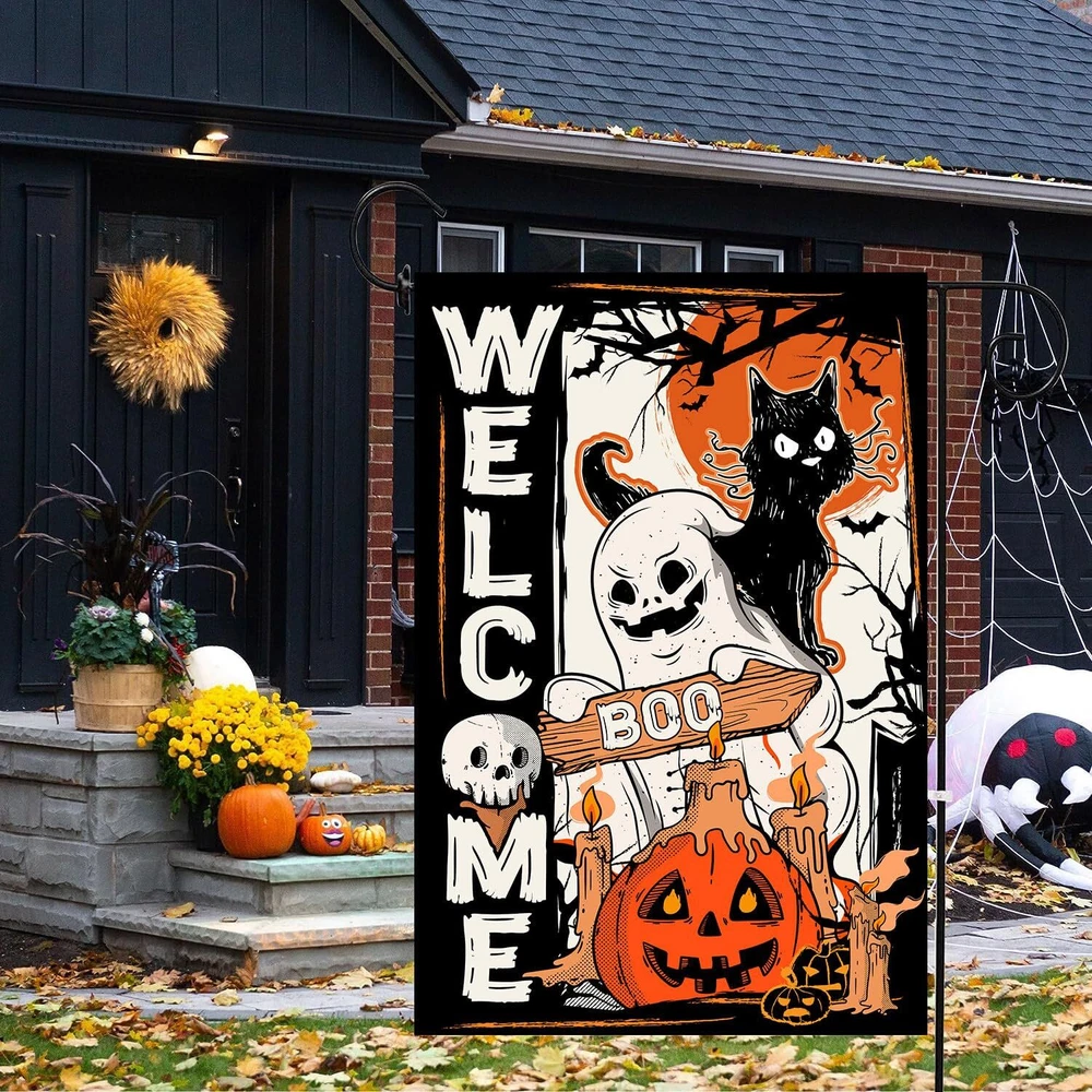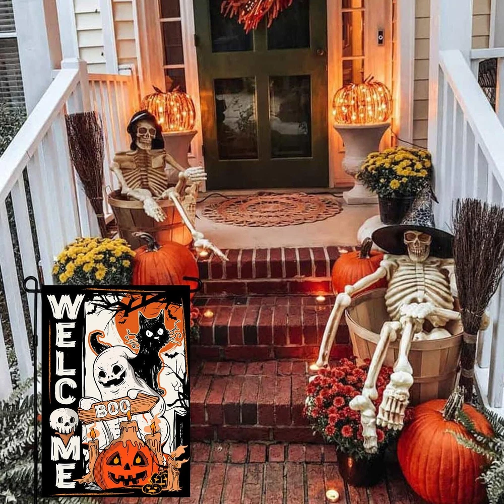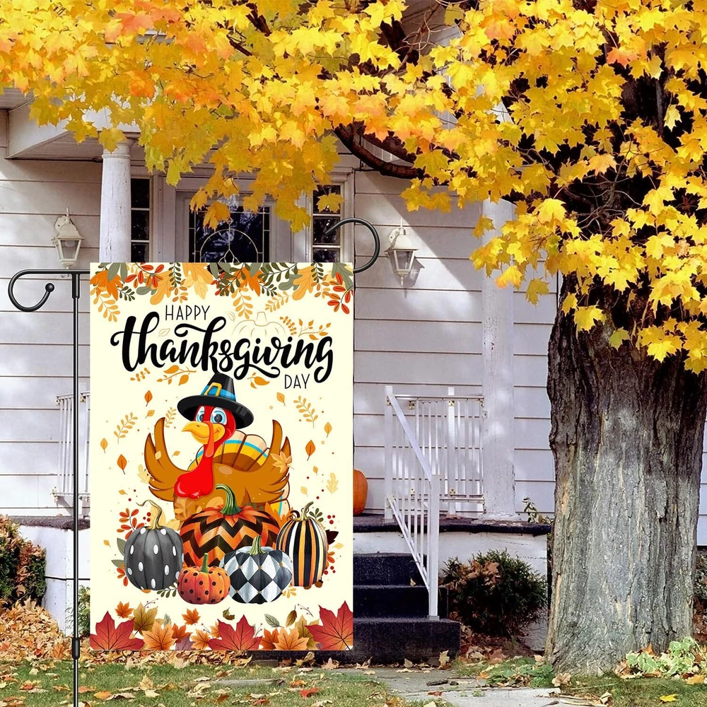 Set of 3 Halloween Garden Flag, Thanksgiving Garden Flag, Christmas Garden Flag 12" x 18" DOUBLE SIDED: Design is double sided with the image printed and visible from both sides and text also reads correctly from both EASY TO INSTALL: Set of 3 Flags have wide hanging sleeve, and fit all standard sized garden flag pole stand (stand not included). DURABLE AND HIGH QUALITY: Halloween Garden Flag, Thanksgiving Garden Flag, Christmas Garden Flag are also double stitched around so it can last season after season out in the sun. Made of washable , weather resistant as well as fade resistant. BEAUTIFULLY GARDEN FLAG: Beautifully detailed garden flag is the easiest solution to maintain a timeless look of your garden for Halloween, Thanksgiving, Christmas as well as offering a welcome stop to your visitors in a distinctive way! It will definitely catch eyes of your neighbors and friends, and create a wonderful look for your garden, yard, balcony and patio area. EASY TO INSTALL: The flags feature a sleeve at top for use with any standard flag pole or stand, easily slip the flags through the holes on either of the top sides to hang them on your garden flag stand.