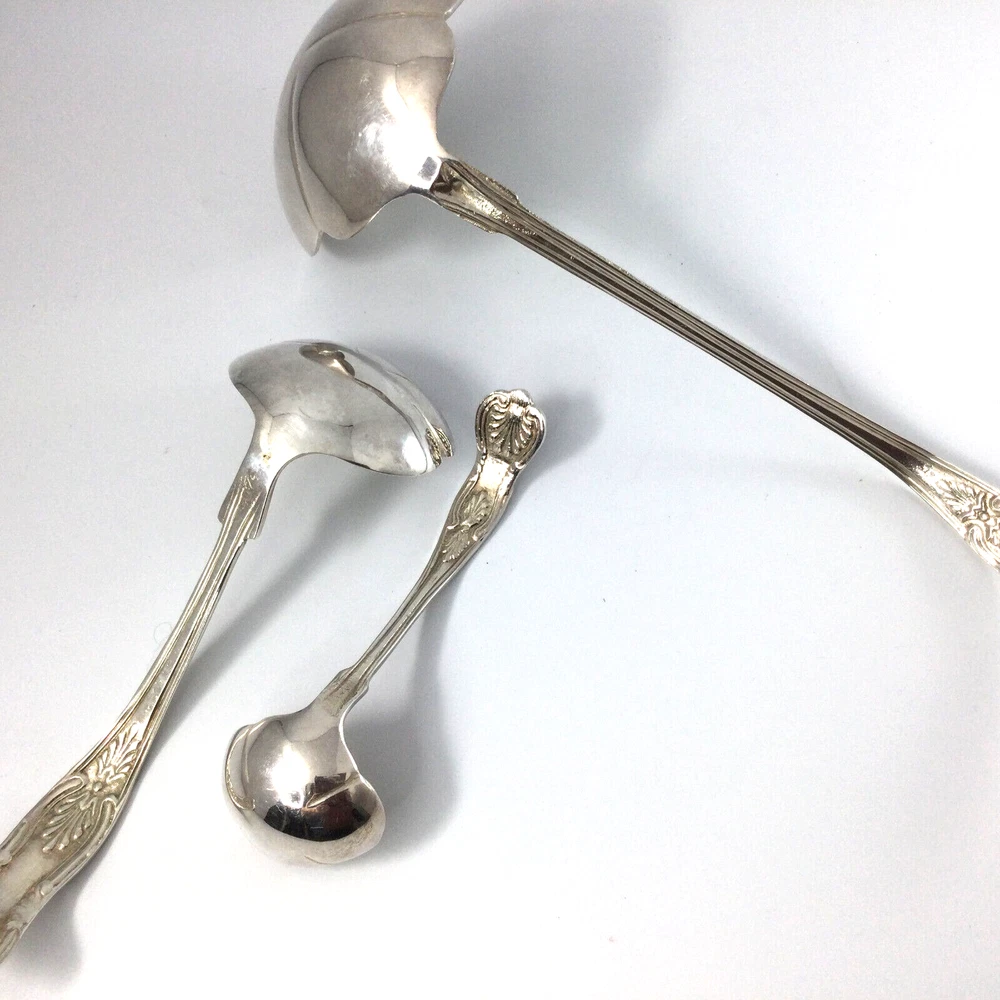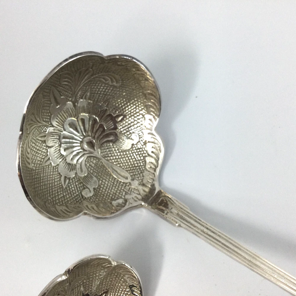Set of 3 Ladles Serving Utensils Stainless Steel Scalloped Edges. Very good condition, no damage. The biggest is 11" L, medium one is 8" L and smallest is 5" L. Beautiful floral design on inside part of all ladles. InvN/GS/4