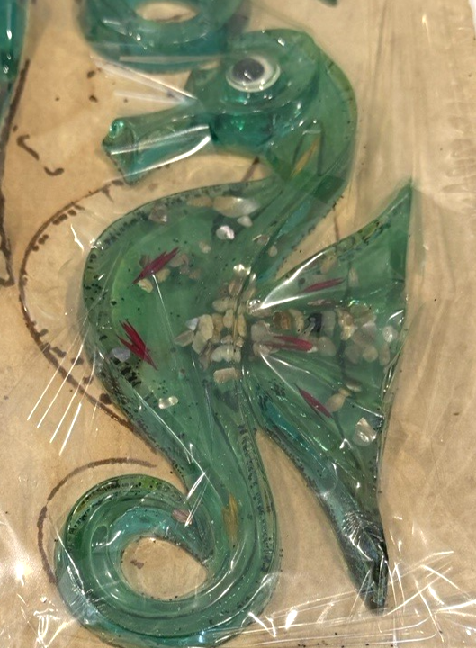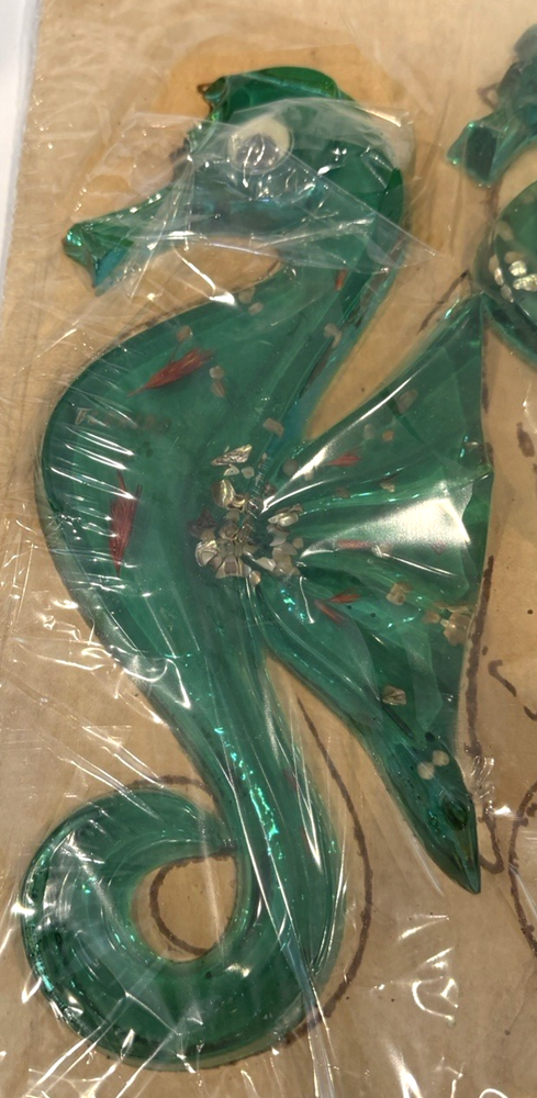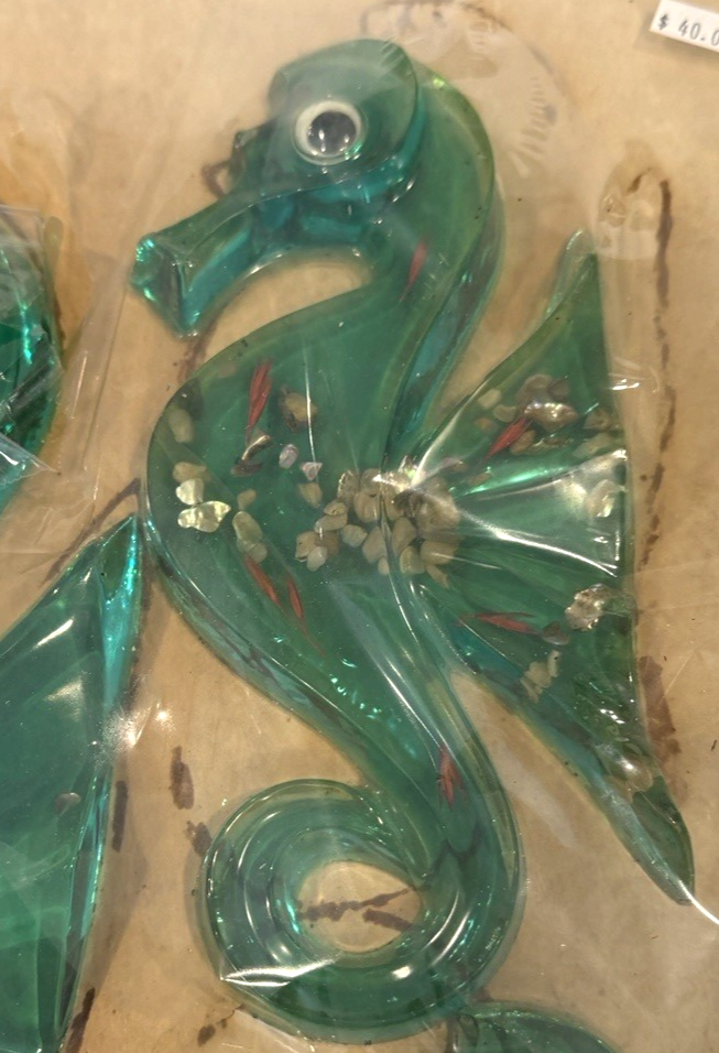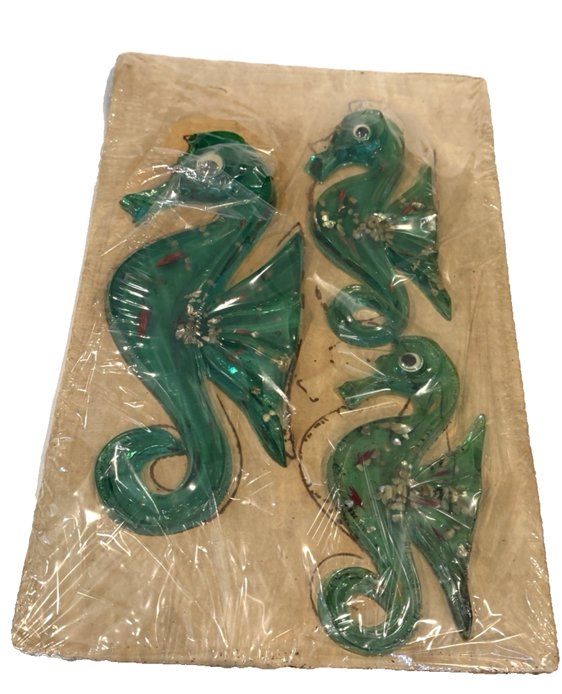 This set of 3 MCM Green Lucite Sea Horse Wall Plaques features a unique design made from mixed materials, including abalone shell accents. The plaques showcase a vibrant green color and a Mid-Century Modern style, perfect for adding a touch of retro charm to any space. Made in the United States post-1940, these original pieces come in their original packaging, making them a rare and collectible addition to any decor. Smoke free home