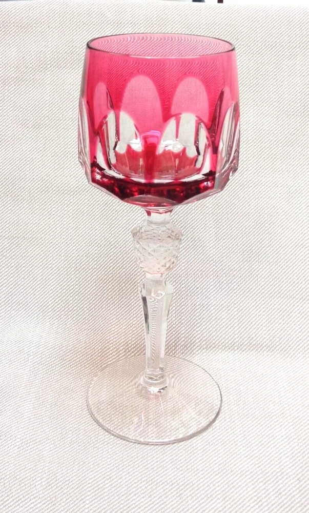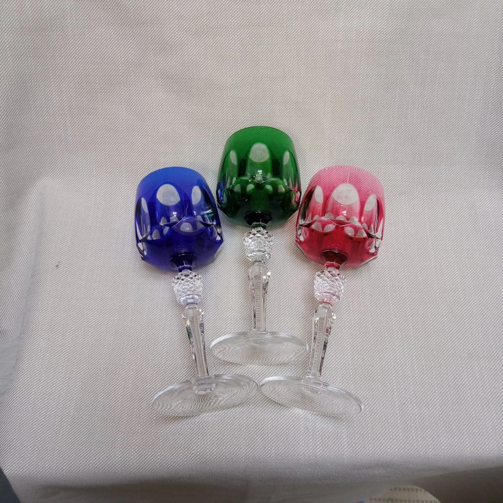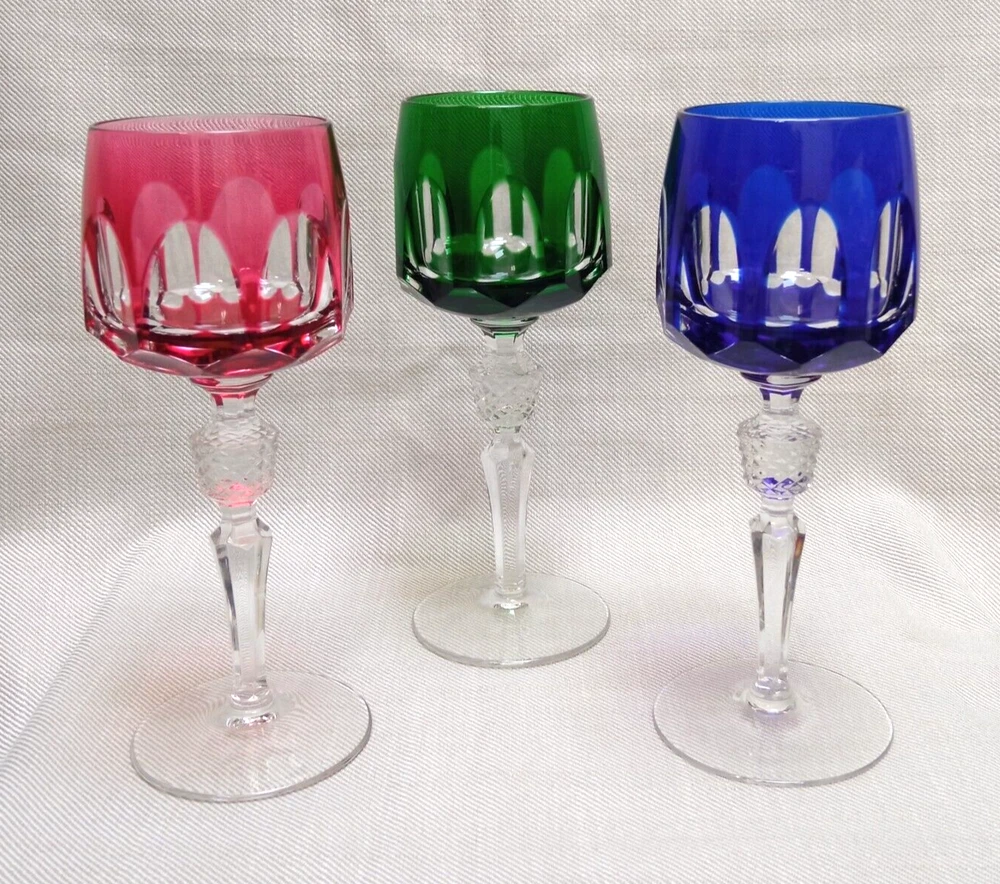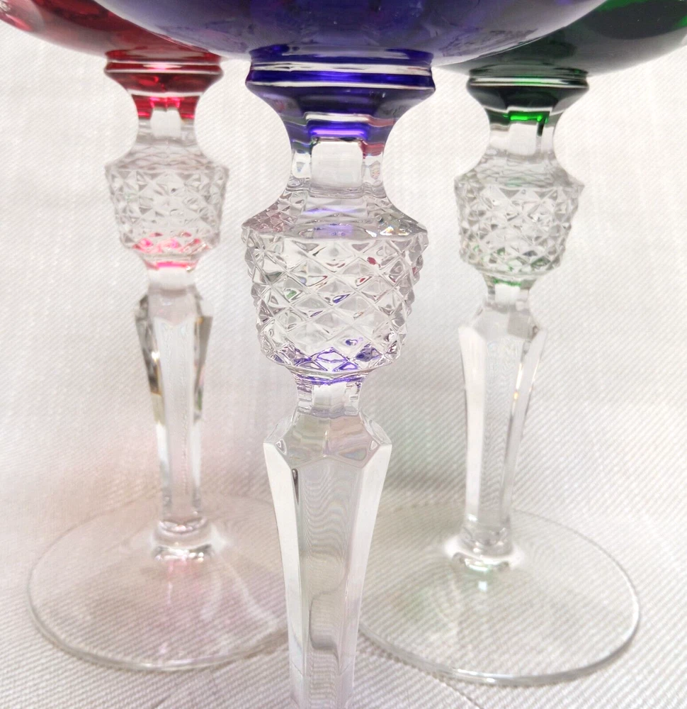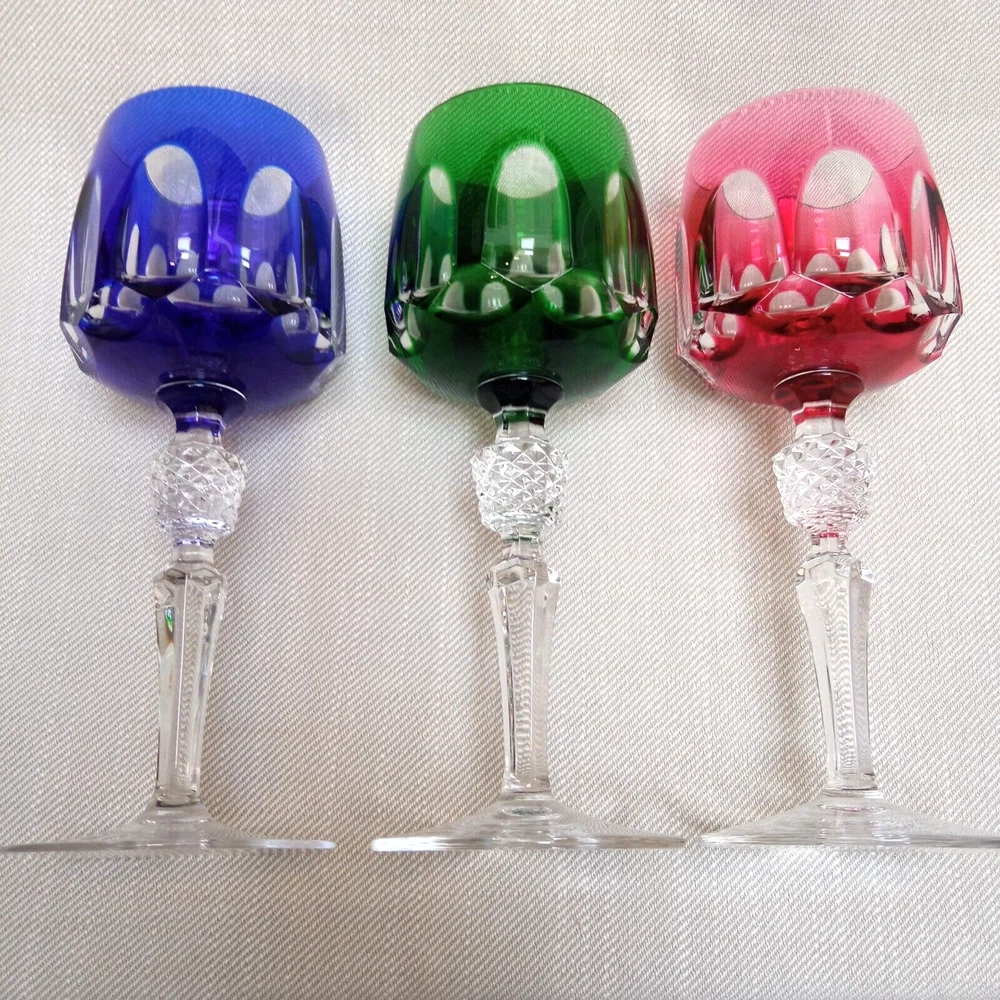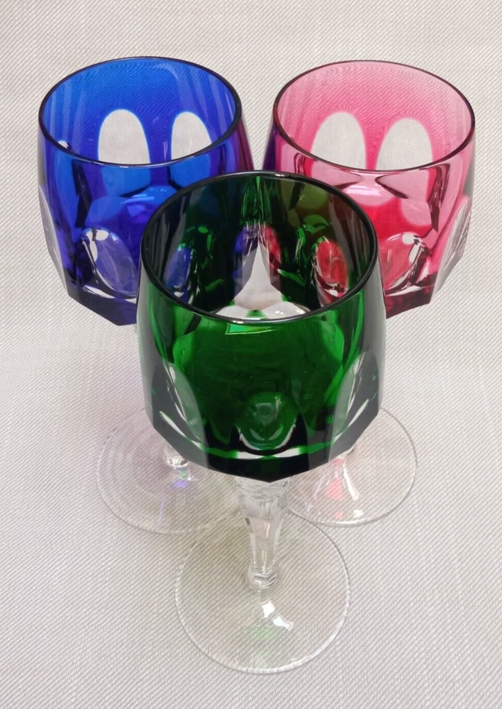 The product is a set of 3 vintage Nachtmann Antika wine glasses made of crystal, originating from Germany. Each glass features a unique multicolor overlay design, making them visually appealing and distinctive. These wine glasses are signed by Nachtmann, ensuring their authenticity and quality. Perfect for wine enthusiasts looking to add a touch of elegance and sophistication to their glassware collection, these glasses are a beautiful blend of craftsmanship and style.