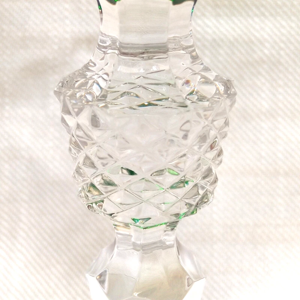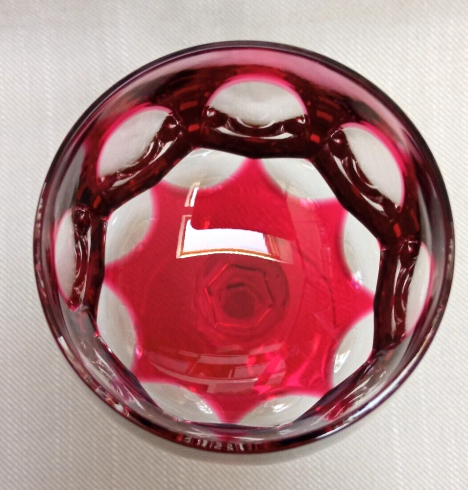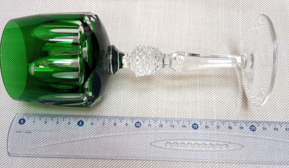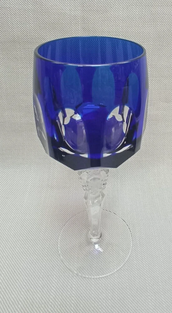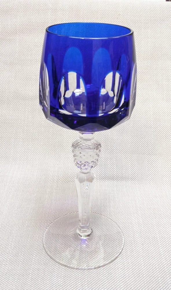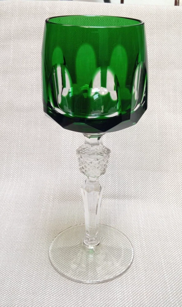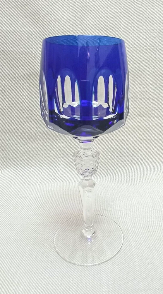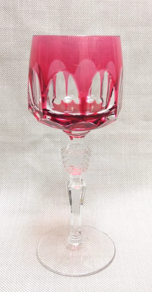 The product is a set of 3 vintage Nachtmann Antika wine glasses made of crystal, originating from Germany. Each glass features a unique multicolor overlay design, making them visually appealing and distinctive. These wine glasses are signed by Nachtmann, ensuring their authenticity and quality. Perfect for wine enthusiasts looking to add a touch of elegance and sophistication to their glassware collection, these glasses are a beautiful blend of craftsmanship and style.