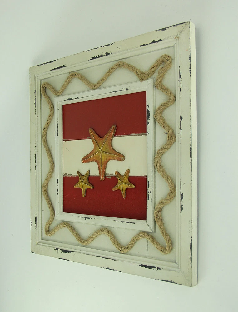 Add a touch of rustic coastal flair to your decor with this beautiful set of 3 wooden wall hangings. Each 18.25-inch square wall hanging features a nautical flag backdrop, with seashell and seahorse embellishments in the center. They have a weathered whitewash finish and natural rope accents around the frame. They have swivel hangers on the backs, so they're easy to mount on your wall. Our eBay Store About Us Add to Favorite Sellers Set of 3 Rustic Coastal Nautical Flag Wooden Wall Hangings OVERALL SIZE - Each Measures 18.25 Inches Square, 0.75 Inches Thick Made of Wood Weathered Whitewash Finish Polyresin Embellishments Adds a Rustic Coastal Accent To Any Decor Add a touch of rustic coastal flair to your decor with this beautiful set of 3 wooden wall hangings. Each 18.25-inch square wall hanging features a nautical flag backdrop, with seashell and seahorse embellishments in the center. They have a weathered whitewash finish and natural rope accents around the frame. They have swivel hangers on the backs, so they're easy to mount on your wall. Product Details Color Multicolored Height 18.25 Length 18.25 Weight 12.9 LB