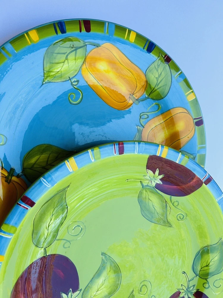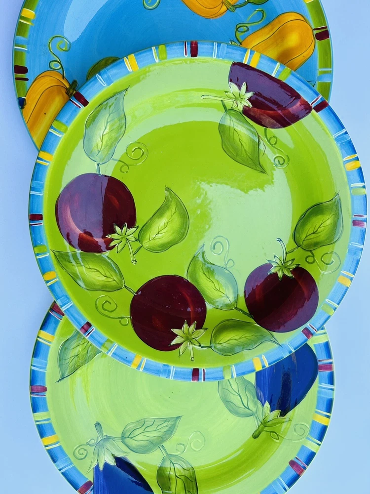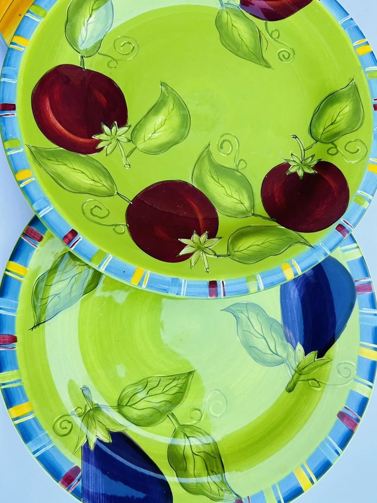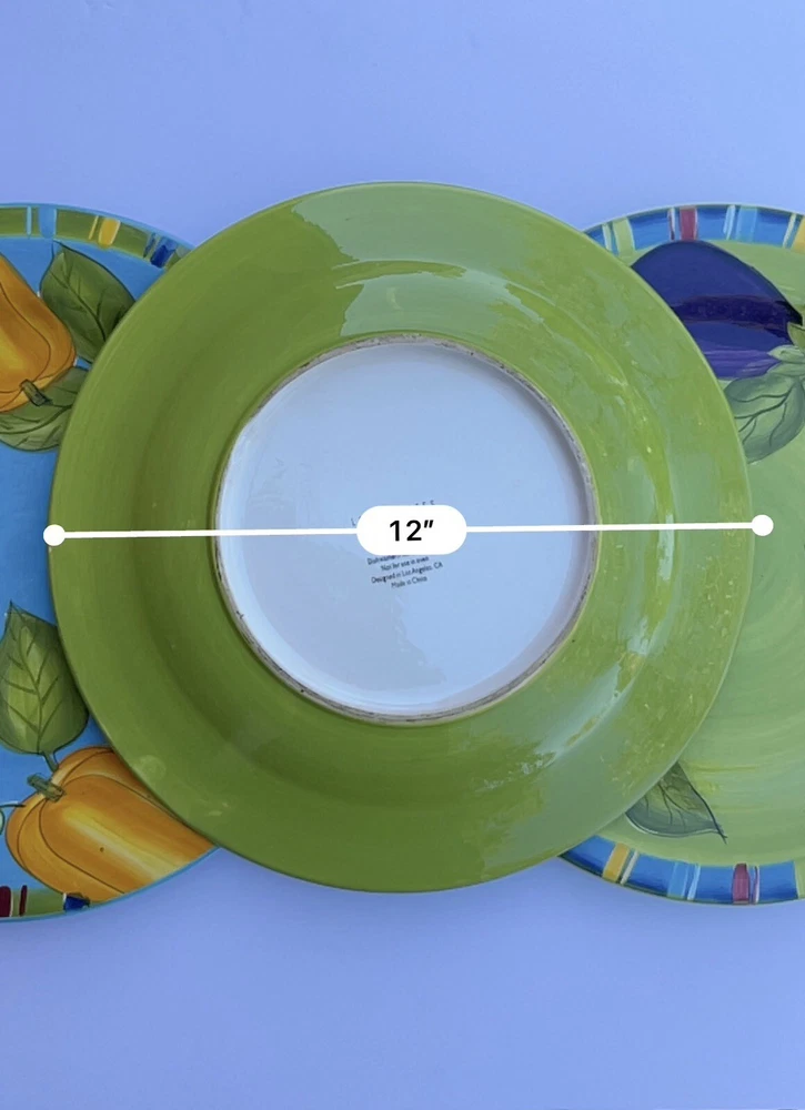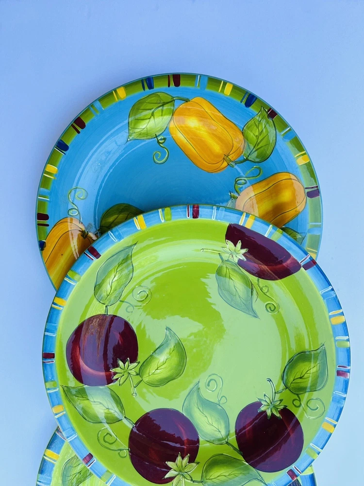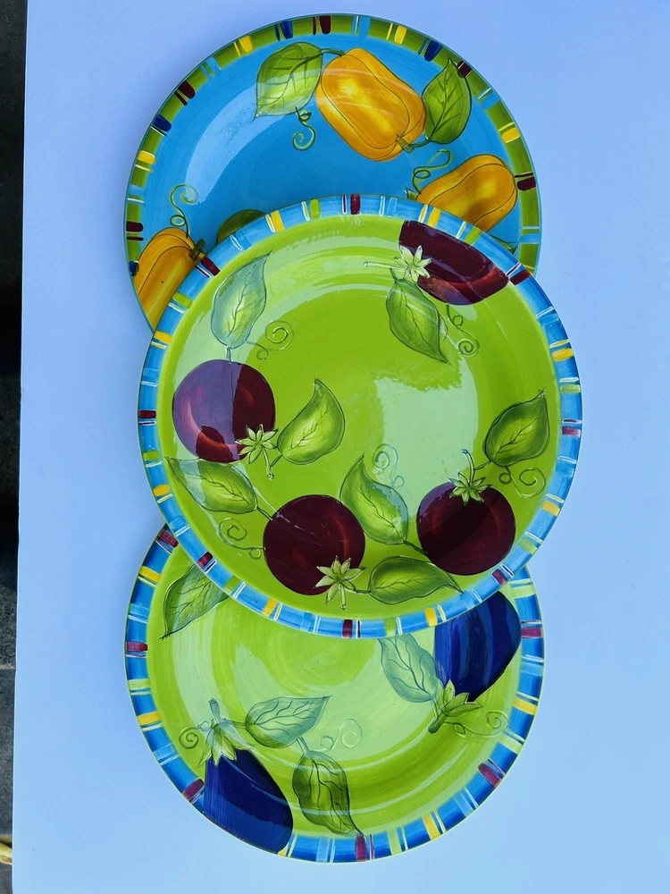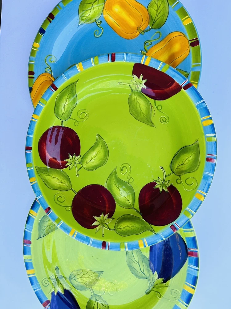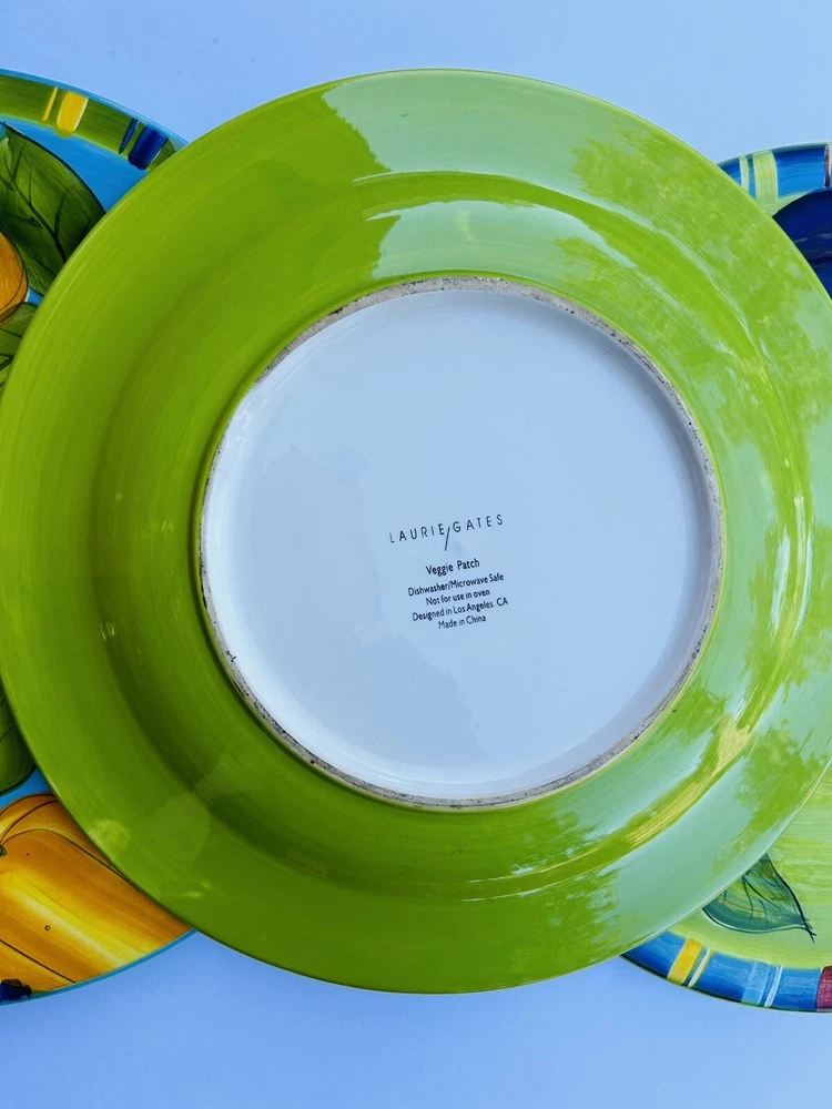 This set of 3 large chop plates by Laurie Gates is a must-have for any kitchen. The plates are perfect for serving vegetables, fruits, and other dishes, and their charming design will surely impress your guests. Made of high-quality materials, these plates are durable and long-lasting, ensuring that you can enjoy them for years to come. The set includes 3 plates, each featuring a unique veggie patch design, making them a great addition to any dining table. Beautiful piece 9.13.24